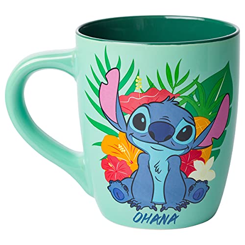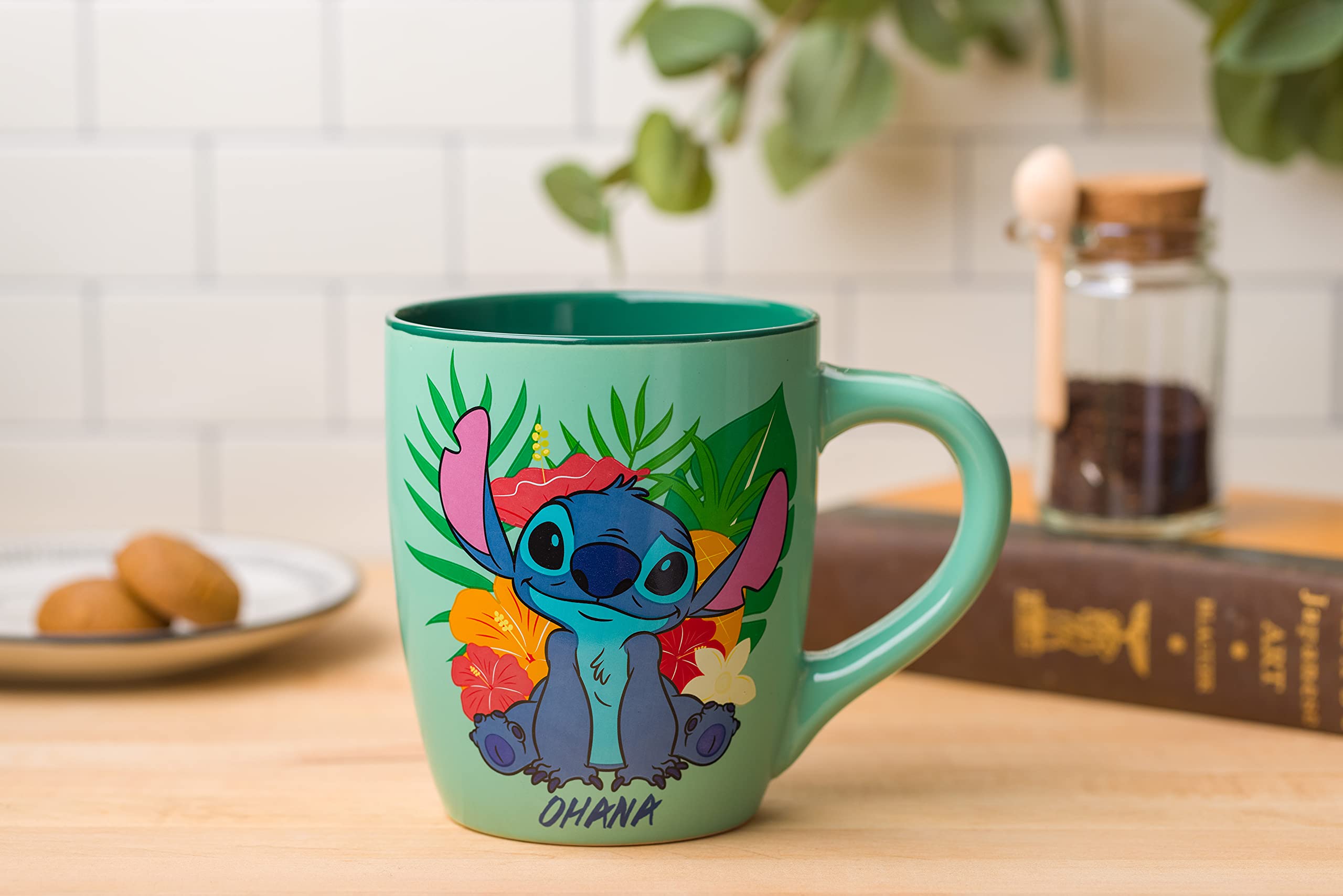 OVERSIZED COFFEE MUG: Our extra-large ceramic coffee mug holds 25-ounces of your favorite beverage, Show off your love of Lilo and Stitch with this adorable Jumbo Ceramic Mug with Stitch sitting amongst tropical flowers