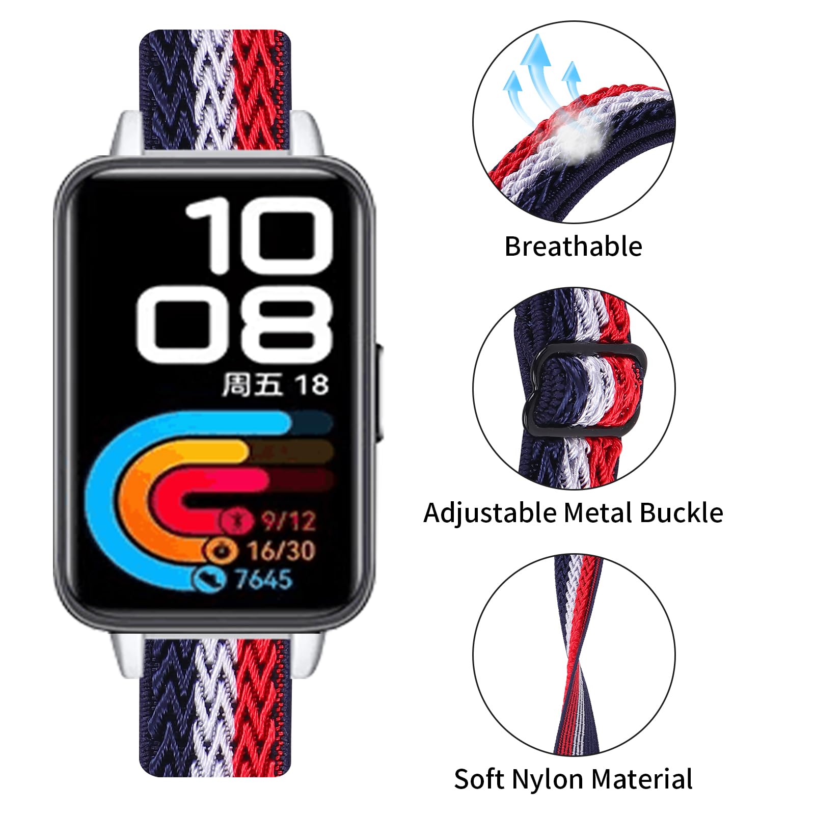 Description Compatible Models: Compatible with Huawei Band 10 Compatible with Huawei Band 9 Compatible with Huawei Band 8 Super Comfortable Material Made of superior braided nylon material, lightweight, breathable, comfortable and durable, definitely brings the most comfortable wearing experience ever for you! 15 Various Colors Up to 15 rich colors and patterns for this wrist strap, stand out your different fashion personality and charm What You Get: 1x Nylon Watch Strap