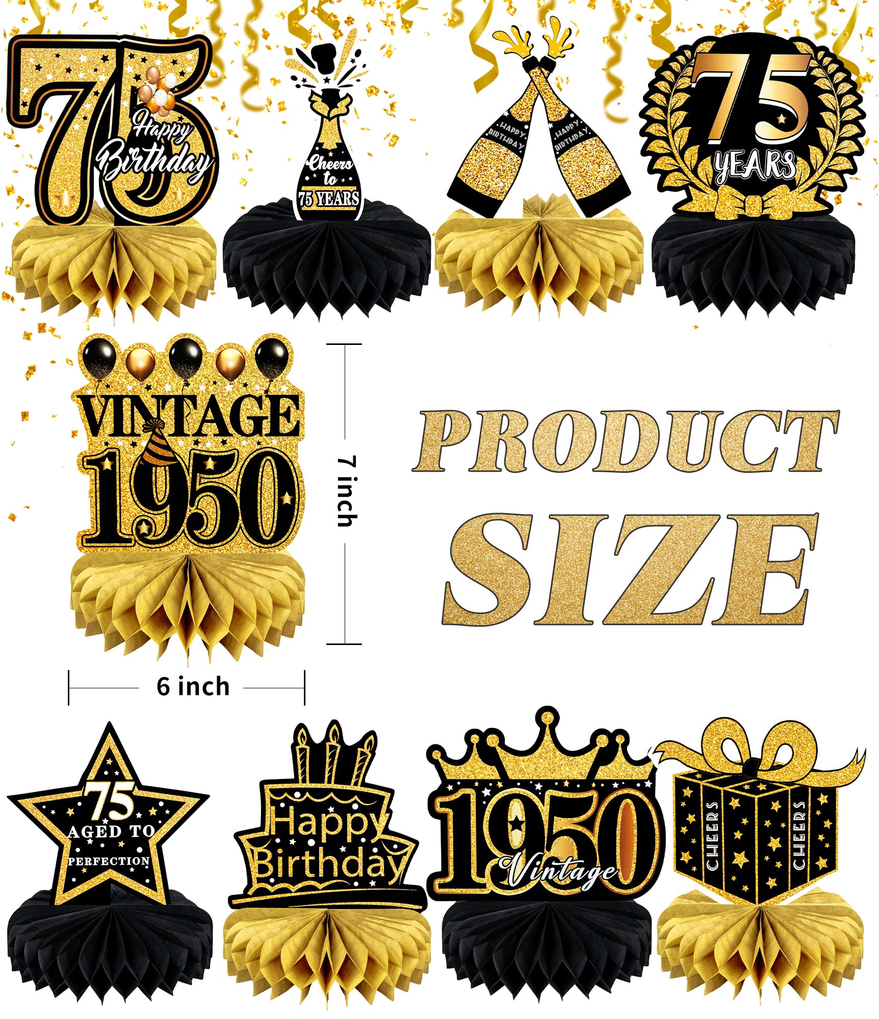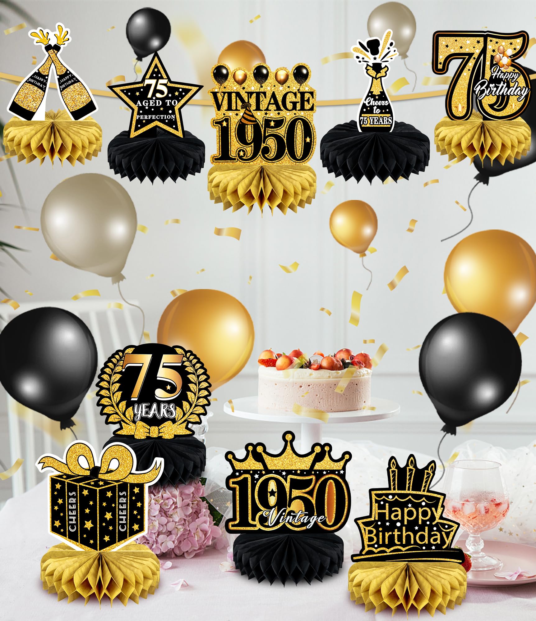 💖75th BIRTHDAY PACKAGE INCLUDES: Our 75th birthday decorations including 9 patterned cardboard and 9 paper honeycombs. These decorations exquisitely designed with interesting birthday elements. It is very suitable as a decoration for your 75th birthday party favor supplies, you can place it on the table or hang it with a clip