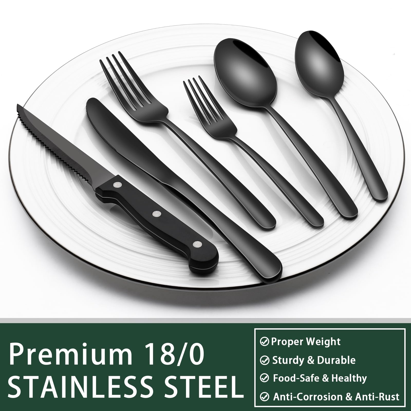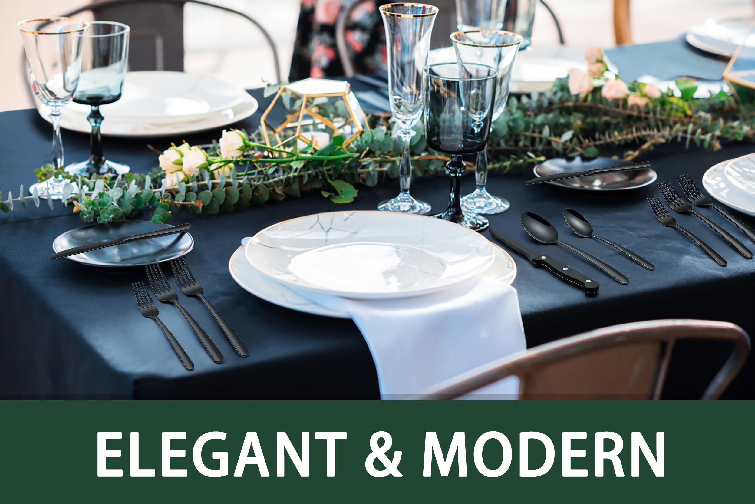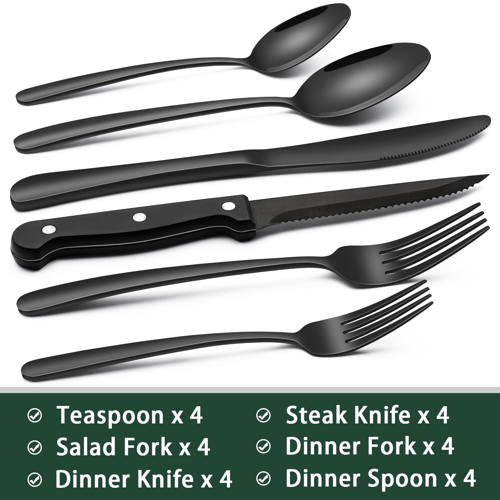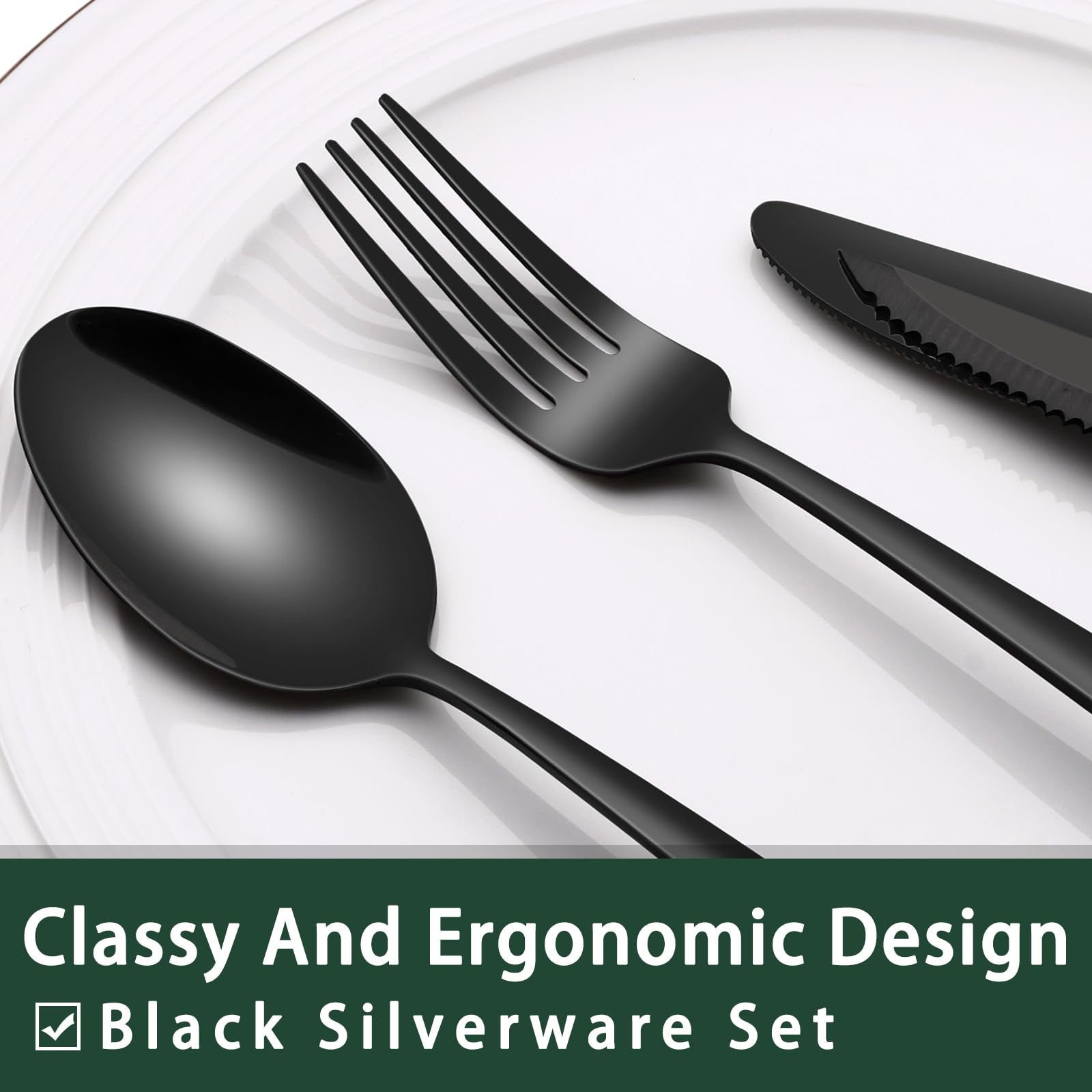 COMFORTABLE DESIGN: This flatware set has a classic silhouette with clean lines and polish-finish surface in all black, a good choice to go with your existing tableware. The smooth edge of the handle is pleasure to hold, appropriate weight and perfect balance are added to ensure maximum comfort during use.