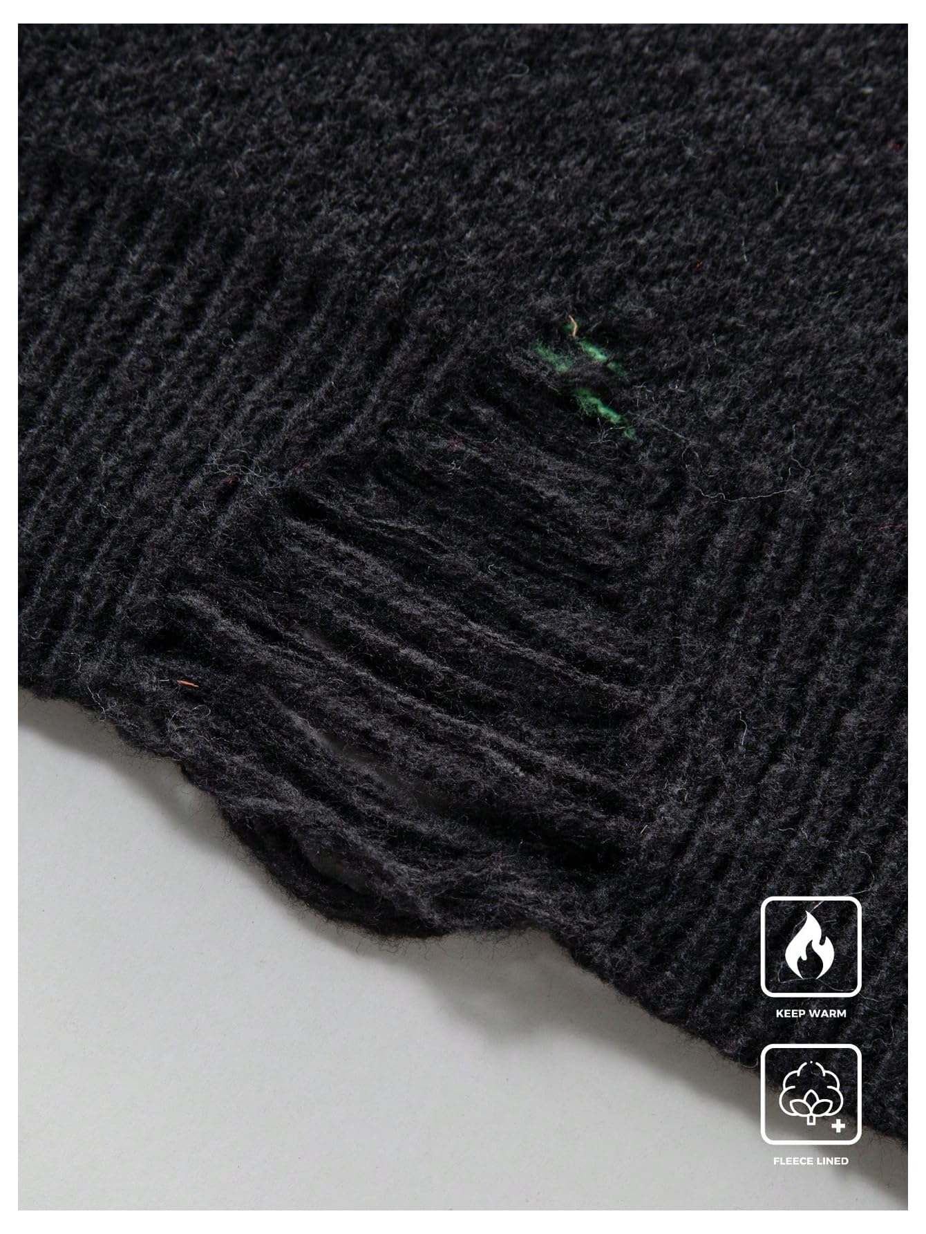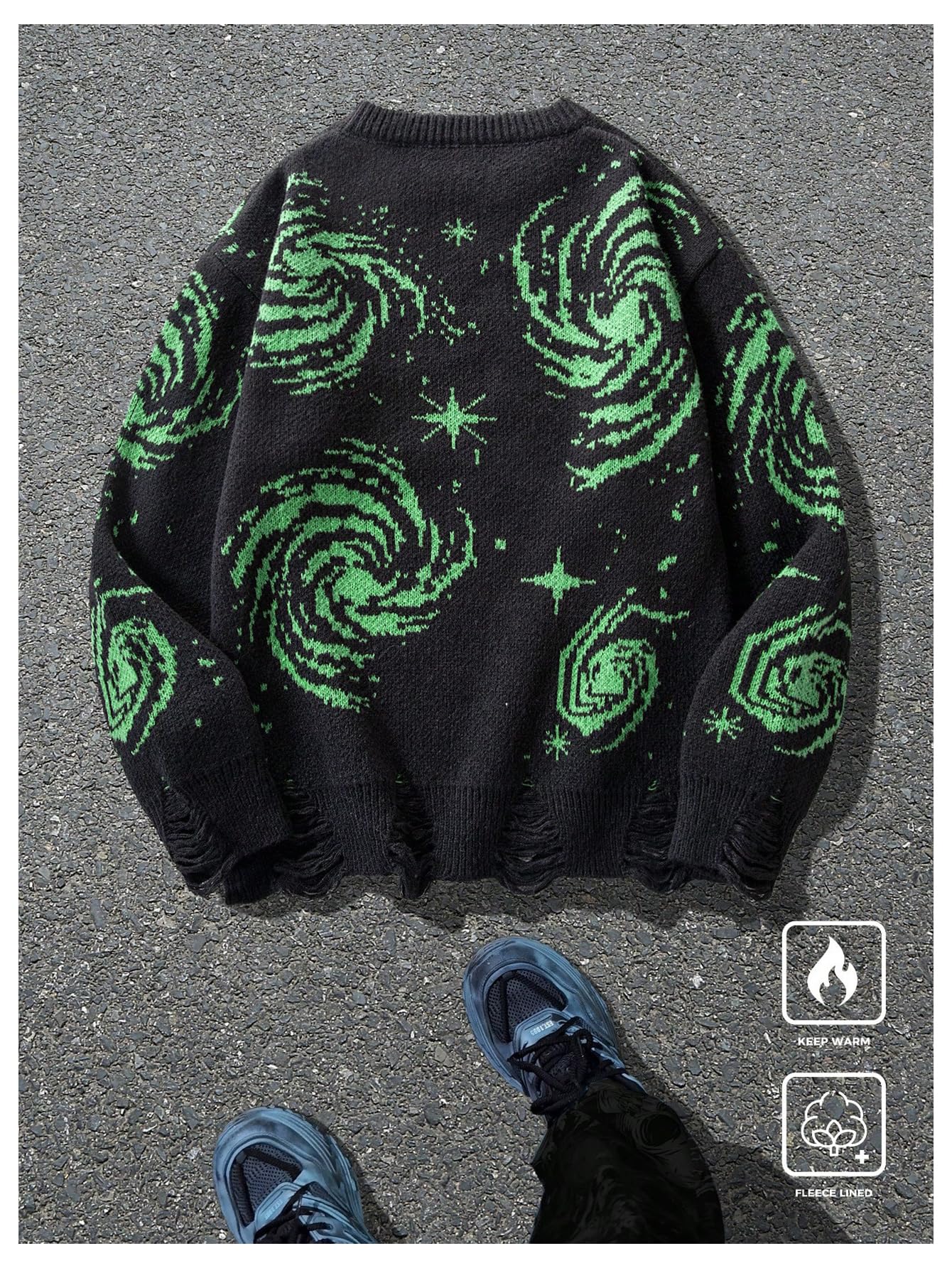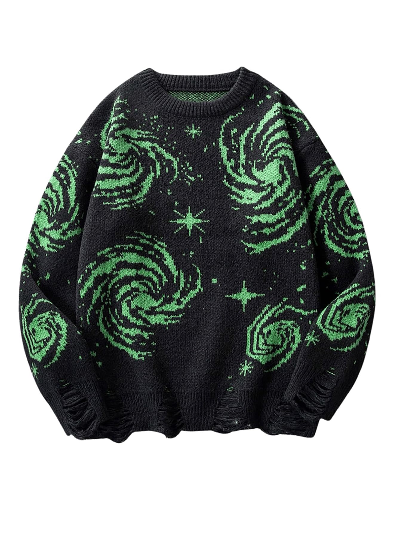 Features: Starry night pattern, distressed holes, drop shoulder, crewneck, long sleeve, ripped, regular fit, casual sweater for men