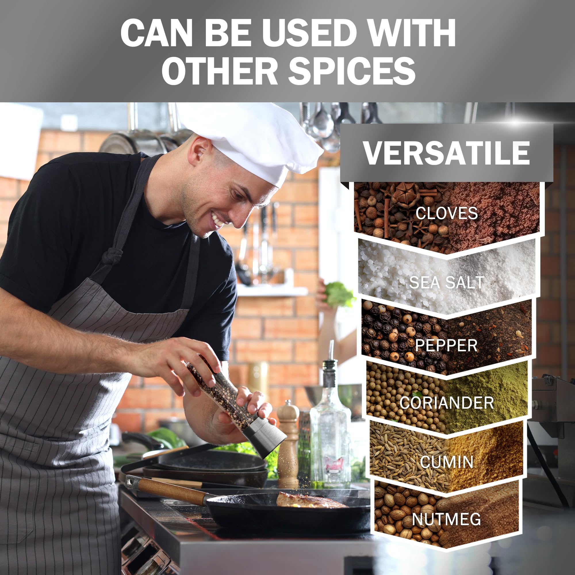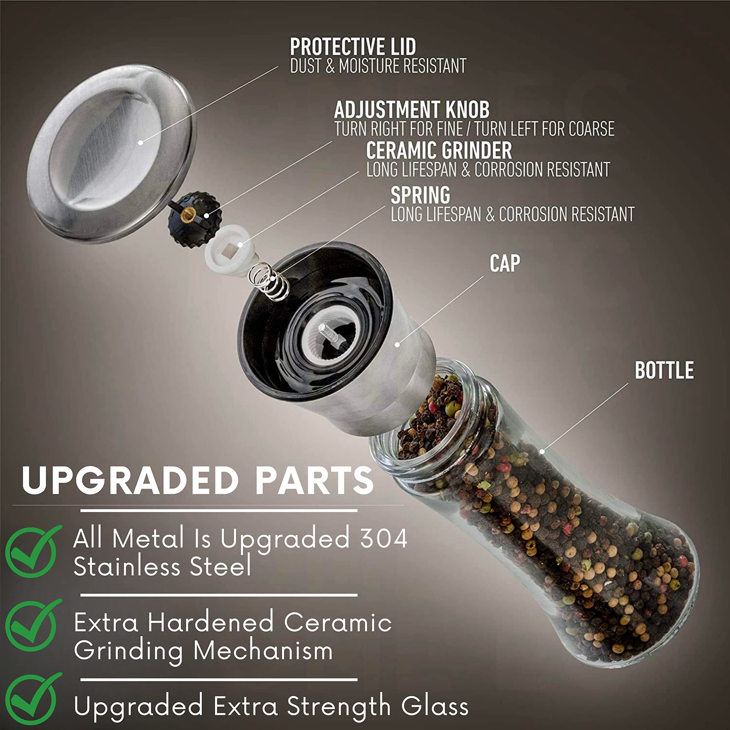 High Quality Glass - Brushed Stainless Steel Salt and Pepper Mill Set : Home EC Salt and Pepper Mills are easy to grip and made of the highest grade non-corrosive, brushed Stainless Steel, and BPA Free glass bottle. This salt grinder and pepper grinder set is a modern, classy and user friendly addition to your kitchen accessories. Perfect for a gourmet meal or dinner party. Great gift or party favor! *Salt and Pepper Not Included.