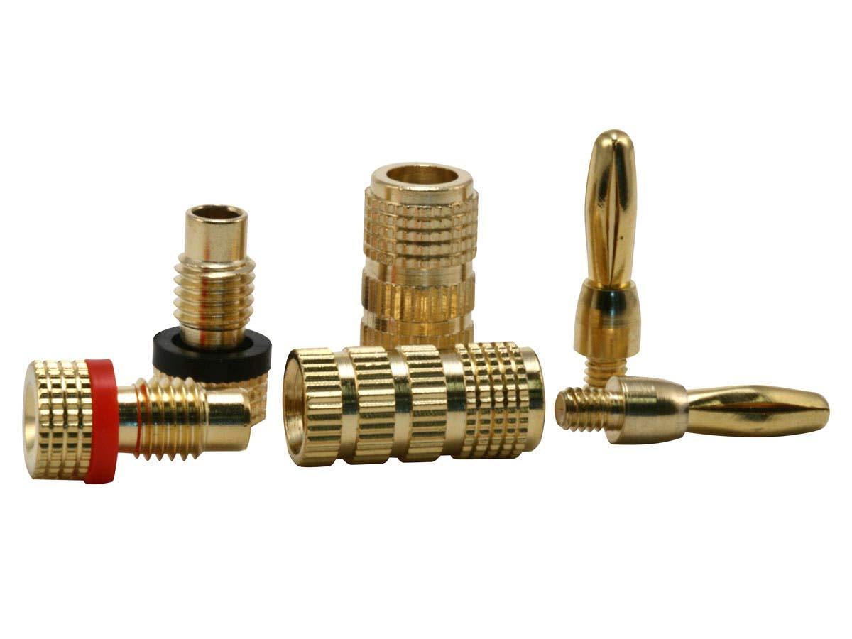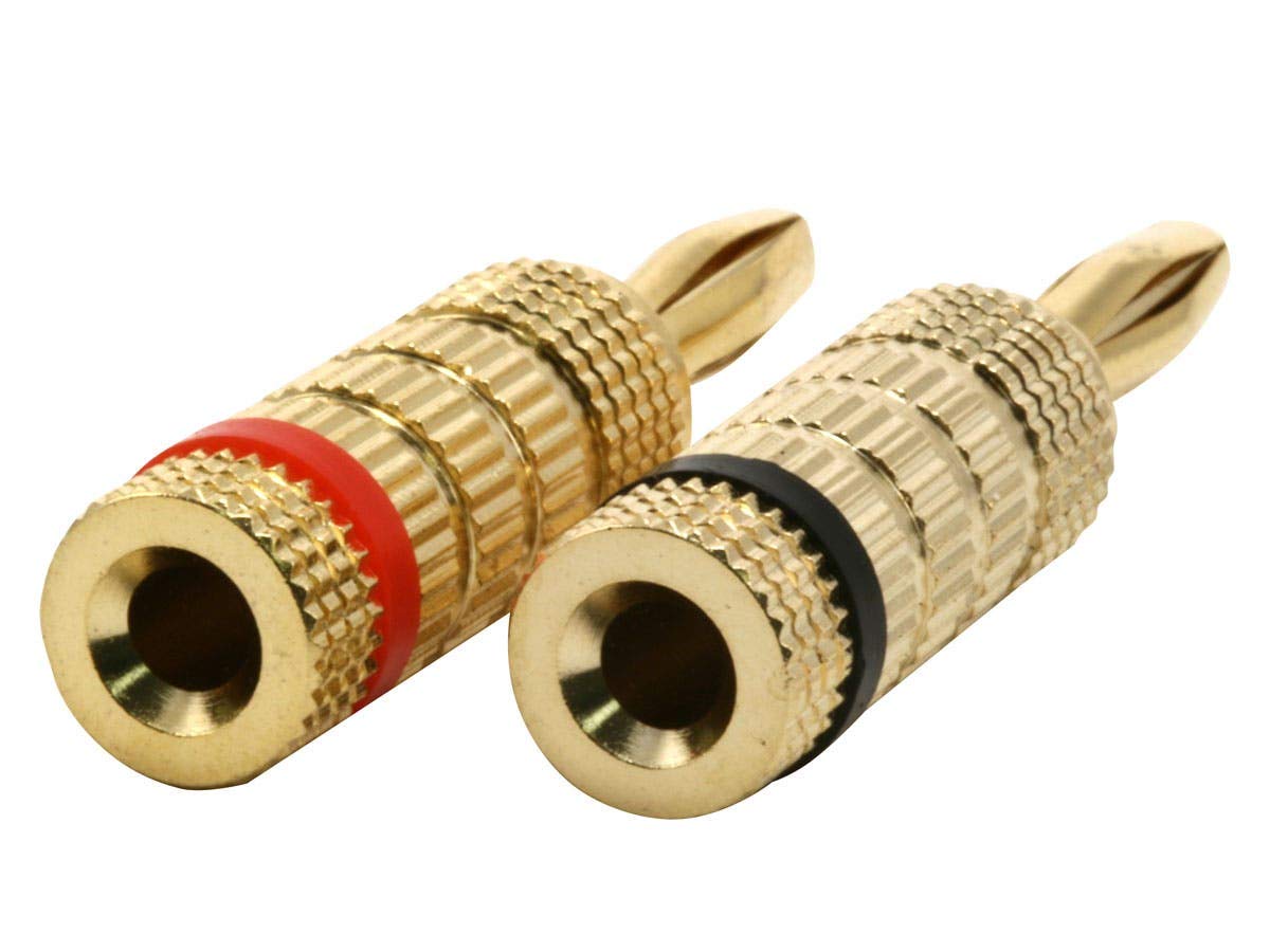 Banana plugs make speaker installation a breeze. They are designed for use with amplifiers or speakers that use traditional binding posts. Not only is it easier to make the connection on the back of your amp, it is safer, with no chance of stray wire strands creating a short across contacts. These high quality plugs are the closed screw type and can accept bare wire or spades. They are sized to fit speaker wire from 12 to 18 AWG. Each pair comes with one plug color coded red and the other coded black, for easy polarity identification. The plug body is made of brass, which is then plated with gold to help prevent corrosion and ensure smooth connections.