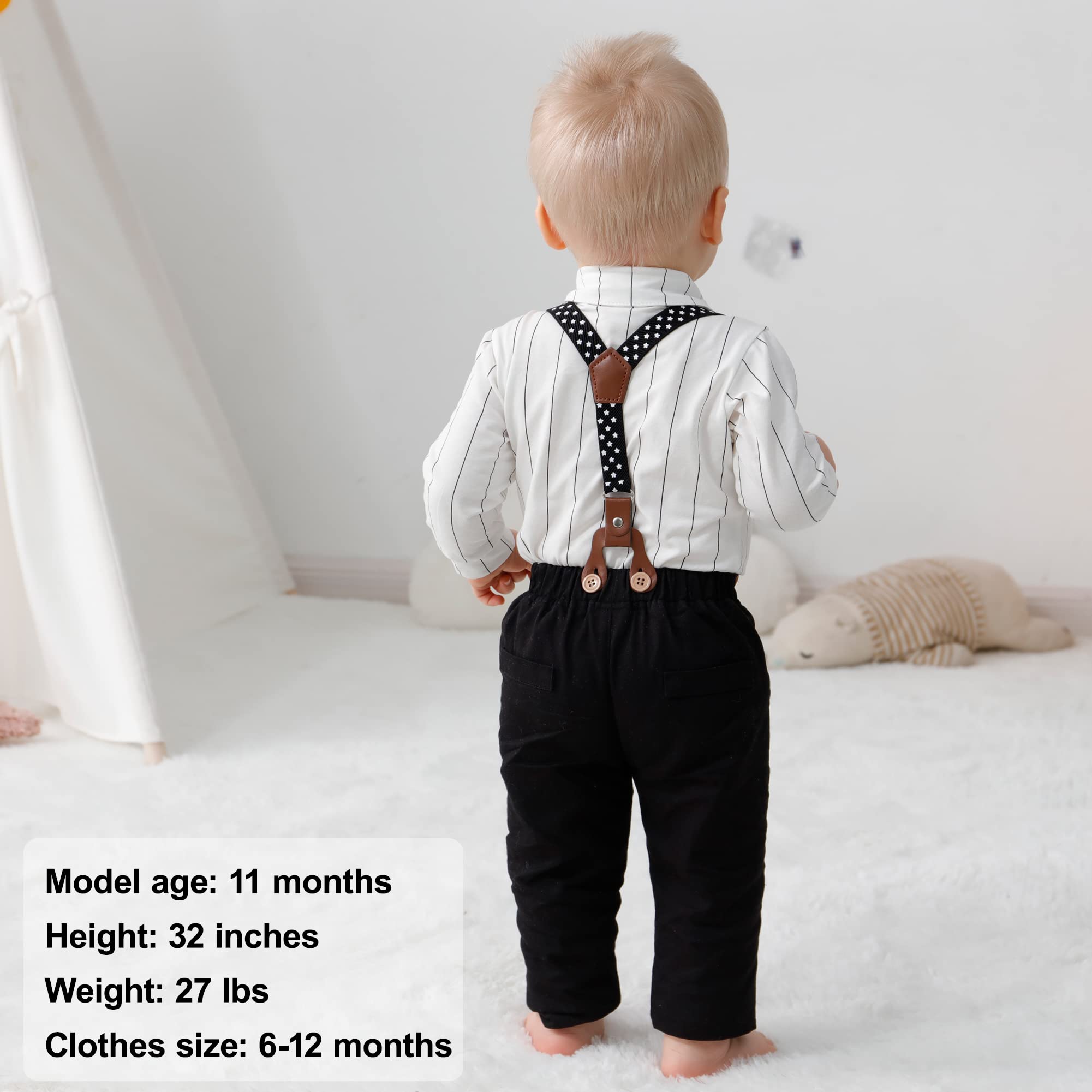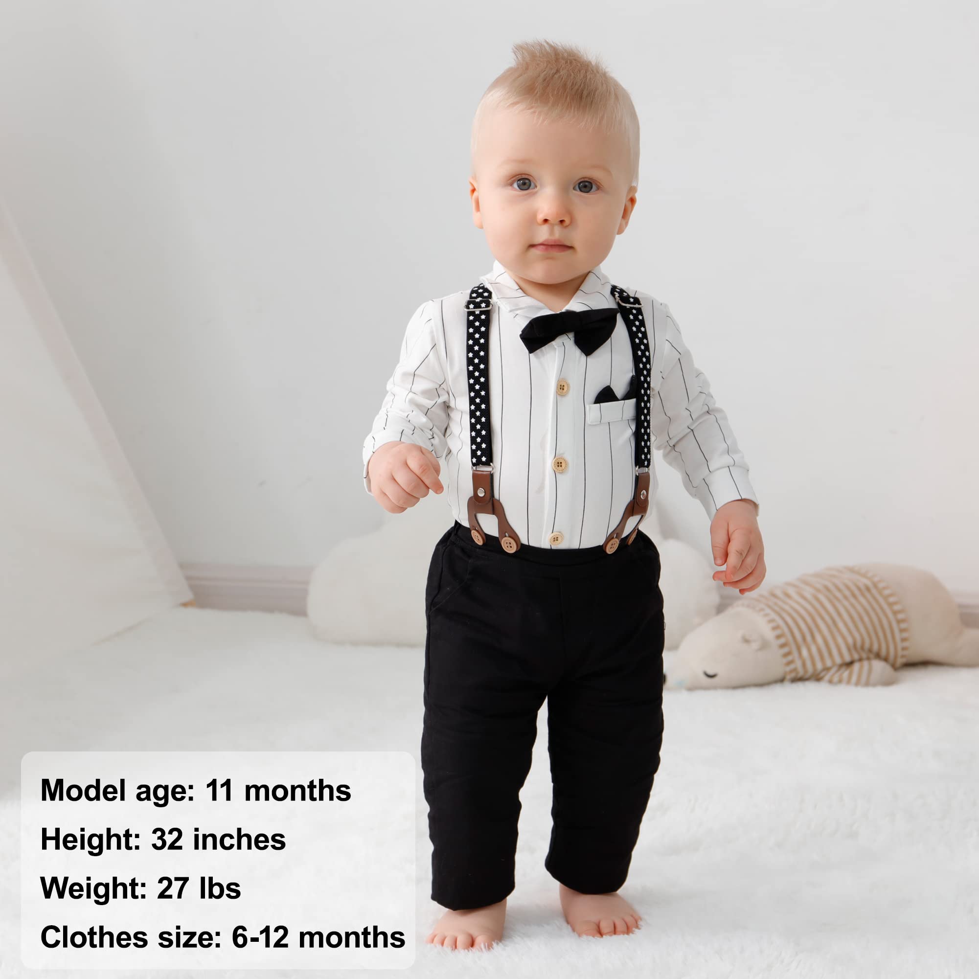 Size: The cute baby boy suit have 4 sizes, newborn baby boy 0-3 months, baby boy suit 3-6 months, baby boys gentleman clothes 6-12 months, boys tuxedo suit 12-18 months.