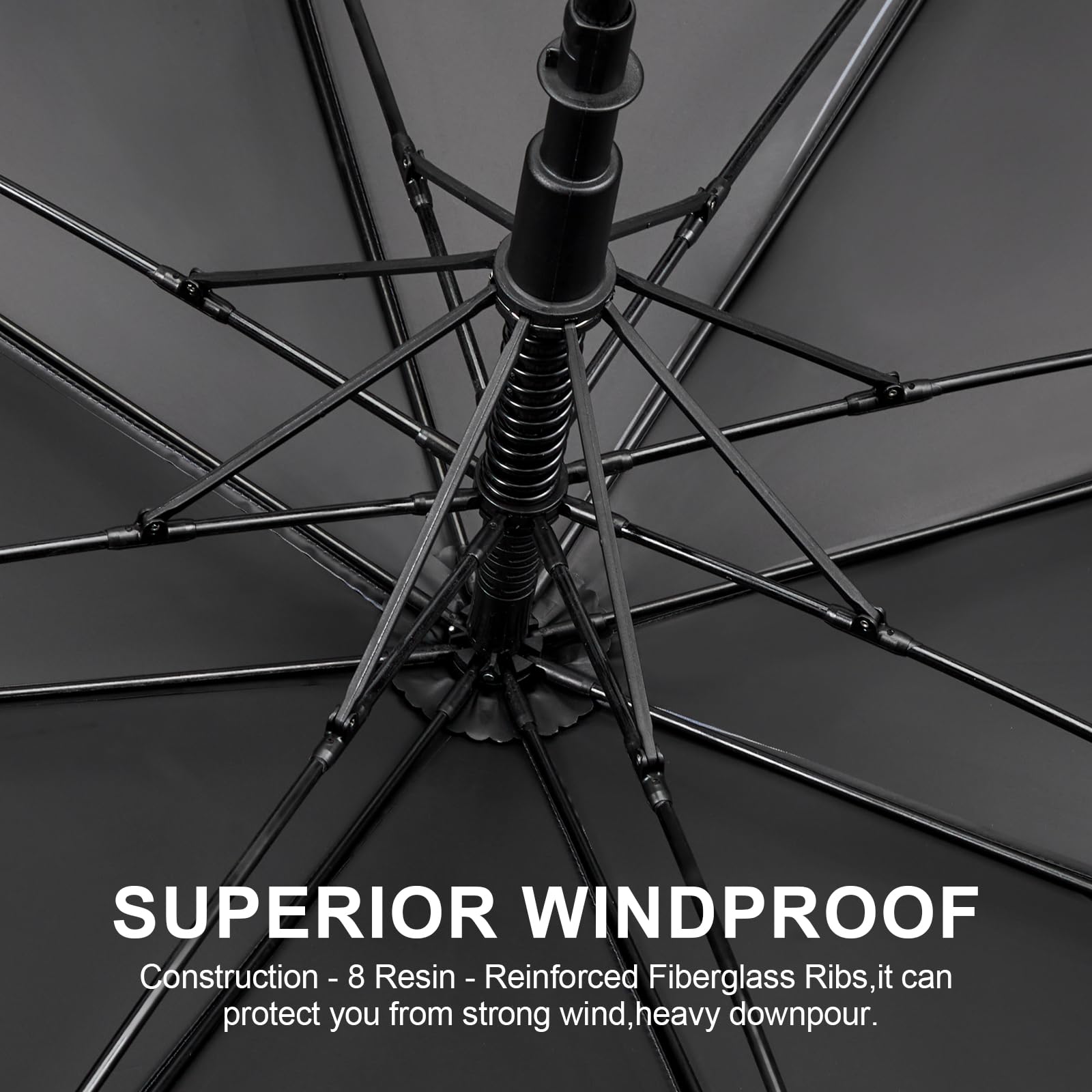 Strong Windproof. Reinforced durable fiberglass frame, 8 ribs construction, and double-canopy venting system for the wind to pass out, which prevents this sturdy umbrella from inverting during high winds; This windproof umbrella is built to protect from sun, rain, hail, snow, and sleet.
