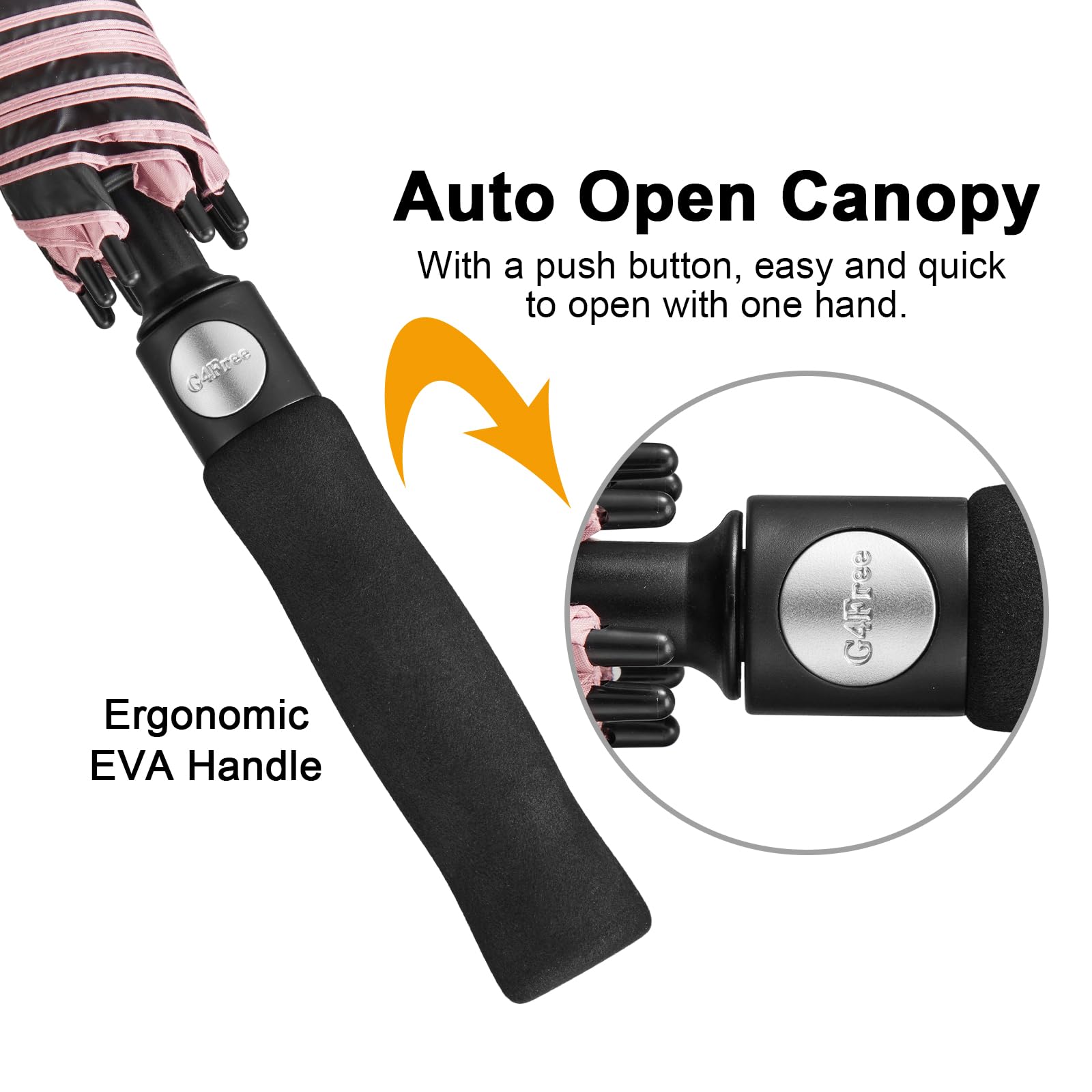 Auto-Open. The automatic umbrella opens with just one click of a button located on the ergonomic EVA grip handle. Umbrella comes with a matching shoulder strap sleeve for convenient carry and storage.
