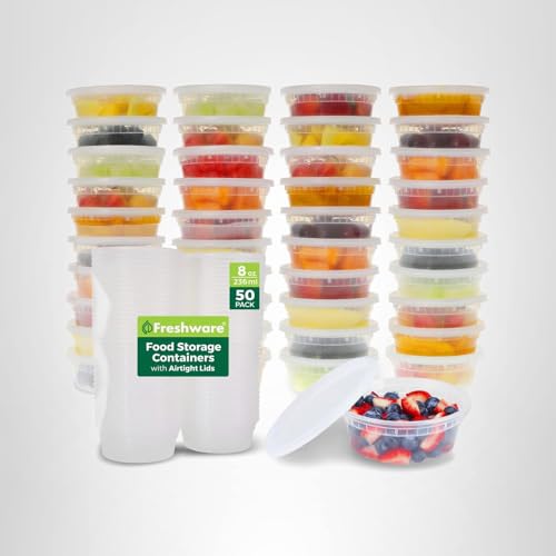 β EACH PACKAGE INCLUDES: 50 BPA free plastic food containers 8 oz. They are generous in size but not bulky at all. Carry, stack or store your food in style. These lunch containers are microwavable, freezer and dishwasher safe. Hassle free cleaning is for real.