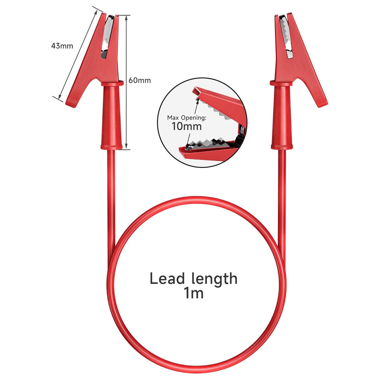 Both ends of the test leads are pure copper full insulated alligator clips. The maximum width of the crocodile clips opening is 10mm. Lead length: 3.3ft. Voltage: 1000V. Current: 15A.