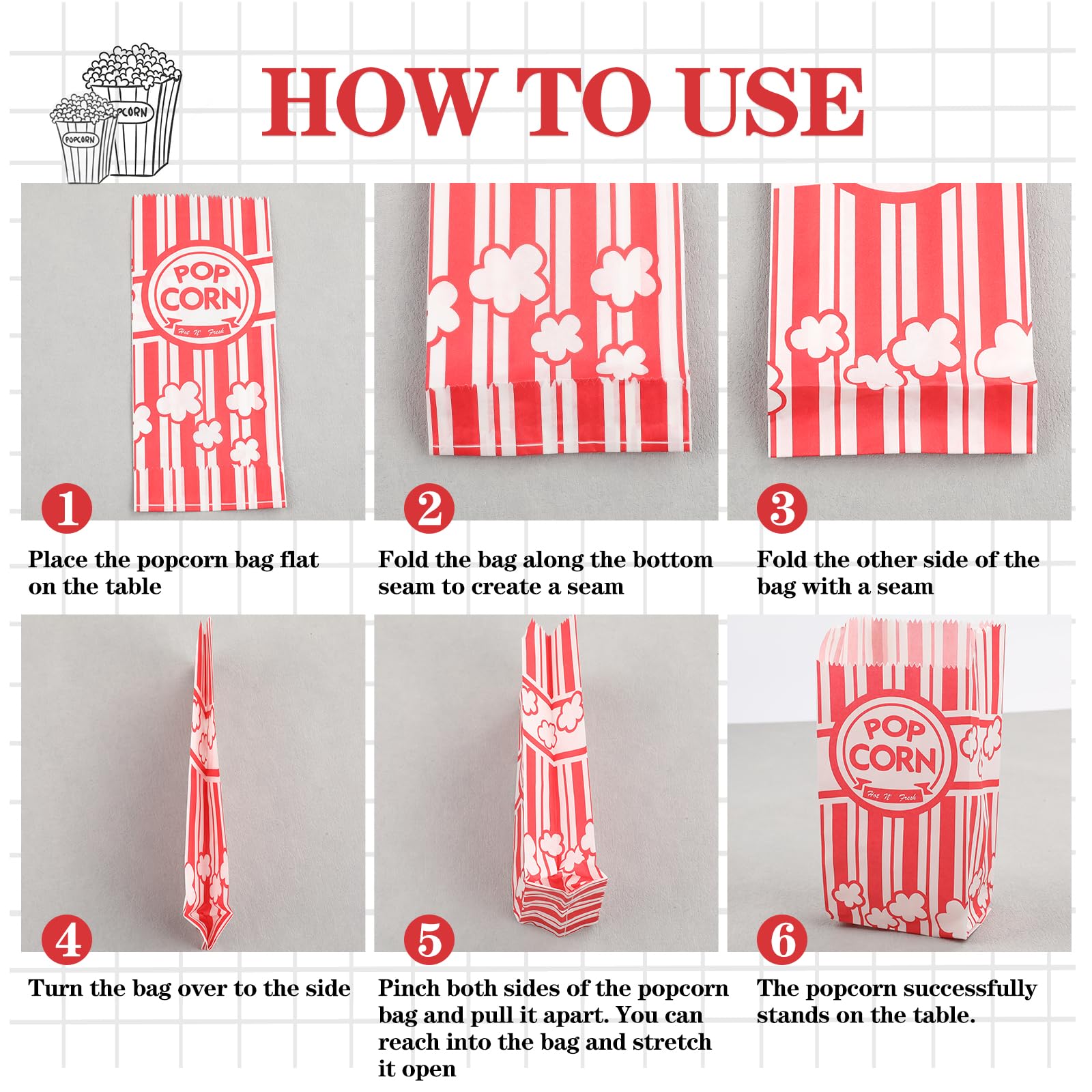 These popcorn bags boast a perfect dimension of 8.27*3.54*2.25 inches, providing ample space to hold a generous serving of popcorn. Whether you're snacking alone or sharing with friends and family, these bags are designed to accommodate your cravings with convenience and style.
