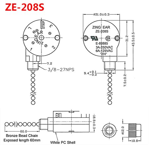 Switch electrical rating: 6A 125VAC – 3A 250VAC. Material: Plastic Shell and Brass Pull Chain.