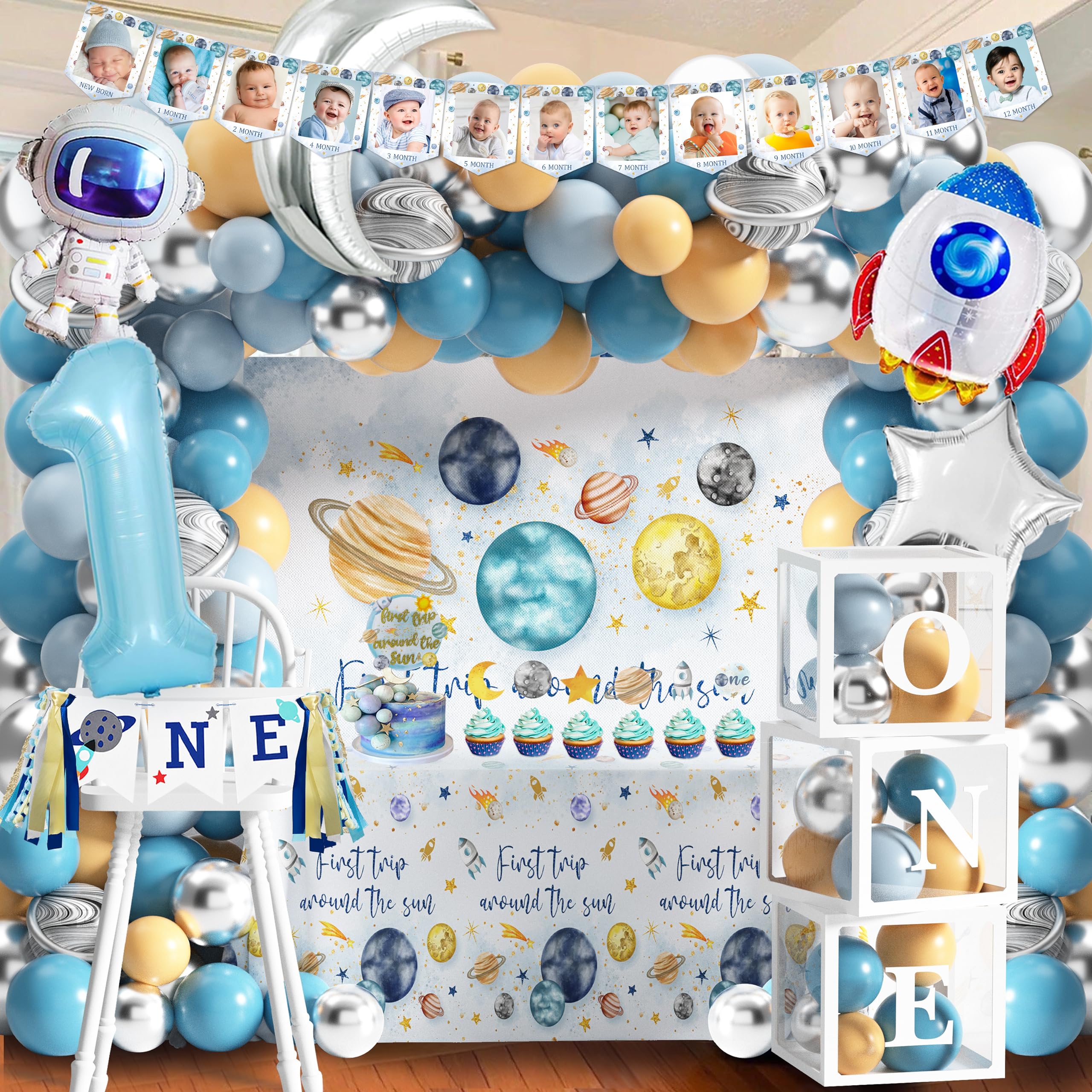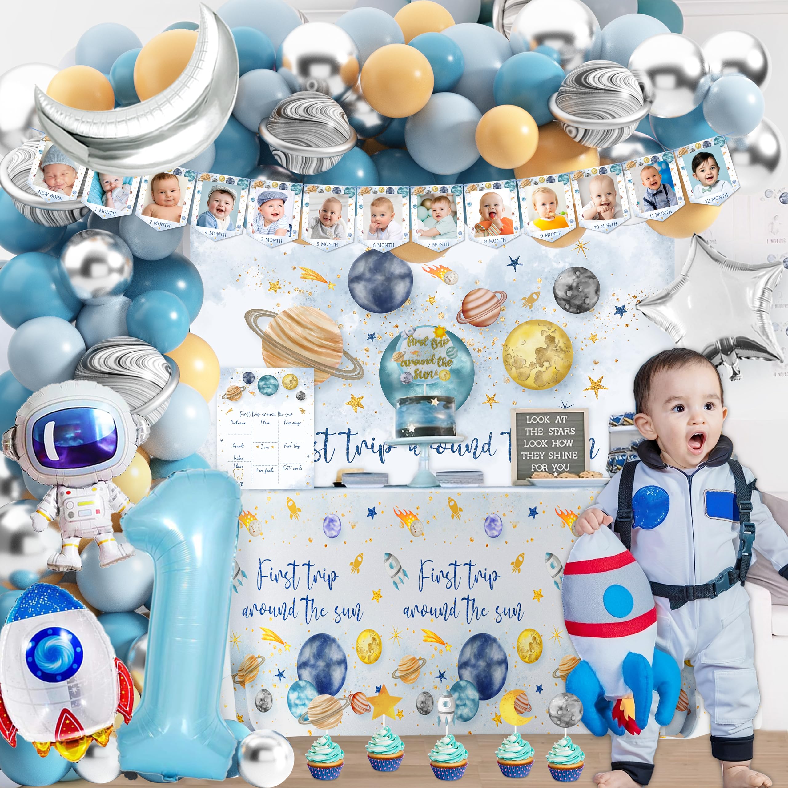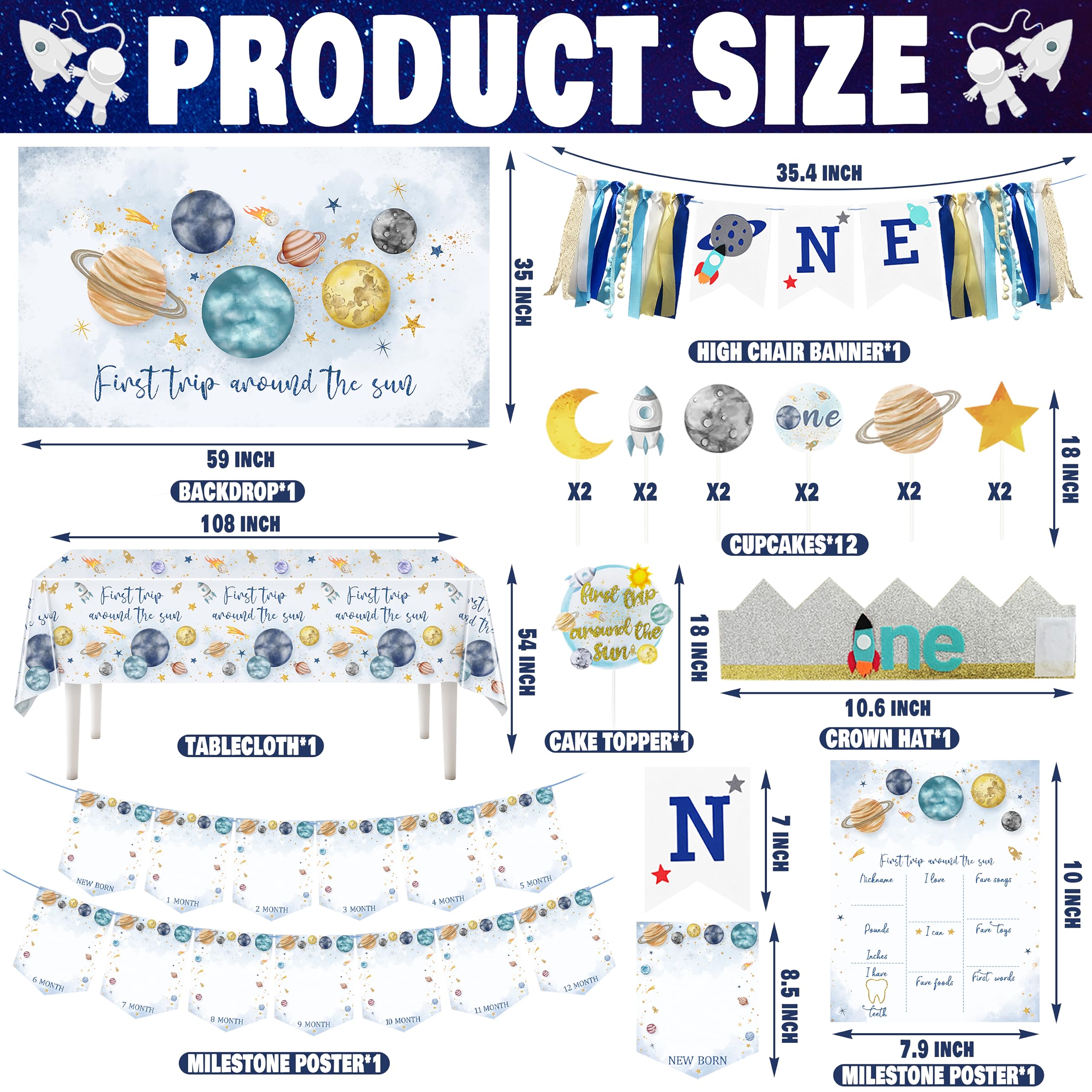 First Trip Around the Sun Birthday Party Decoration Pack: Include first trip around the sun birthday crown, 1x cake topper and 12 x cupcake toppers, 1x space party backdrop,1x sun system tablecloth, 1x highchair banner,1x photo banner, 1x milestone poster, 1 x astronaut and 1x rocket aluminum balloon, 1 x star and 1 x moon balloon, 1 x number “1” balloon, 70 x latex balloons, 3 party balloon blocks.