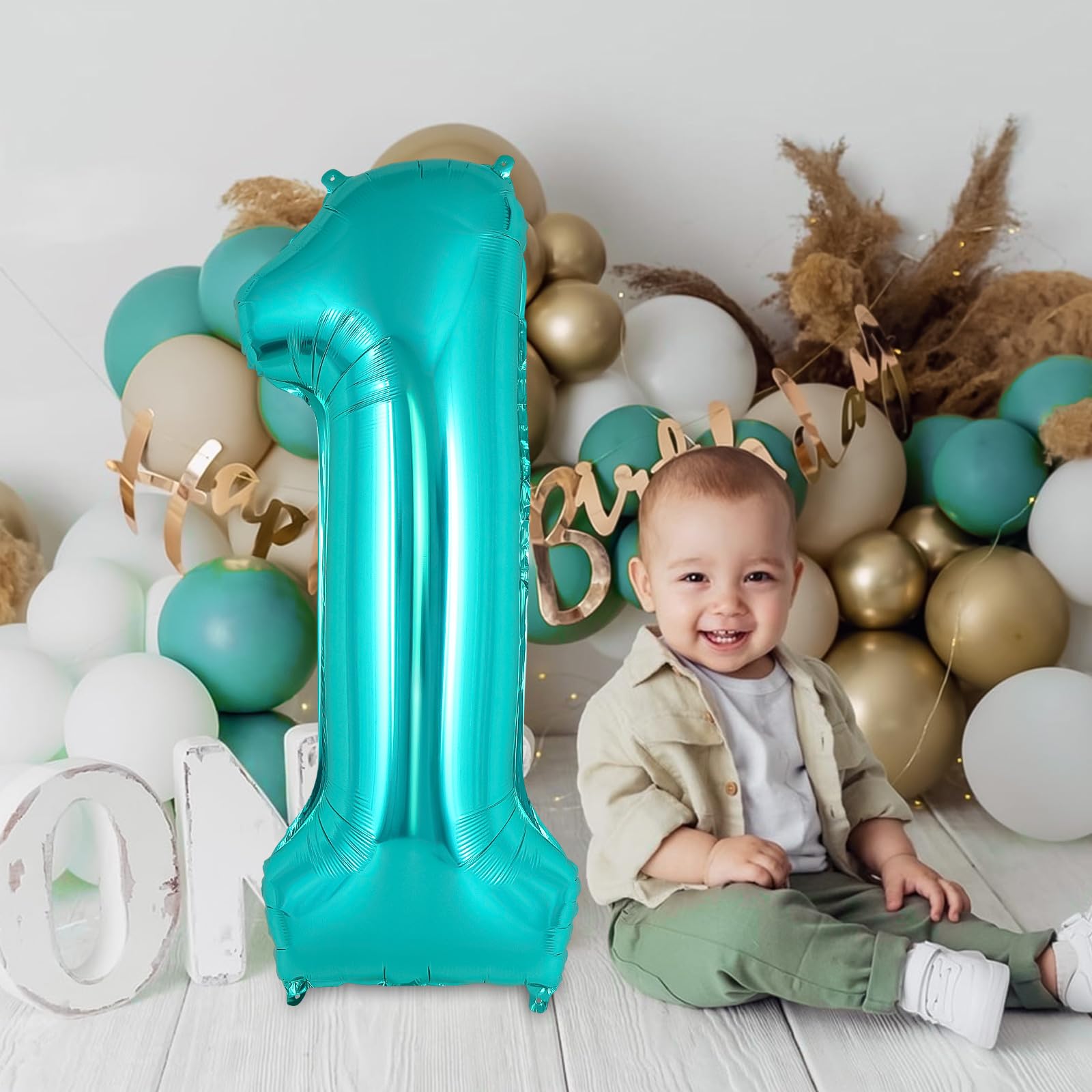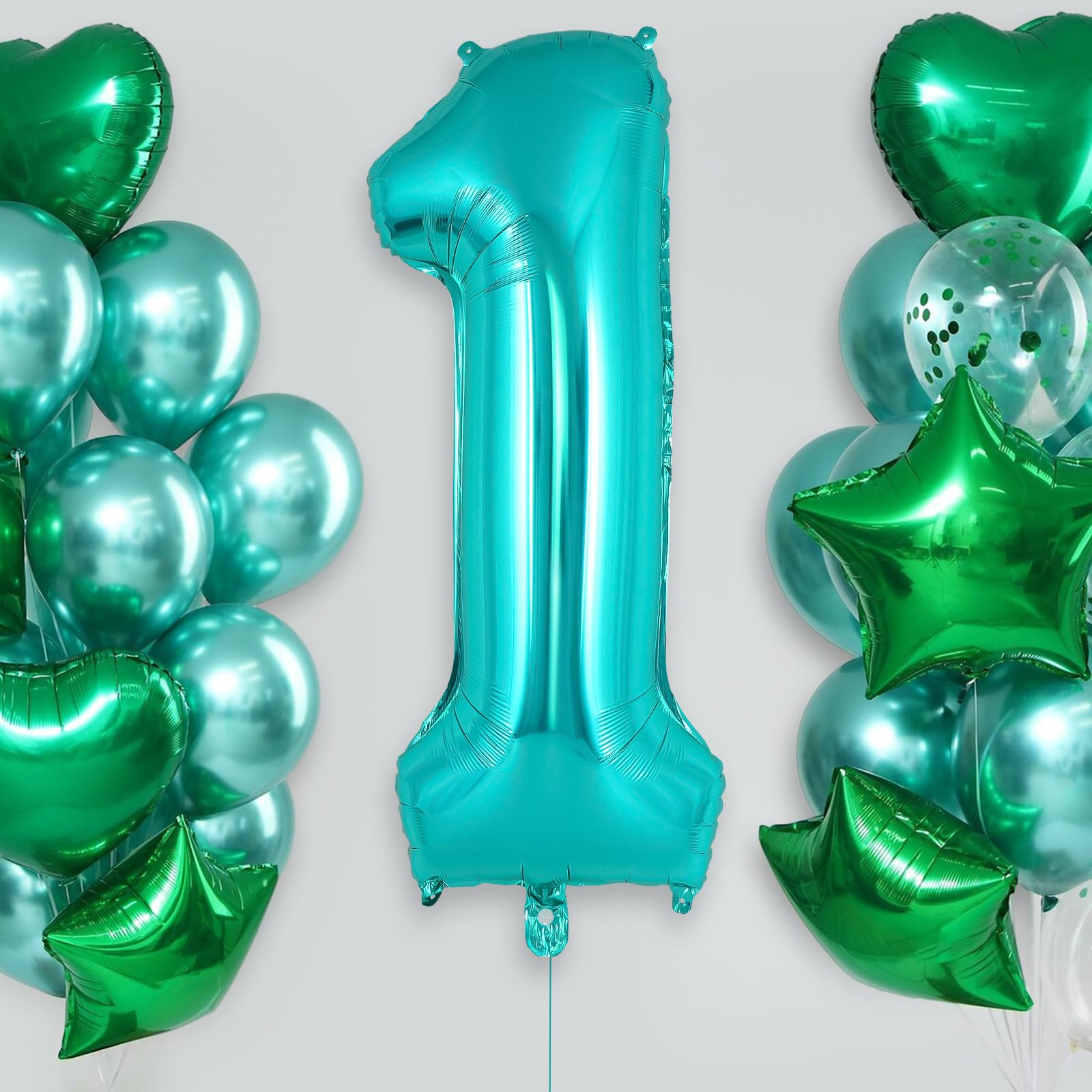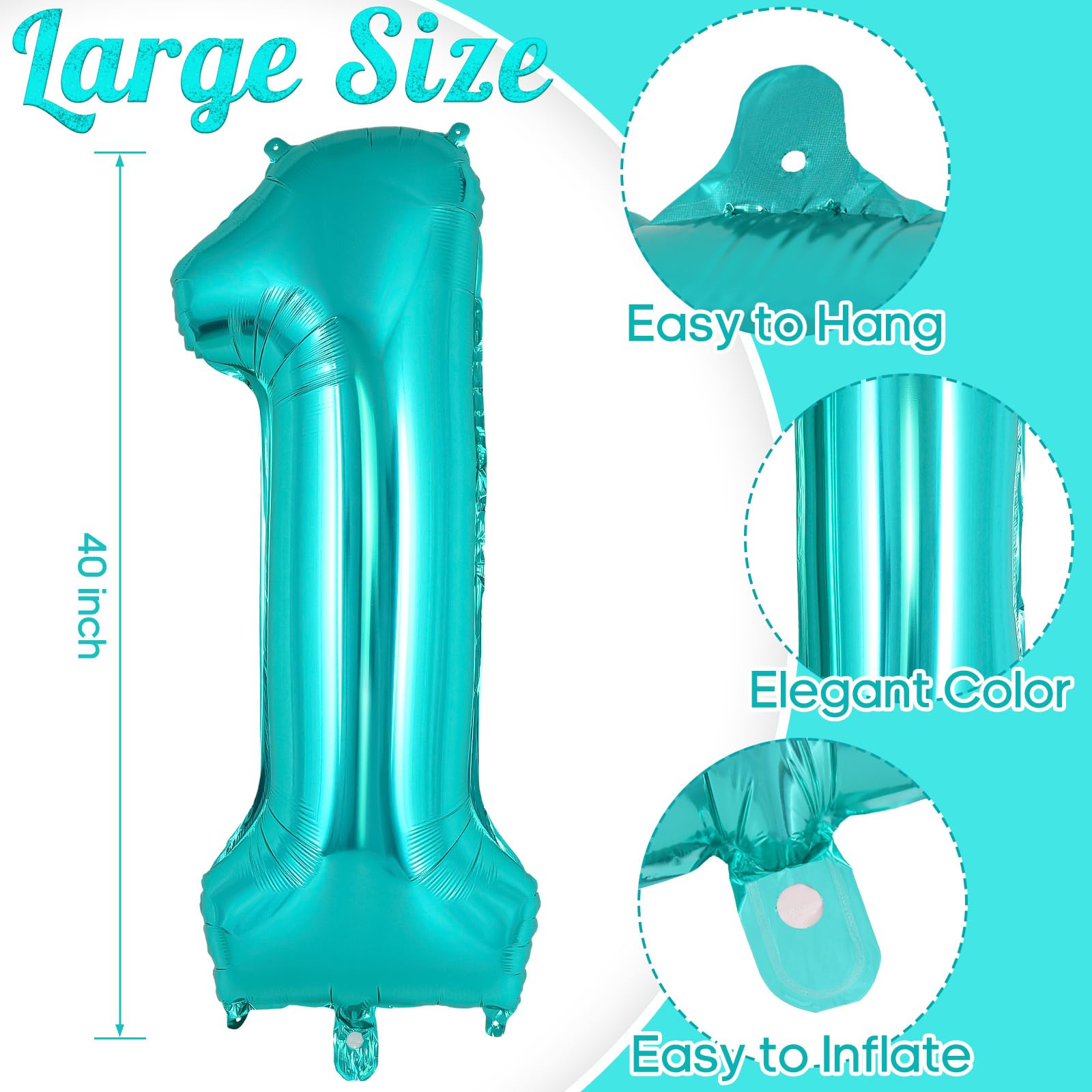 PACKAGE CONTAINS: 1 piece of teal number 1 balloon, measures around 40 inch long. The balloon has 2 loops on top and 2 on the bottom. Pretty color and giant size makes it really eye-catching.