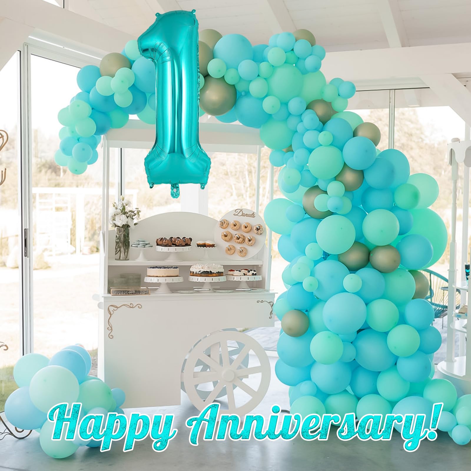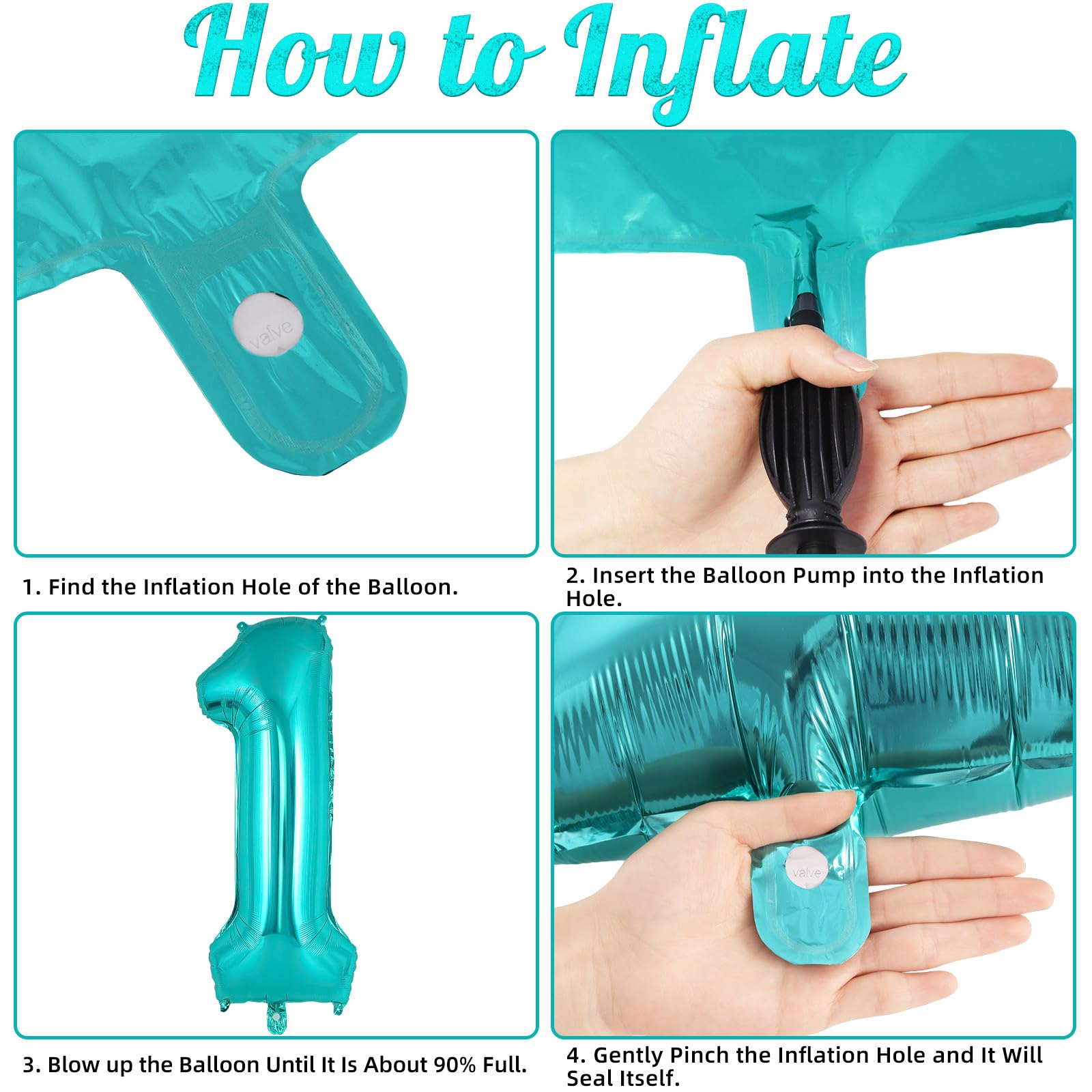 EASY TO USE: Inflate the balloon with air or helium by a balloon pump; pinch the inflation valve gently; then a big beautiful teal 1 balloon is there for you. So easy to do it!