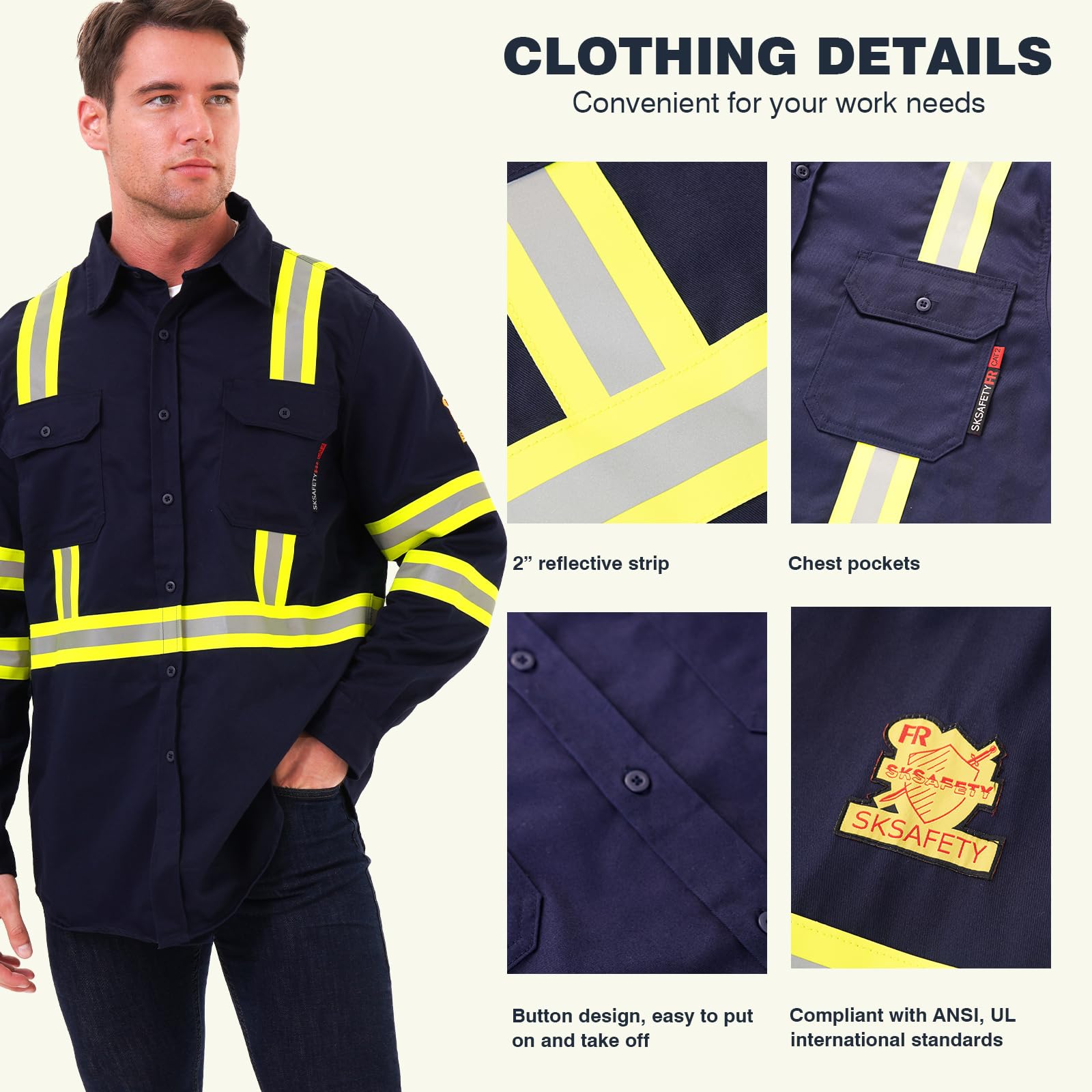 【Fabric】7oz 100% flame retardant treated cotton. 2" reflective tape on shoulders, waist, arms and back for 360° protection