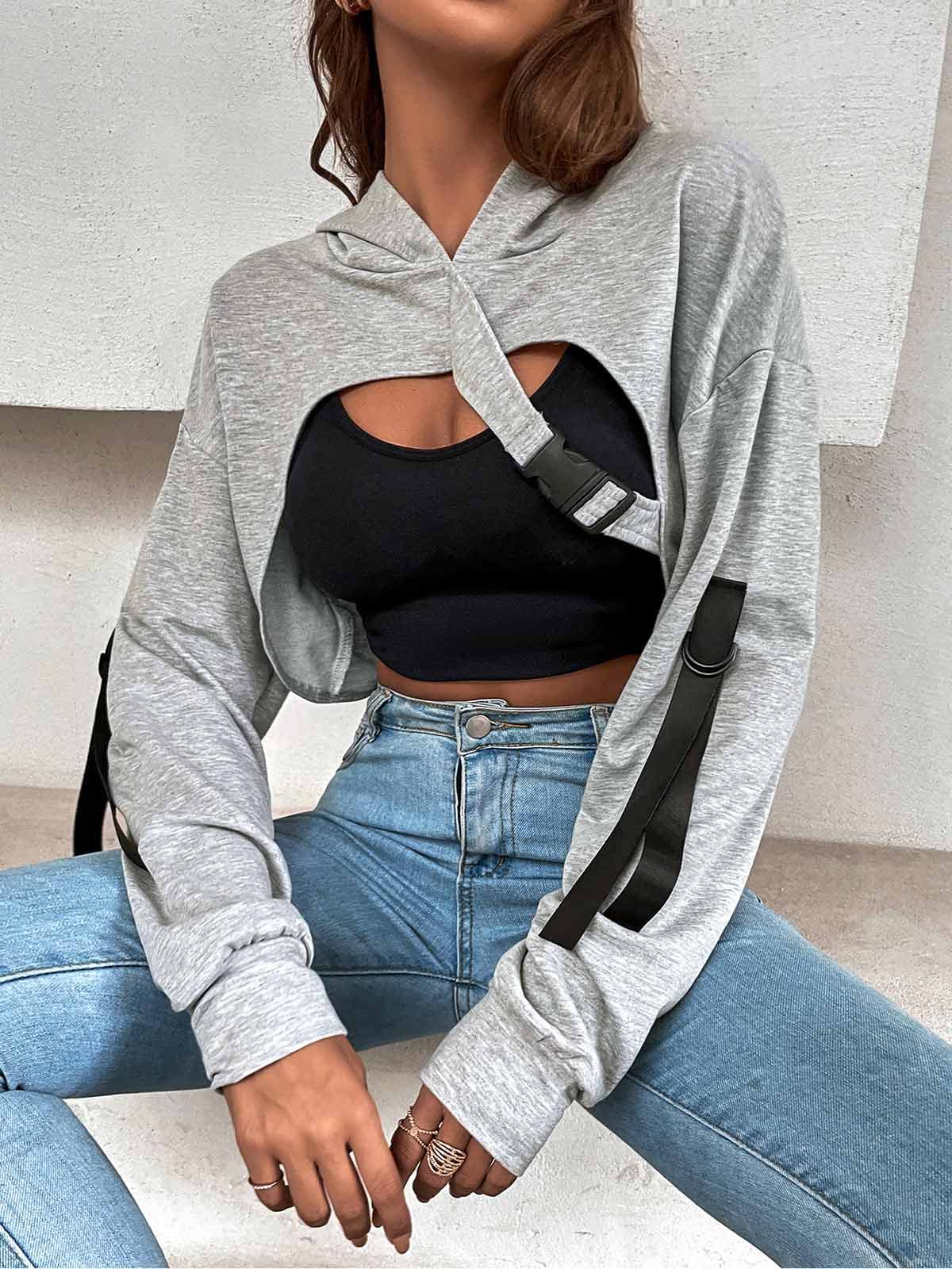Cute little cropped top hoodies pullover: Drawstring Hooded, Long Sleeve,Definitely does cover up your arms,Stitching bottom hem,Cropped length,Gothic,Aesthetic clothes,Cutout rave outfits