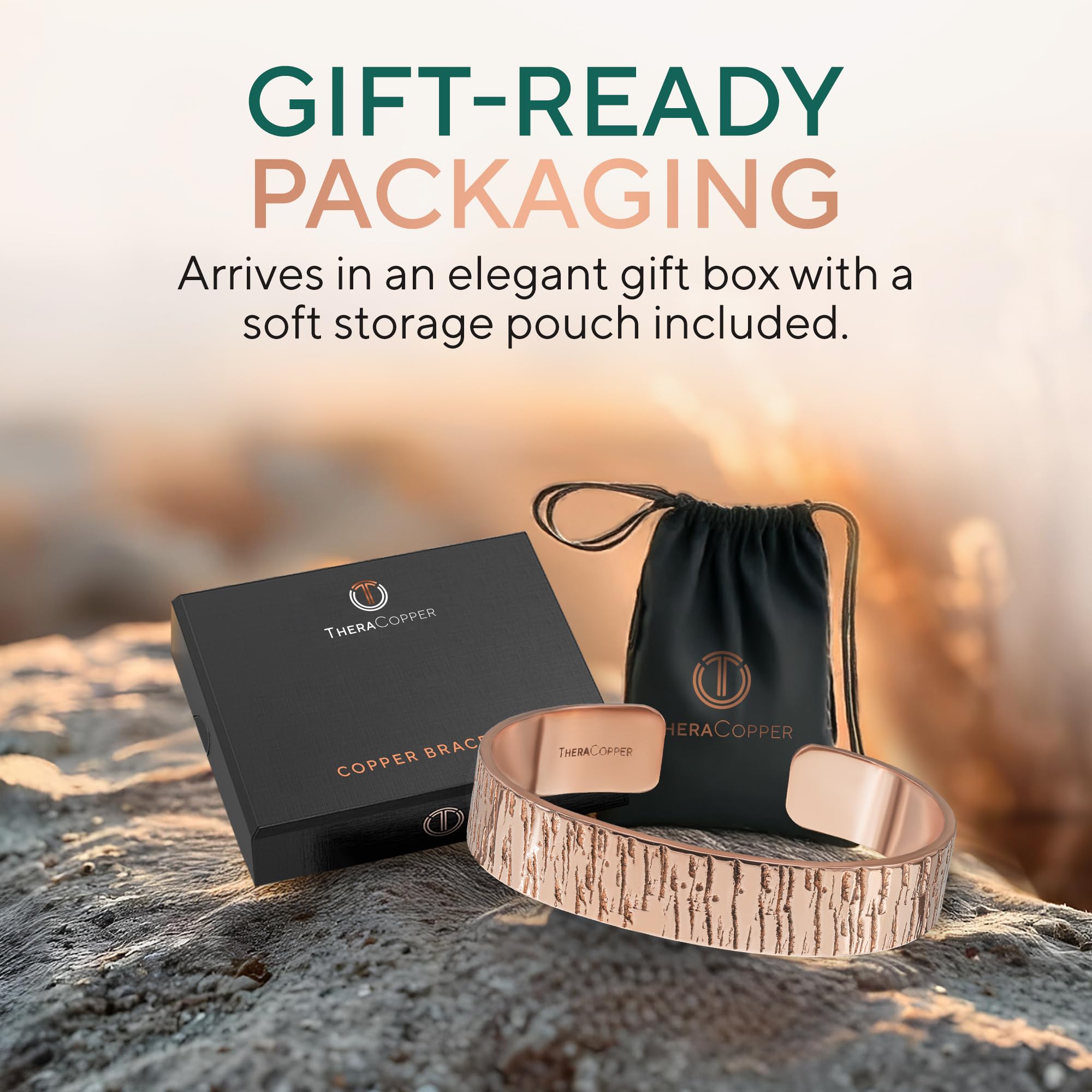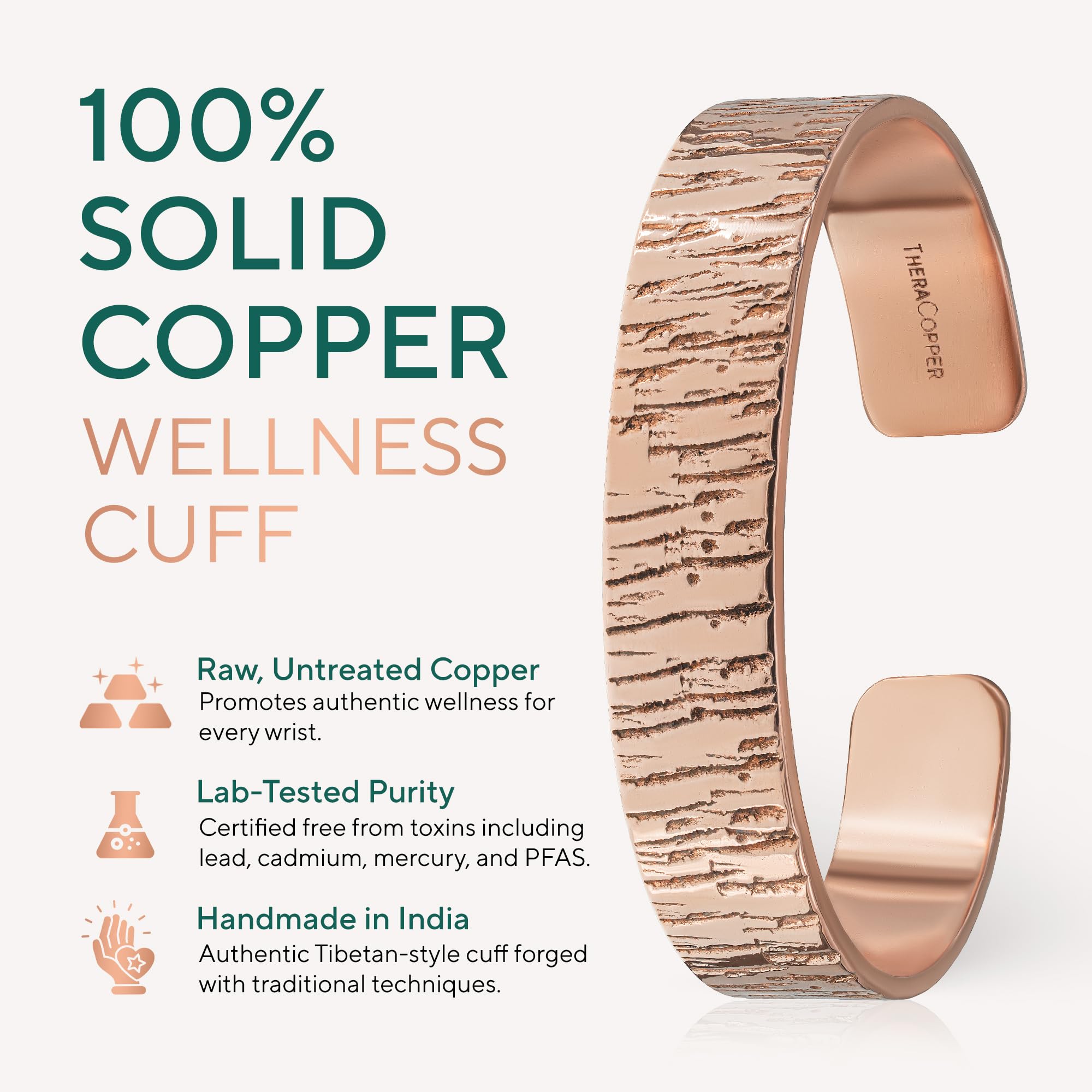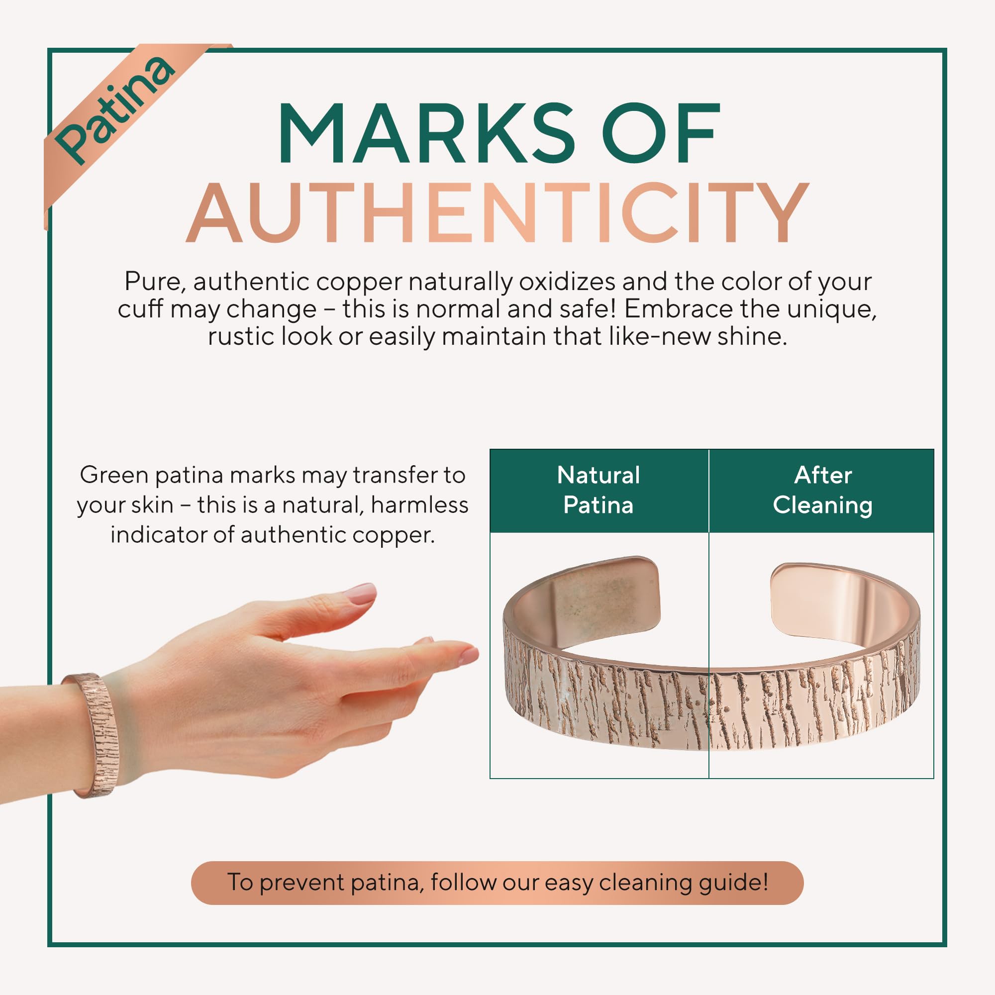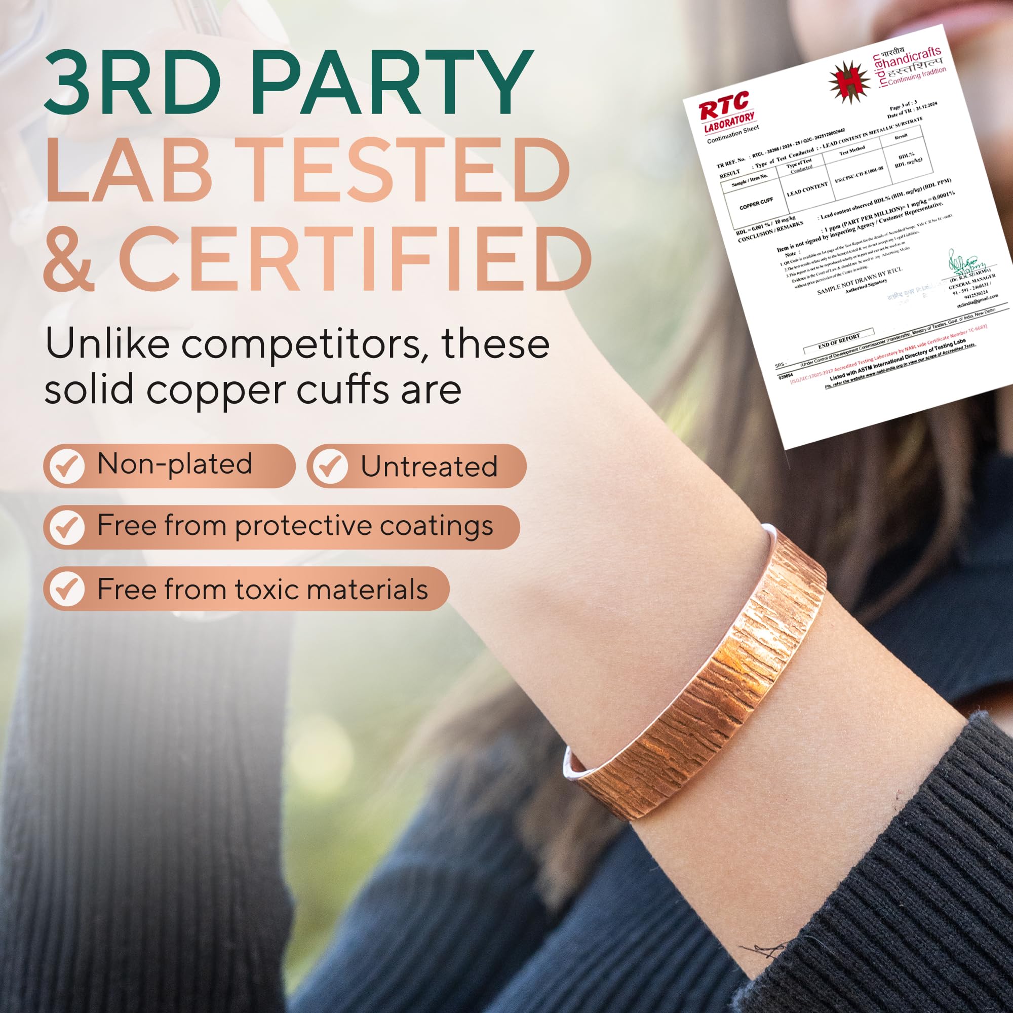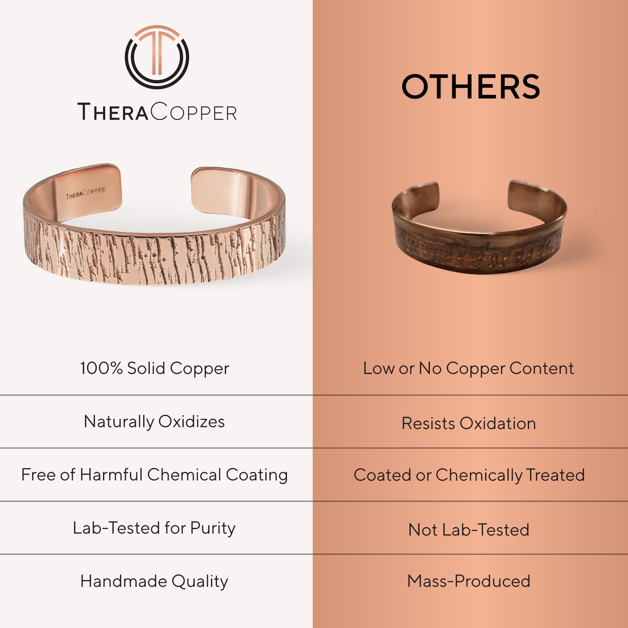 THE PUREST COPPER: Handcrafted with 100% pure copper, our real copper bracelet is lab-tested and certified free from harmful metals like lead, nickel, cadmium, and PFAS. Many alternatives use cheap, mixed copper or plated bracelets with toxic coatings—TheraCopper is completely natural, untreated, and safe. Over time, your pure copper cuff bracelet will develop a natural patina, a hallmark of authentic, untreated copper—not a defect. Simply restore its original shine with salt and lemon juice or any copper cleaner.