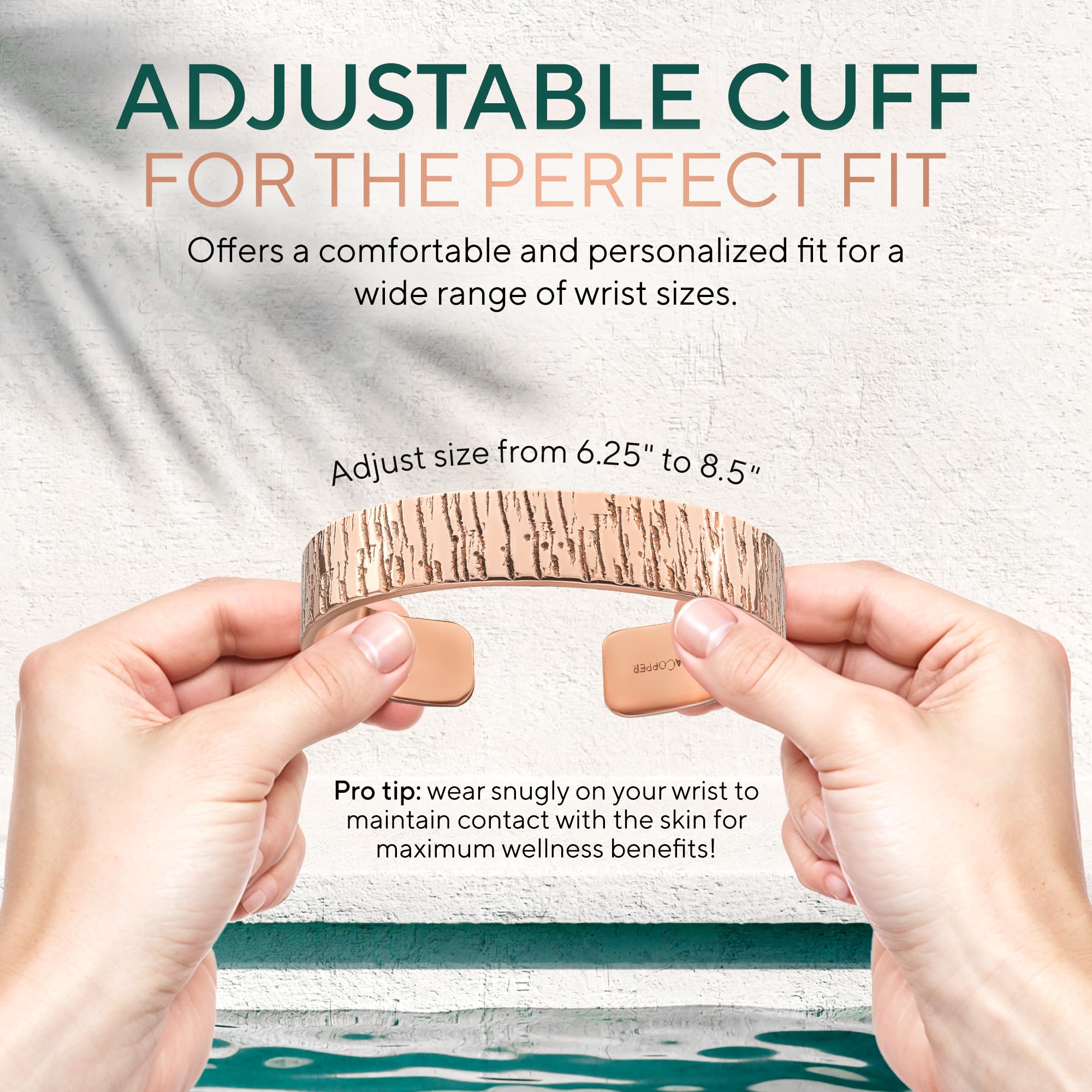 ADJUSTABLE FIT: Designed for all-day comfort, our open-cuff copper bracelet easily adjusts to fit wrist sizes 6.25" to 8.5" (SMALL to X-LARGE). Whether it's a womens or mens copper bracelet, the customizable fit ensures a secure yet comfortable feel without compromising style. A perfect choice for those who appreciate the timeless charm and wellness benefits of real copper jewelry for women and men.