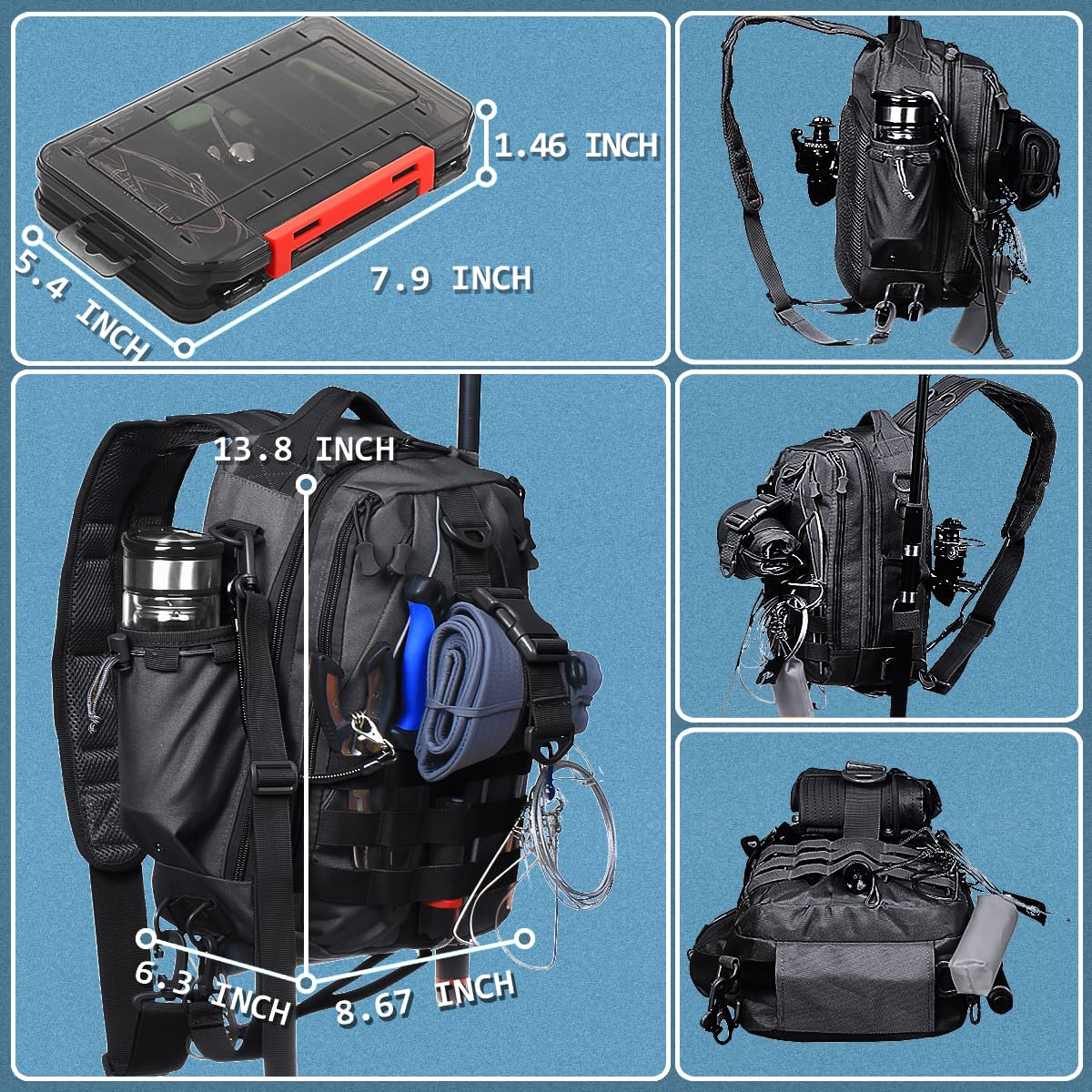 Reliable: This fishing backpack small is exceptionally long-lasting. Its fabric is waterproof, protecting your belongings from getting wet in the rain. The small-size tackle bag zippers are also waterproof and rustproof