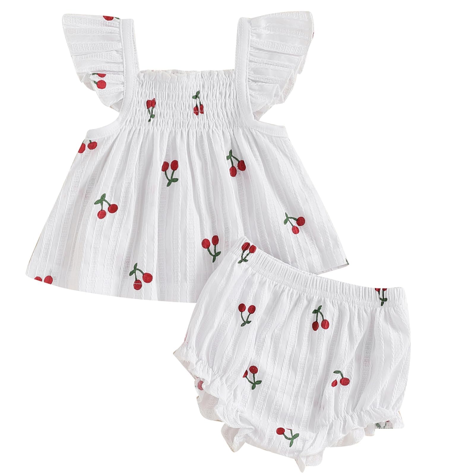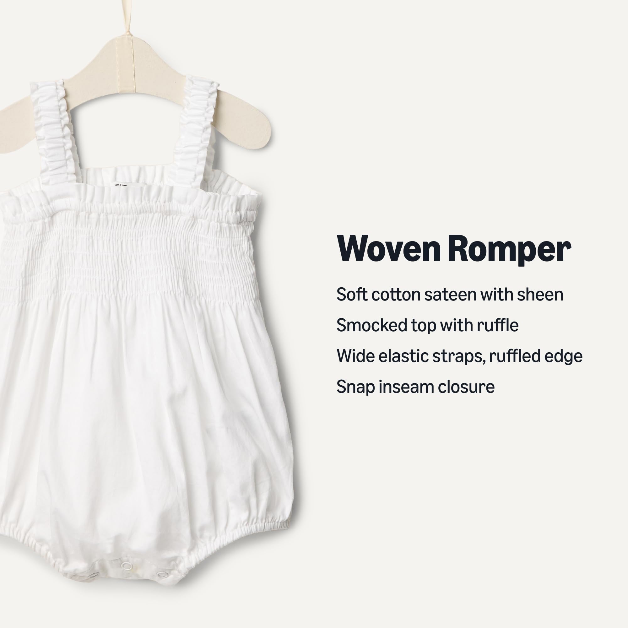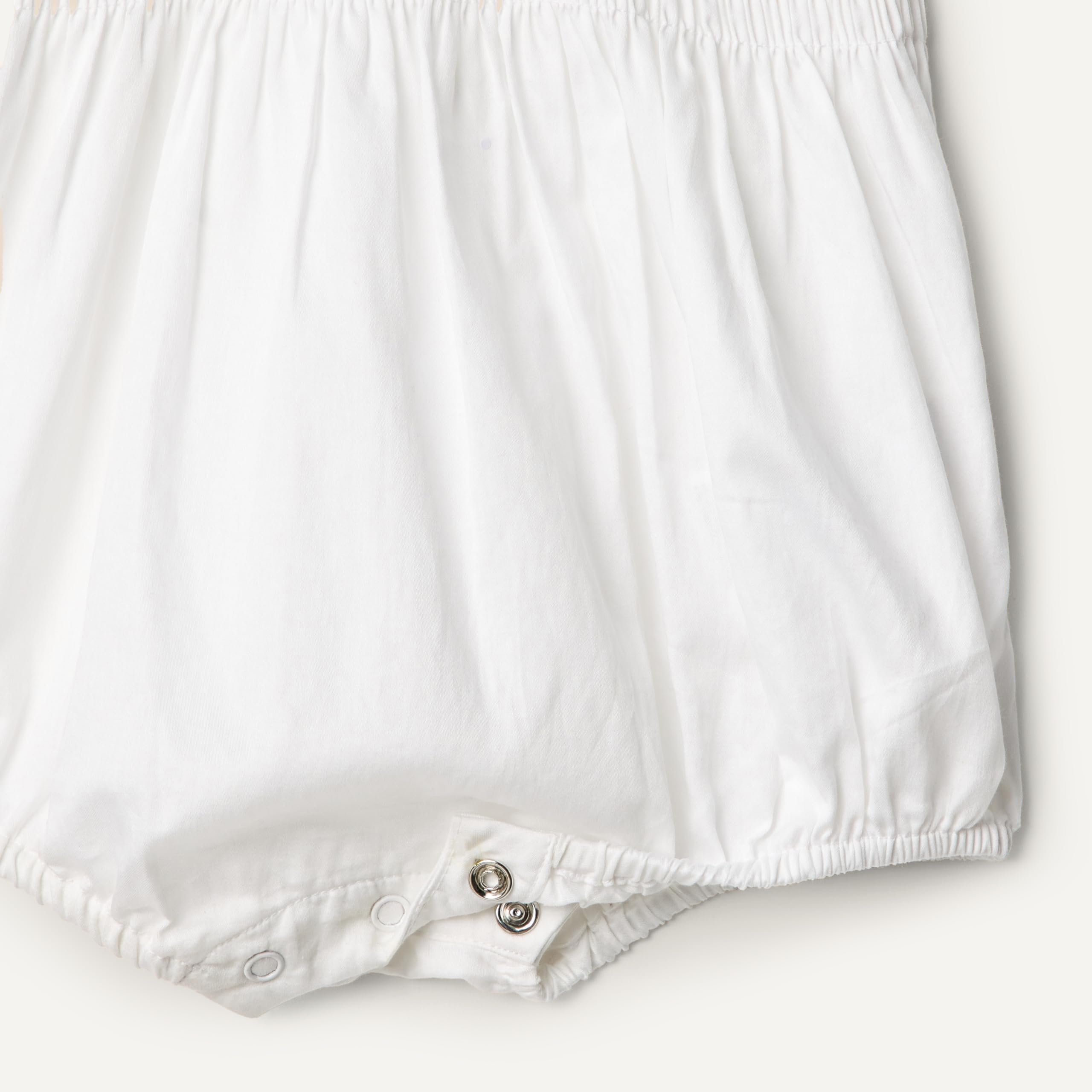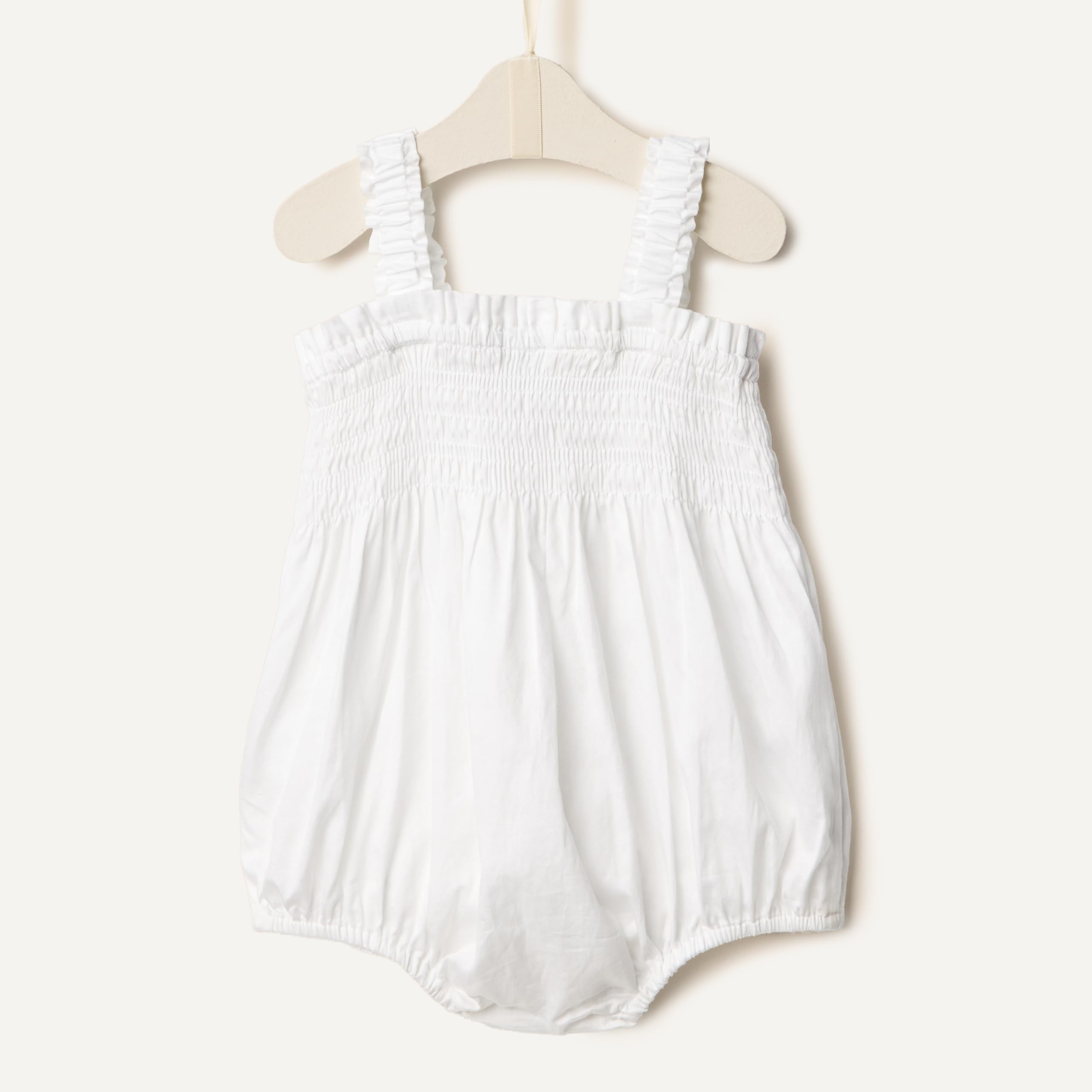 DETAILS: Smocked top with delicate ruffle, wide elastic straps with ruffle-edge detailing, snap inseam for easy on and off, and elasticated leg opening
