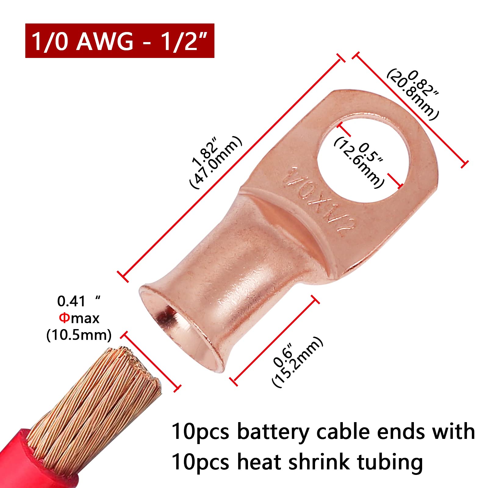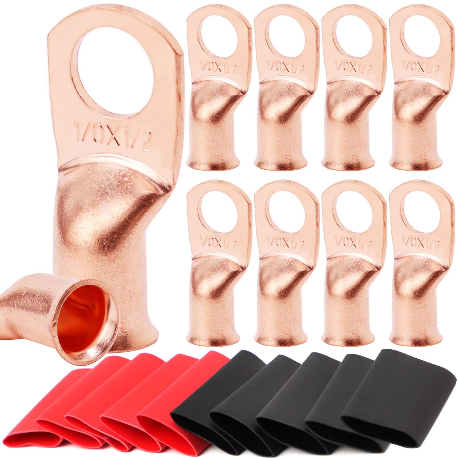 【What You Get:】 10 Pcs per pack of 1/0 Guage (AWG) 1/2" ring terminals, copper lugs closed end termination ring terminals with 10 Pcs 3:1 Dual Wall Adhesive Heat Shrink Tubing Tube for your work(5pcs Black and 5pcs Red).
