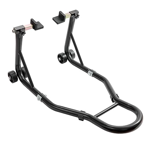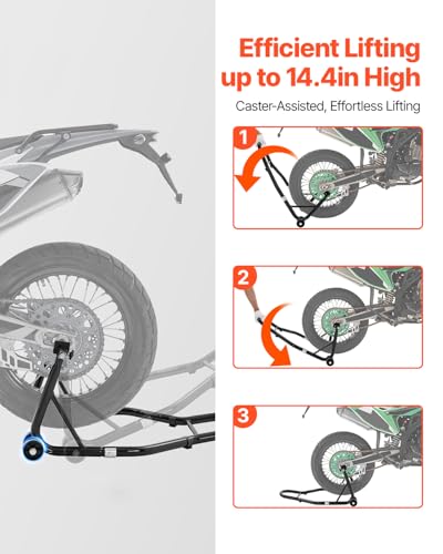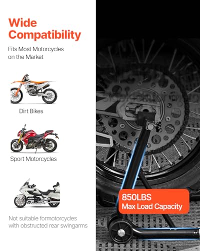 Bullet Point Wide Compatibility: This motorcycle rear stand boasts an impressive 850 lbs (0.39 Ton) load capacity, easily lifting heavy bikes. Compatible with tires up to 13.4 inches in radius, it fits most motorcycles, providing stable support for repairs and maintenance—reliable and practical