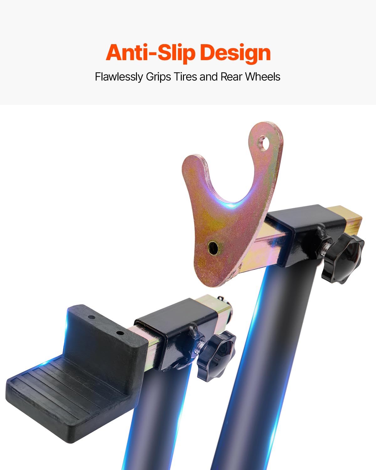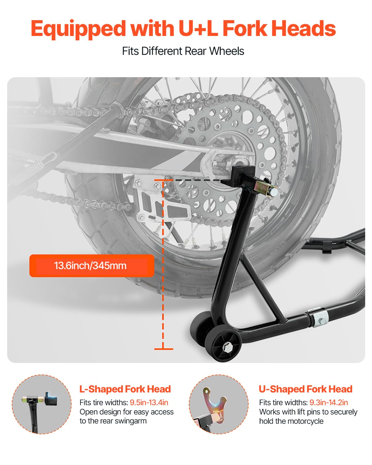 Adjustable Fork Heads: The U-shaped fork adjusts from 9.3 - 14.2 inches (235 - 360mm), while the L-shaped fork fits 9.5 - 13.4 inches (240 - 340mm), accommodating various bike models. The L-shaped fork’s thick rubber sleeve keeps swing arms from scratches