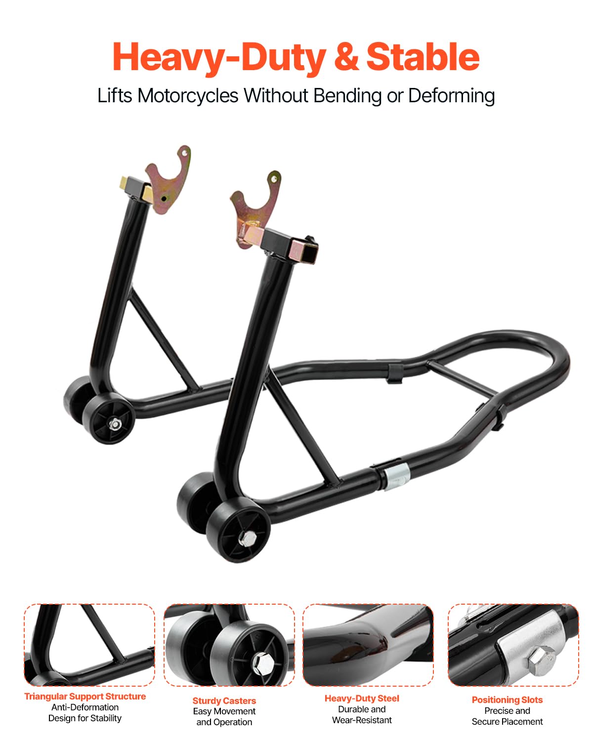 Durable & Sturdy: This rear stand features precision locking slots and sturdy casters for easy movement. Built with heavy-duty steel, it resists wear and tear. The triangular support structure ensures anti-deformation and strong stability, delivering an efficient and reliable lifting experience