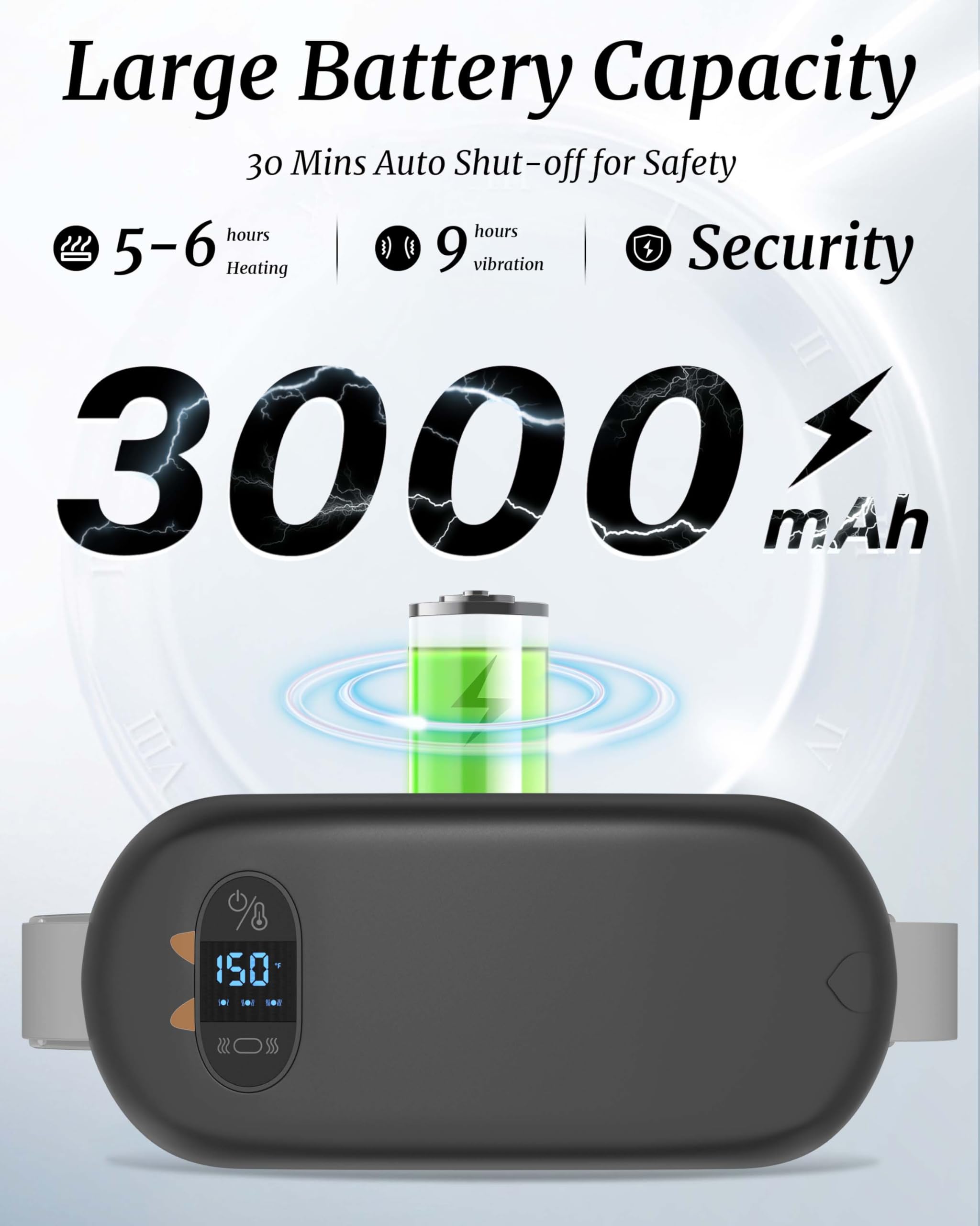 Smart LED Display: You can check the remaining battery percentage, heating mode temperature, and vibration level on the LED display which is much more convenient than the regular small heating pad with only button control.