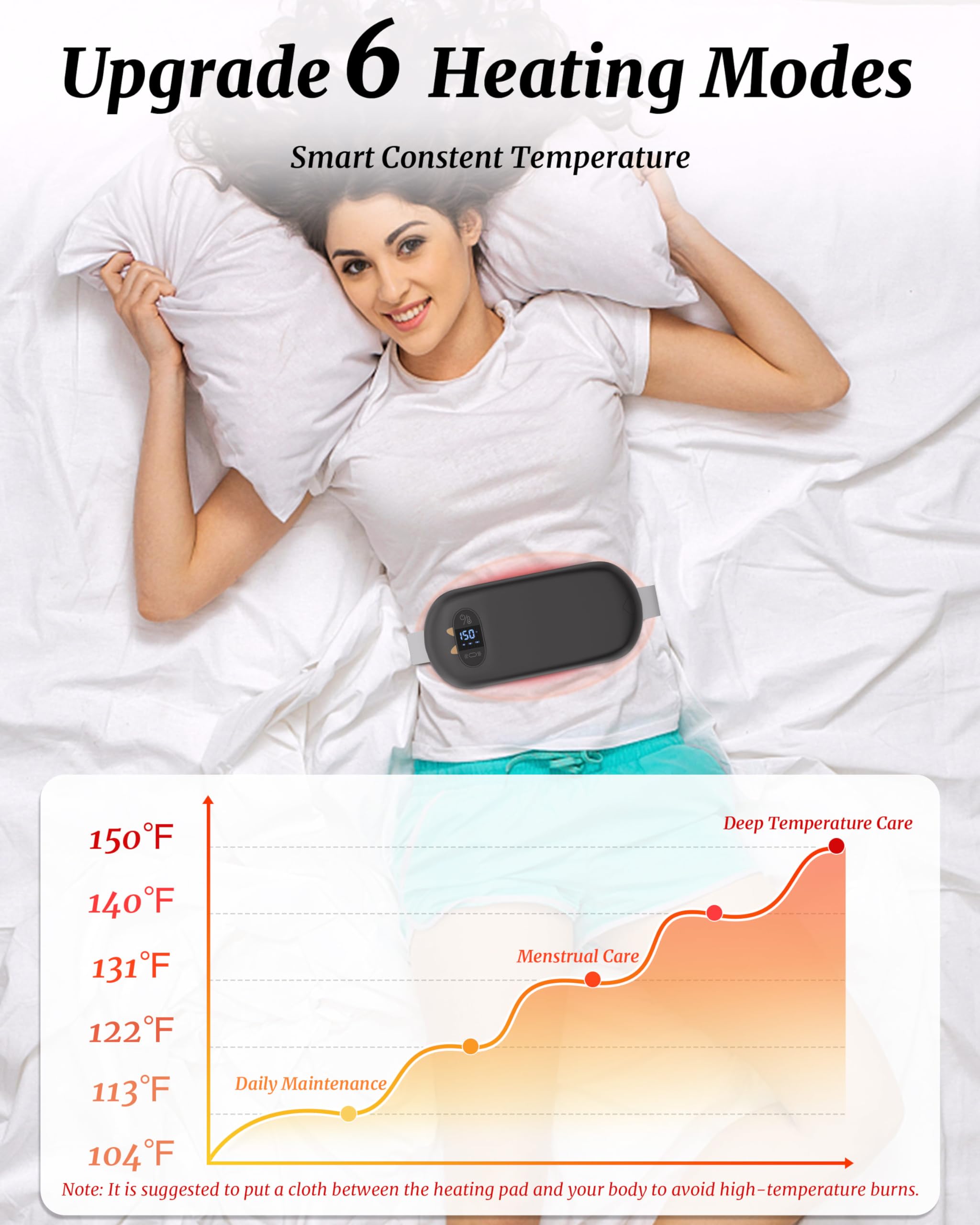Upgrade 6 Heating & Massage Modes: We upgraded the menstrual relief heating pad to 6 heating modes from 104℉ to 150℉ and 6 massage levels to better meet your different daily needs and preferences. Vibrating modes could work with the heating function simultaneously or work independently as a muscle massager to soothe sores.