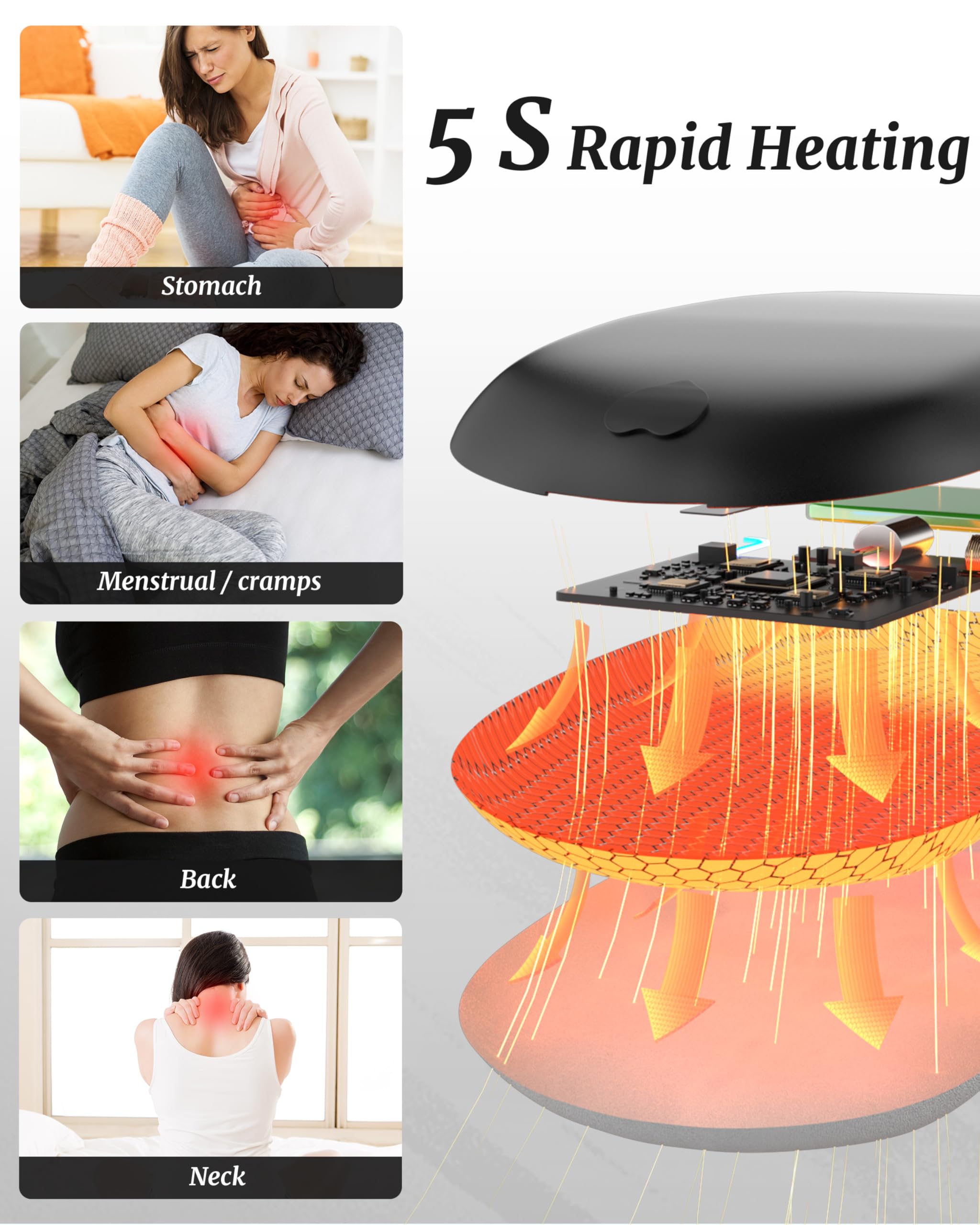 Fast Heating for Pain Relief: Portable heating pad heats up rapidly in 5 seconds with soothing heating therapy that improves blood circulation to relieve menstrual cramps, abdomen chill, back pain, and stomach pain. Soft velvet fabric on the heating side of electric heating pad provides maxim comfort for your period.