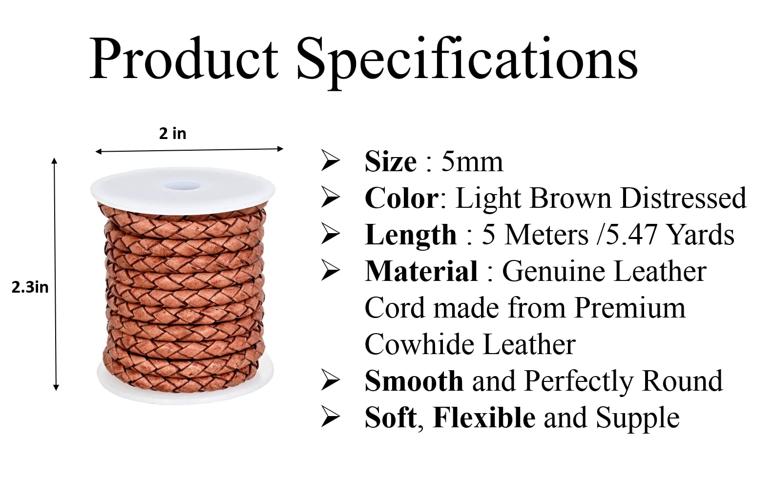 5mm braided leather cord - 5mm size, 5 metre length (5.47 yards). Premium quality for bolo tie supplies.