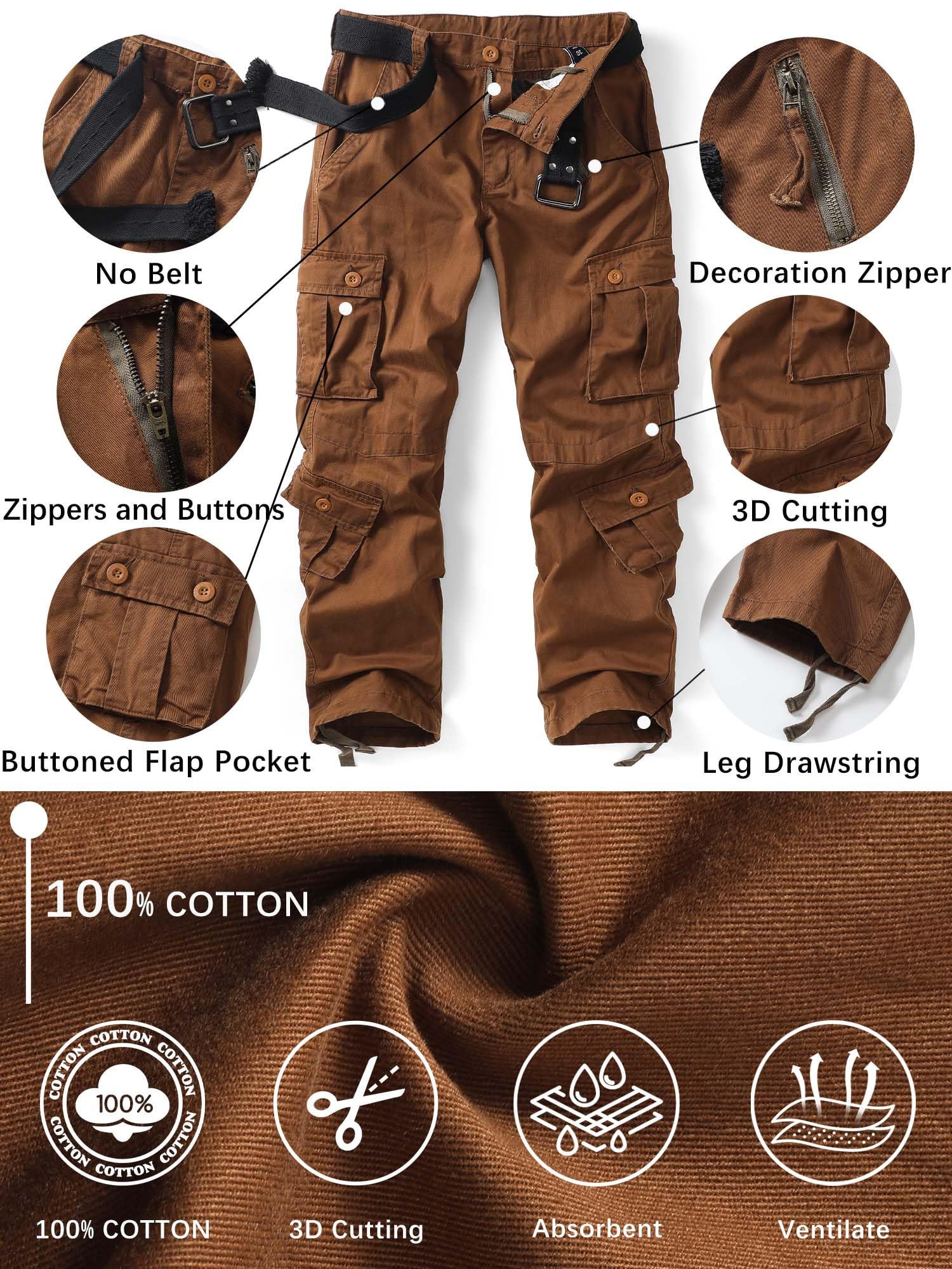 Product Material:This cargo pants for men use 100% cotton fabric, treated for ease of care with a wrinkle-resistant finish and durability,which is soft,breathable and sweat-absorbent,durable and tough,can repel the stains, liquids and soil keep you all day dry and clean.
