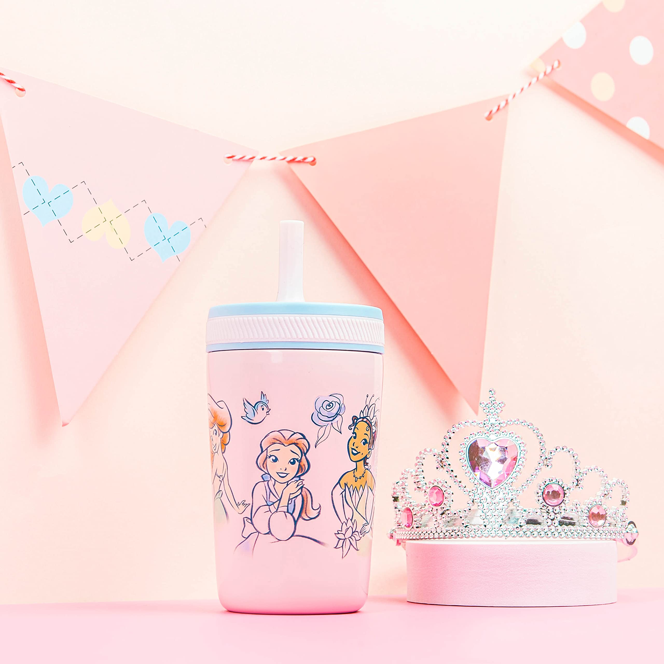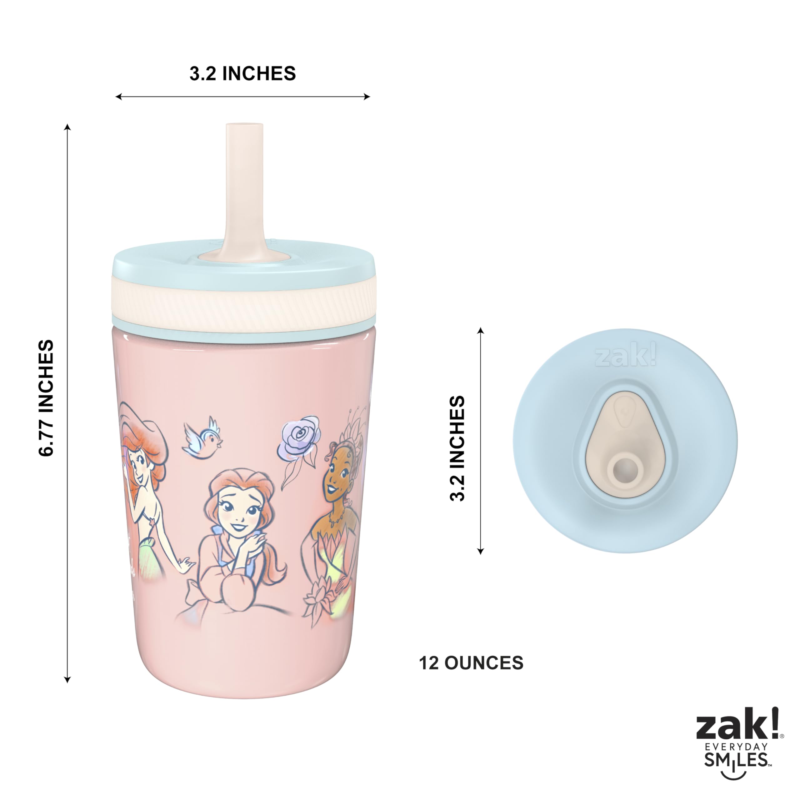 This leak-proof tumbler from Zak Designs makes hydration fun for any Disney Princess fan! Durable Materials: The tumbler is made from food-grade, 18/8 stainless steel, and the comfortable straw is made from silicone. Everything is completely BPA free, and the lid can be disassembled for easy cleaning. Leak-Proof Straw: The straw spout has a built-in valve that allows liquid to flow when drinking and prevents spills when the tumbler is tipped over. It's perfect for travel or for young children graduating from sippy cups. Vacuum Insulation: The stainless steel tumbler has vacuum insulation that keeps drinks cold for up to 10 hours, so your water is always refreshingly chilled. The double-wall construction also prevents condensation from forming on the outer walls, eliminating messy water rings.Hydrate Anywhere: The tumbler won't splash or leak and fits in car cup holders, making it ideal to take on the go. At home, you don't have to worry about spills or stains around fabrics or electronics, and drinks stay easily accessible through the straw. Specifications: 12 oz capacity. Vacuum insulated. Made of durable stainless steel and silicone. BPA-Free - Zak is committed to safety. Top rack dishwasher safe, do not microwave. Length: 3.2-inch, Width: 3.2-inch, Height: 6.77-inch. Character: Disney Princess: Ariel (The Little Mermaid), Belle (Beauty and the Beast), Cinderella, Mulan, Tiana (The Princess and the Frog).