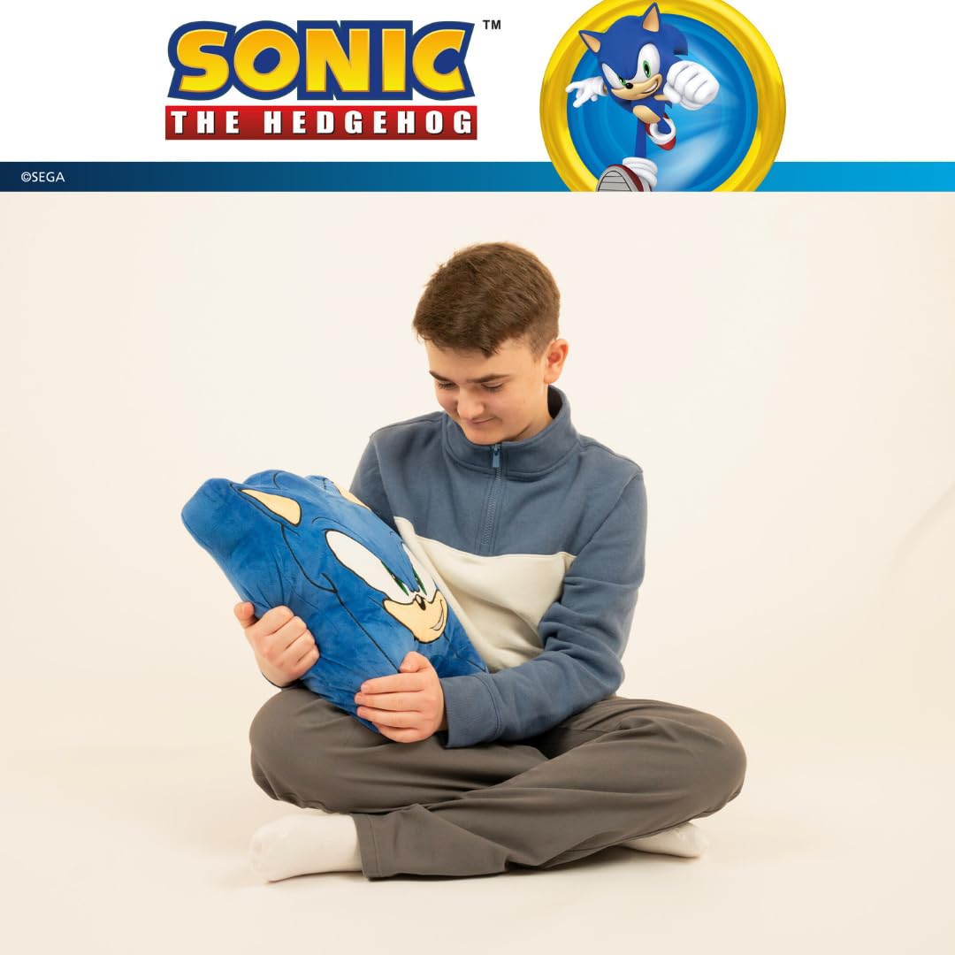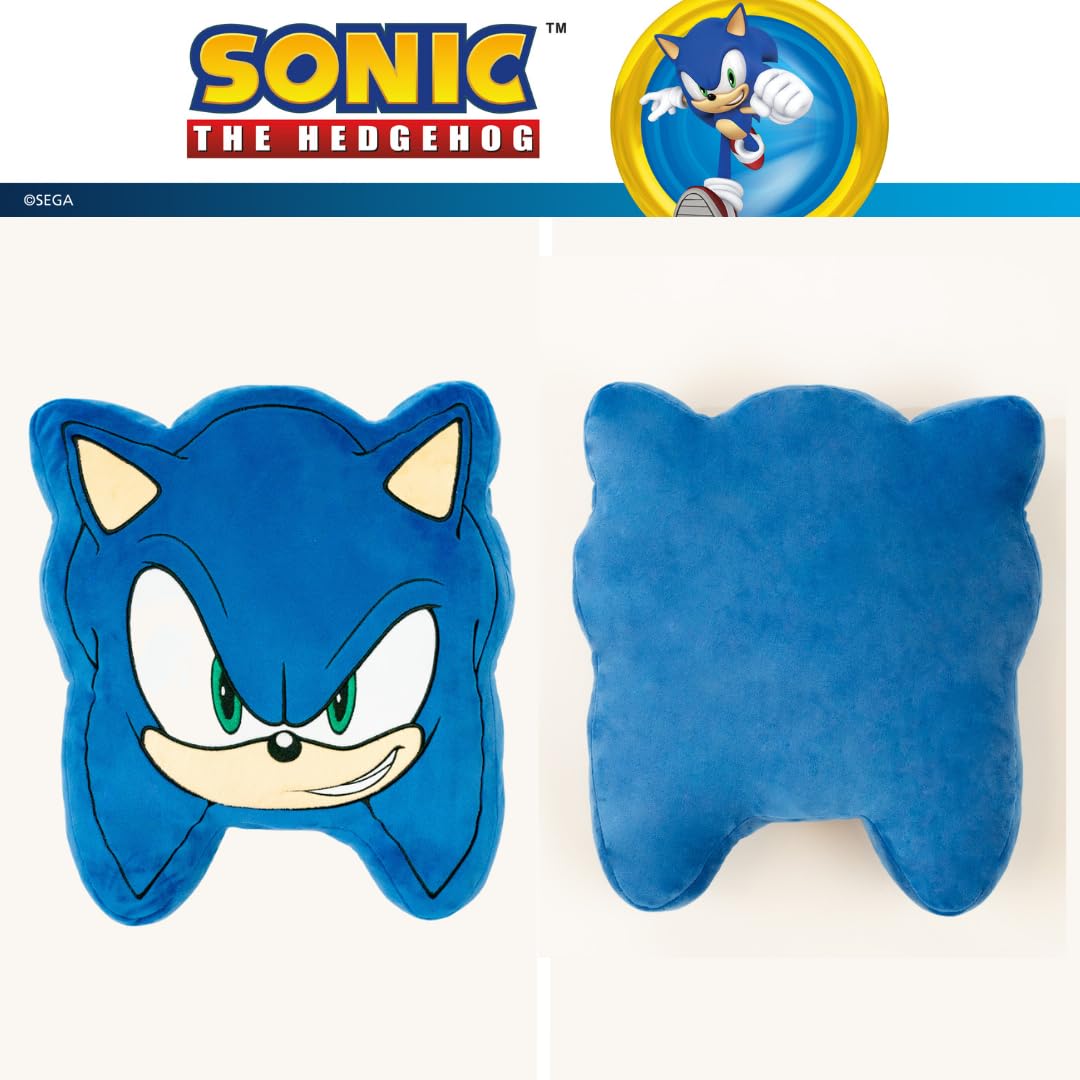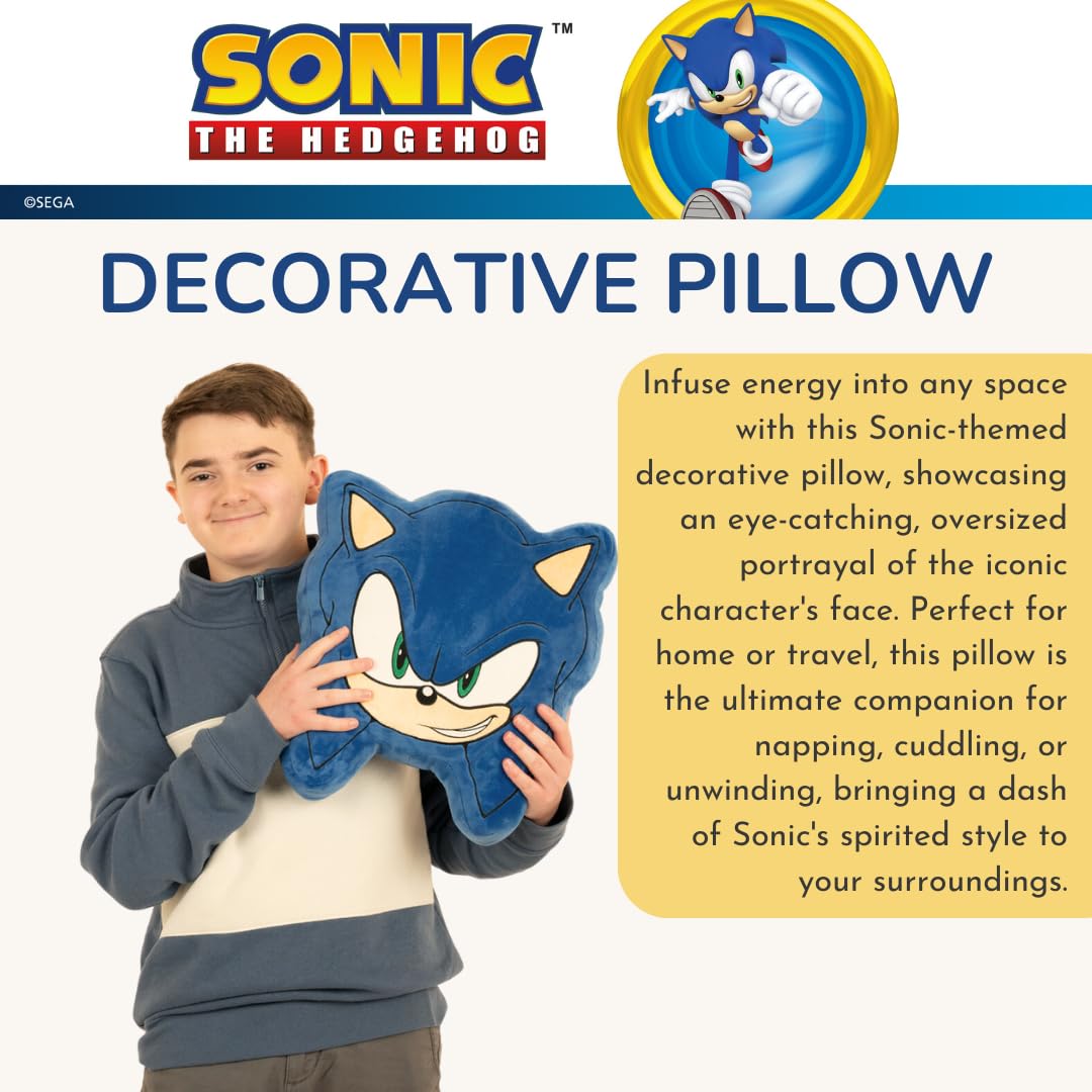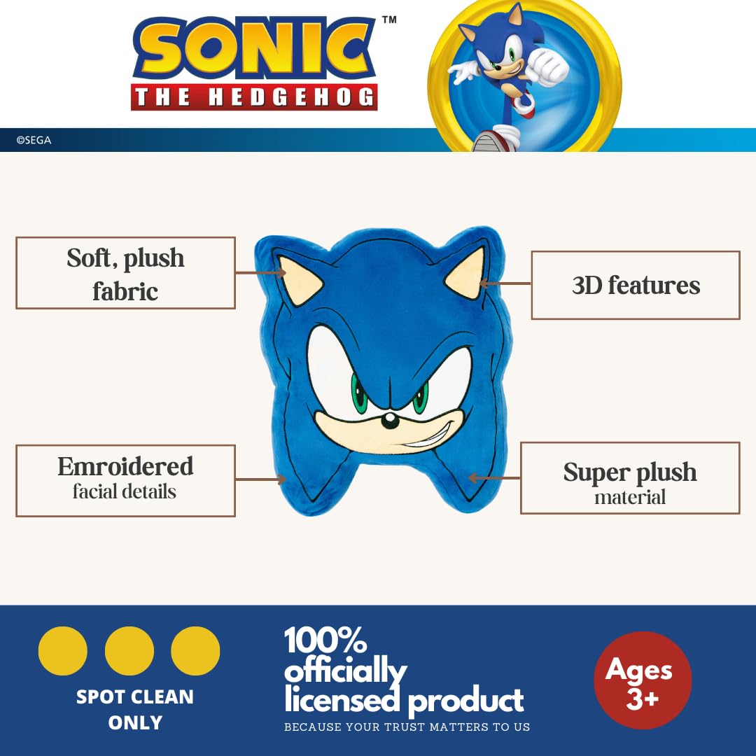 ITEM INCLUDES (AGES 3+): A Sonic face-shaped plush decorative throw pillow, measuring a generous 16". The perfect size to snuggle up with for any Sonic the Hedgehog fan!