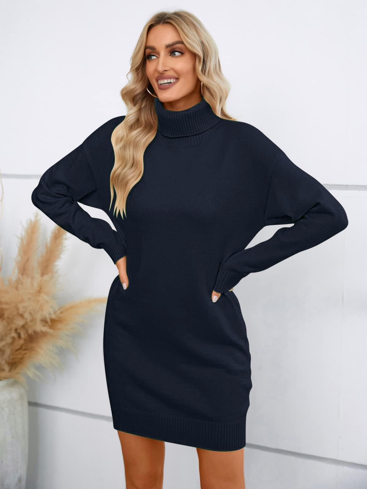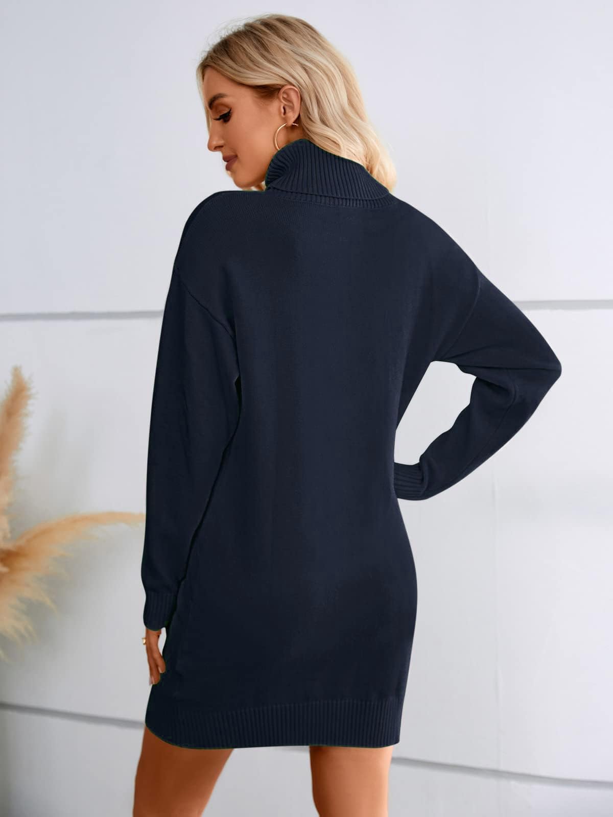 Features: Sweater Dresses, Knitted, Turtleneck, Relaxed fit, Short dress, Above Knee Length, Drop shoulder design, Ribbed at cuffs and hem. Ideal companion for fashionable outfits