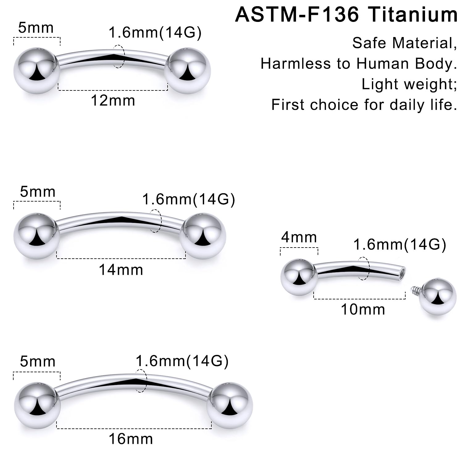 【Size】: Gauge: 14G(1.6mm), Bar Length: 10MM 12MM 14MM 16MM, Ball Size: 4MM 5MM.
