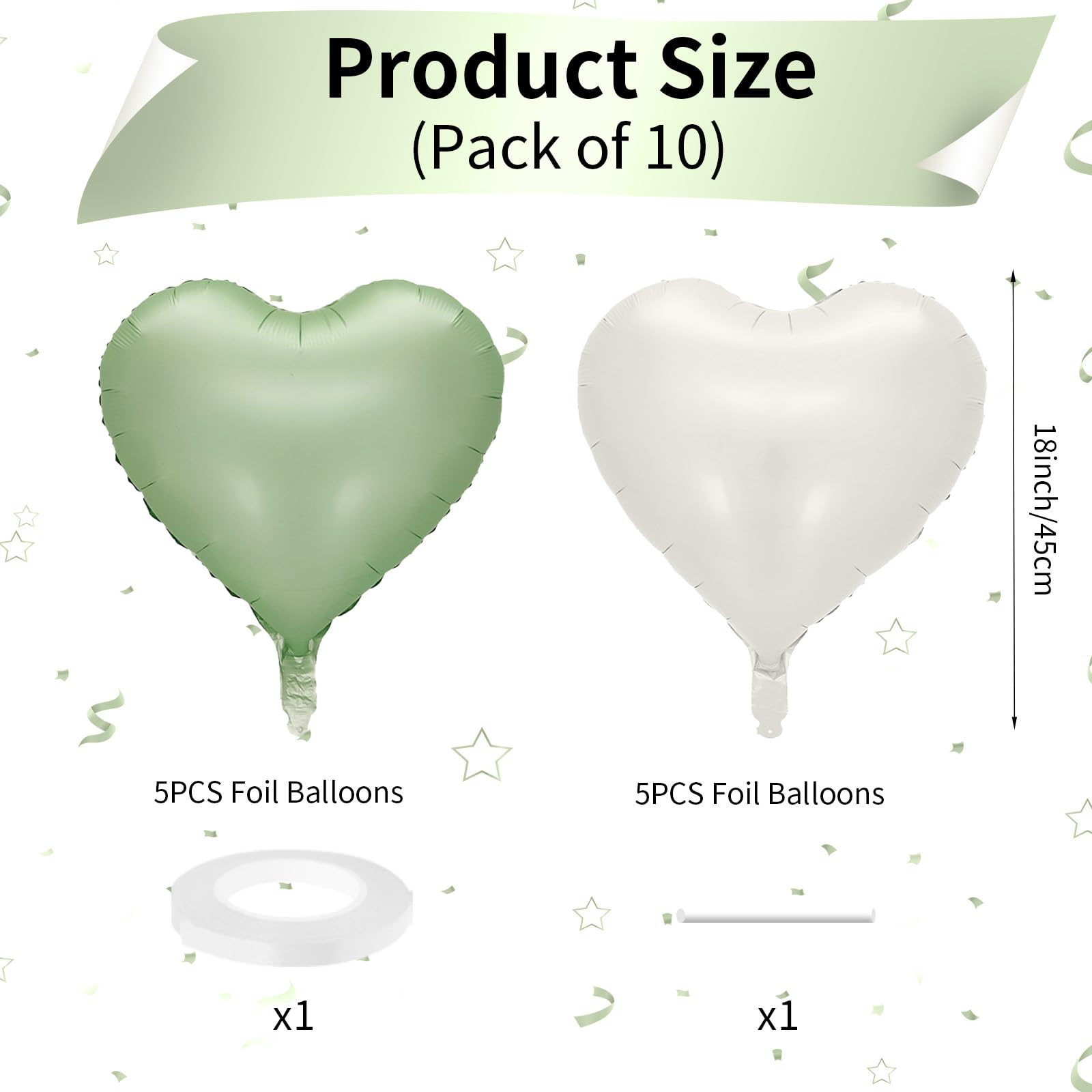 10 PCS Sage Green White Heart Balloons: Our package contains 5 x 18 inches green heart shaped balloons, 5 x 18 inches beige heart shaped balloons, 1 x 10m ribbon. The olive green cream white foil heart balloons are specially designed to add a touch of fun and surprise to any party or holiday celebration. With a size of 18 inches, they are the perfect addition to your decorating needs, leaving your guests with an unforgettable smile!