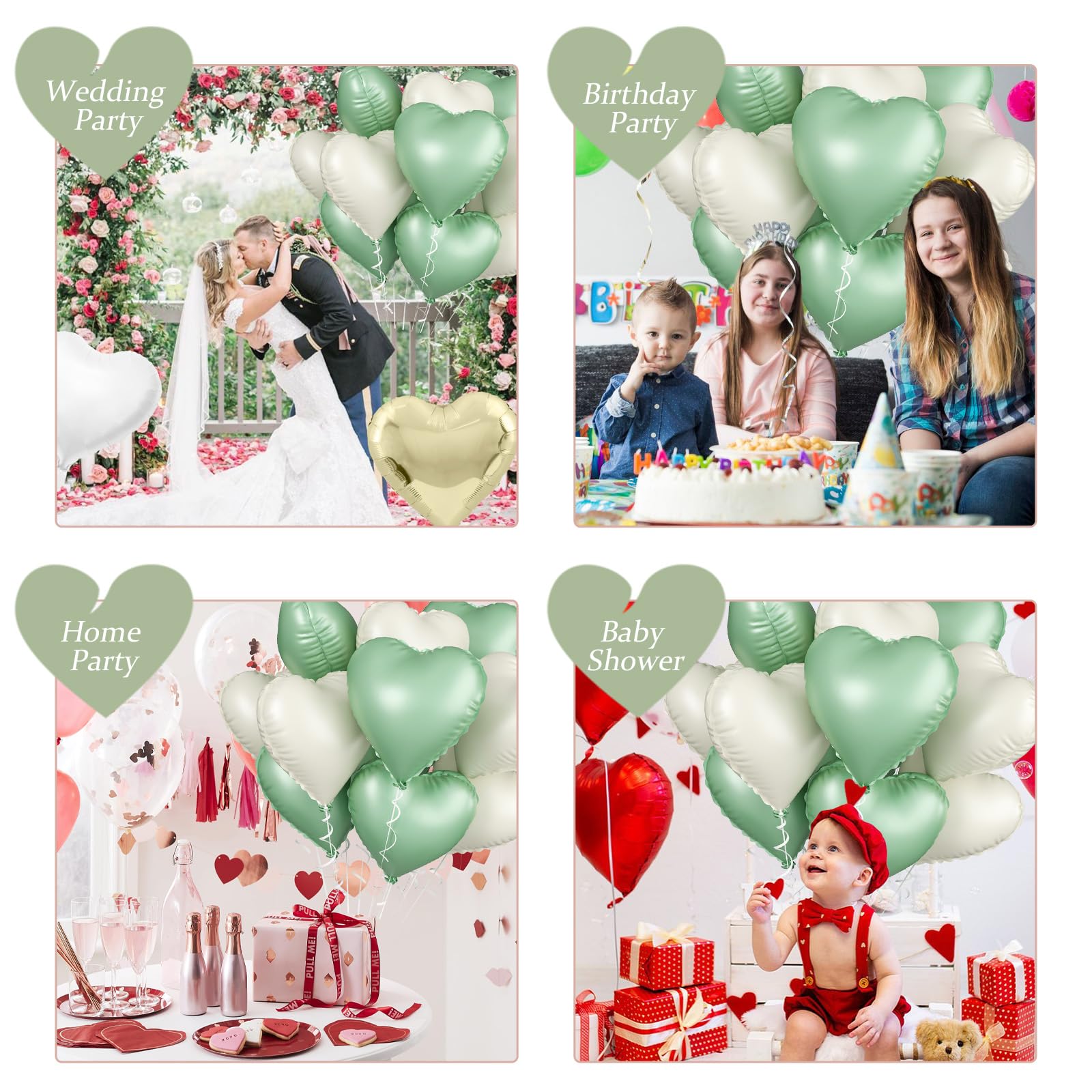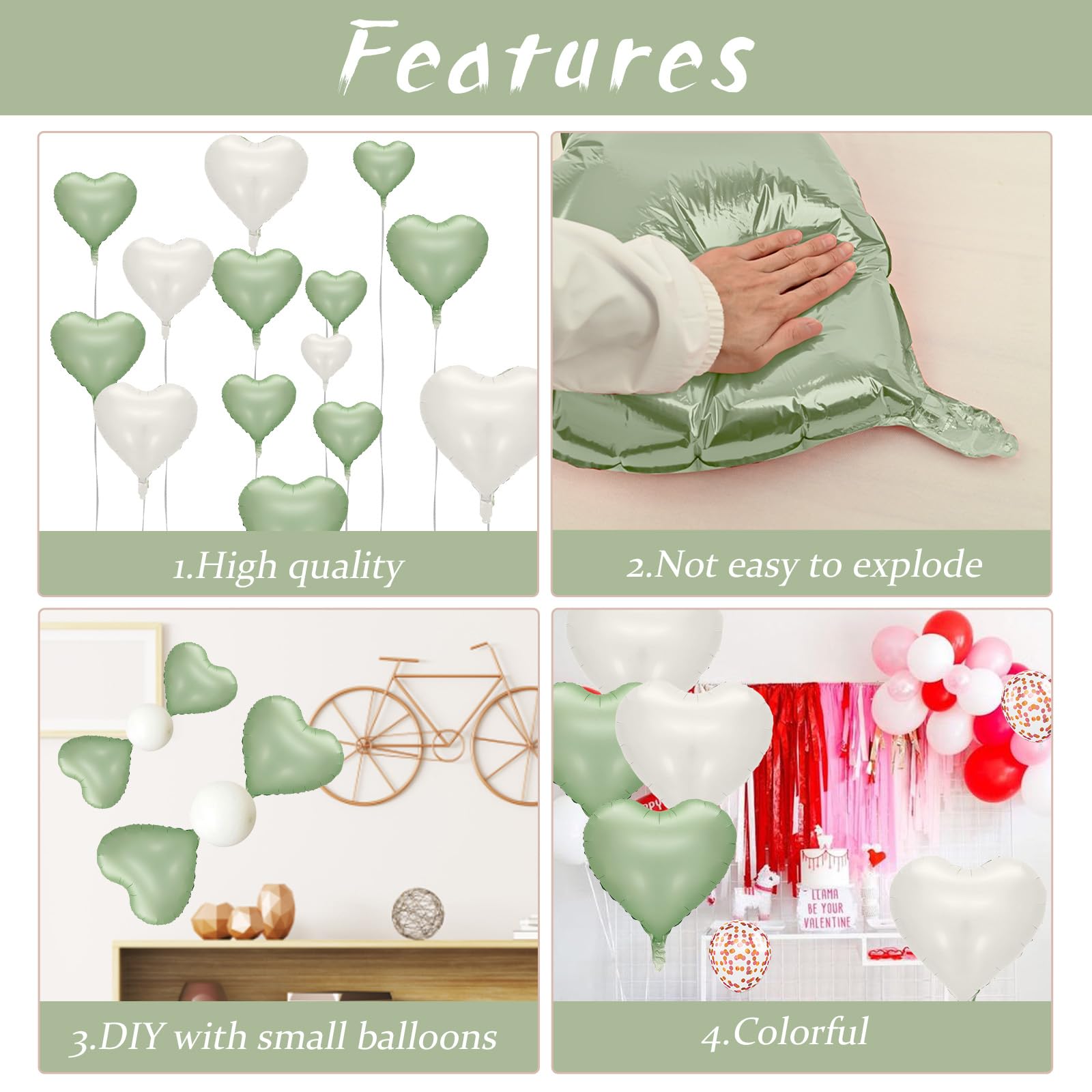 Versatile Decoration: Our sage green white heart valentine balloons are perfect for a wide range of celebrations, including boy's and girl's birthday parties, baby showers, Valentine's Day decorations, wedding parties, bridal showers, princess parties, anniversaries, and more. They are ideal for balloon bouquets, home and table decor, wedding aisle decoration, photo backgrounds, party supplies, and other events.