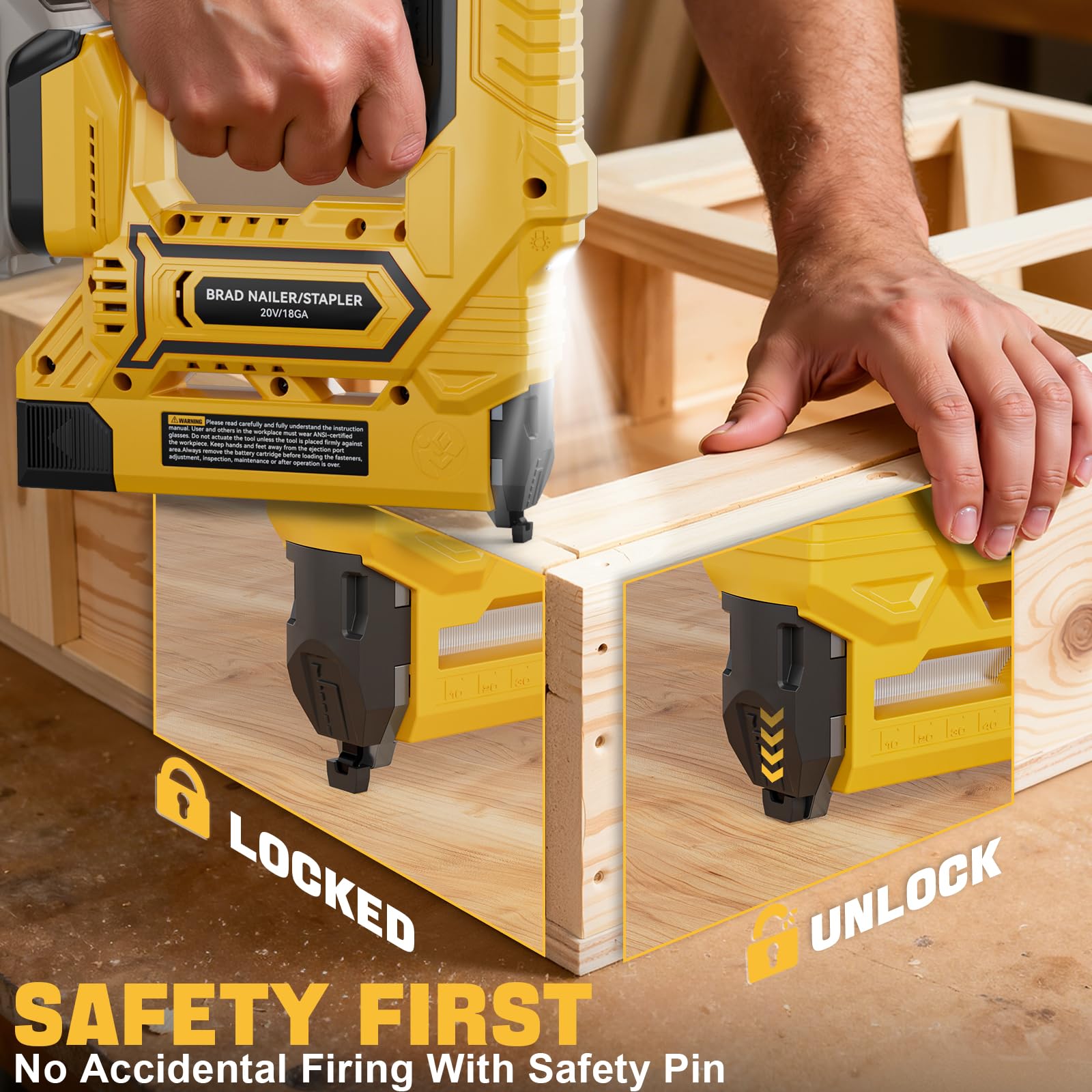 18GA Dual Compatibility & Universal Utility for Compact Tasks: This cordless brad nailer is engineered to drive 18GA brad nails (5/8"–1-1/4") and 18GA staples (5/8"–1"), making it a must-have professional nail gun for finish carpentry, woodworking, upholstery, flooring installation, and trim projects. Designed for versatility, it seamlessly handles both small detailing and medium-duty tasks—note that it is not compatible with 16GA nails or 2-inch nails.