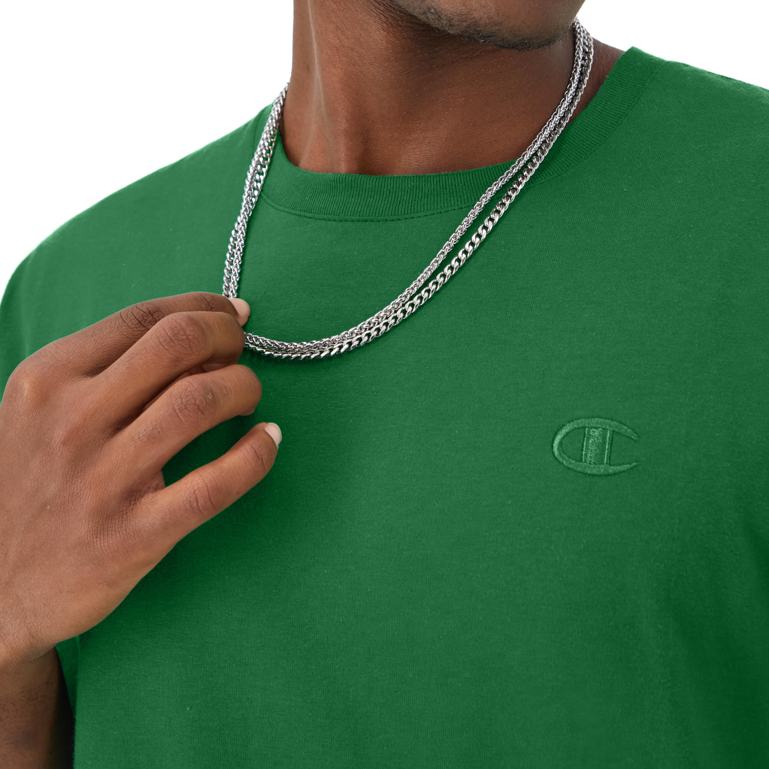 Description TIMELESS THREADS. Add lived-in comfort to your daily rotation with this T-shirt for men, expertly crafted from a soft cotton or cotton blend. Cut for a standard fit, it's detailed with a shape-holding ribbed crewneck, short sleeves, and matching back neck tape for no-irritation comfort. This classic men's T-shirt style is a must-have that pairs well with sweats and shorts for a rounded-out sporty look. Finished with the iconic C logo patch embroidered at the chest for an authentic look.