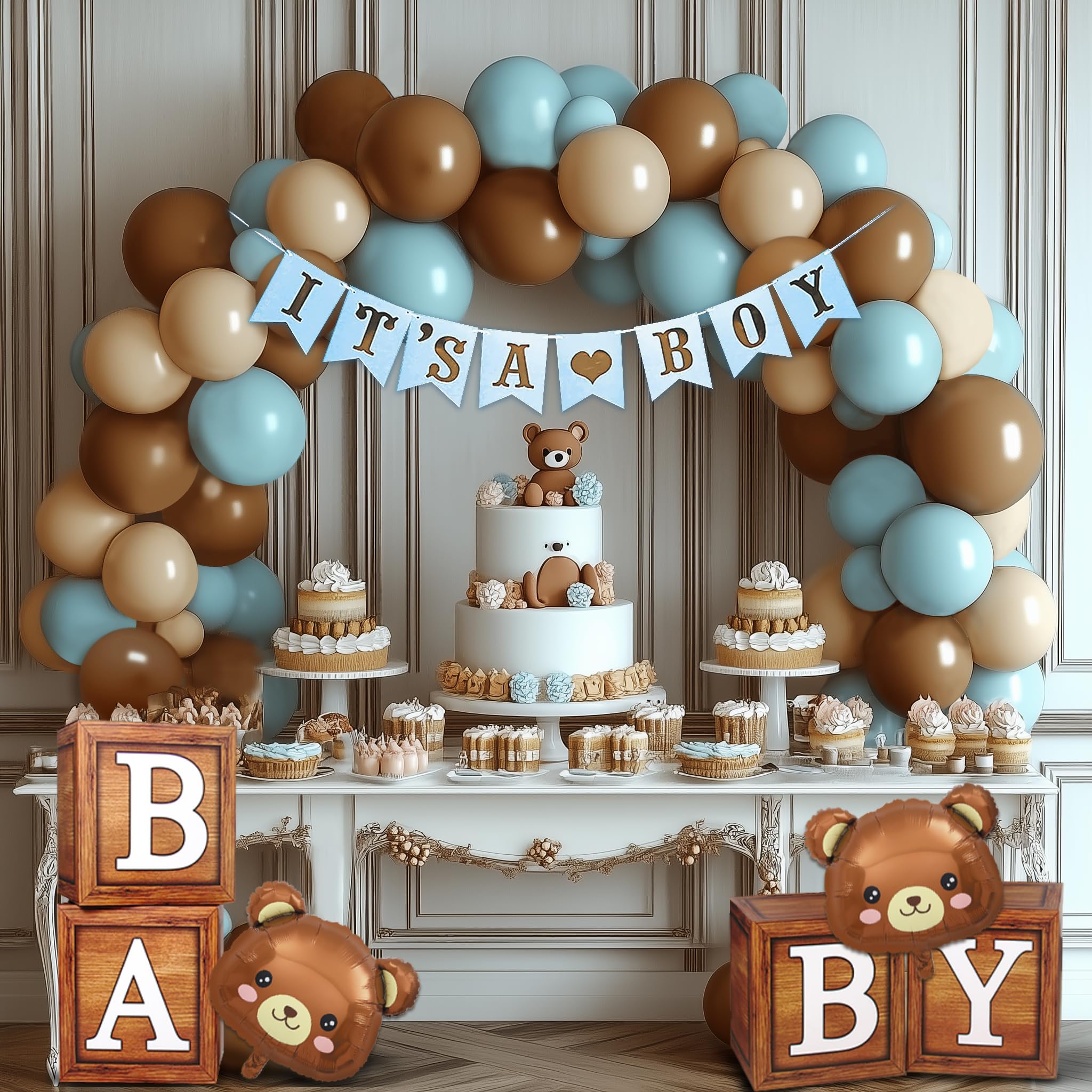 【Package Including】: 40x 12-inch Balloons, 40x 5-inch Balloons, 2 Heart-Shaped Aluminum Foil Balloons, 1 Round Foil Balloon, 2x 3D Sitting Bear Balloons, 1x "BOY" Foil Balloons, 1 PC"MOM TO BE" SASH,1 Set of "IT'S A BOY" Banner, 4 Balloon Boxes,2x 'BABY' Stickers, 1x Backdrop , 1x "DADDY TO BE" BADGE4x "BABY"" STICKERS, 1x Tablecloth (54 inchesx108 inches), 10x Cake Toppers, 1x Balloon Pump, 4 x Accessories