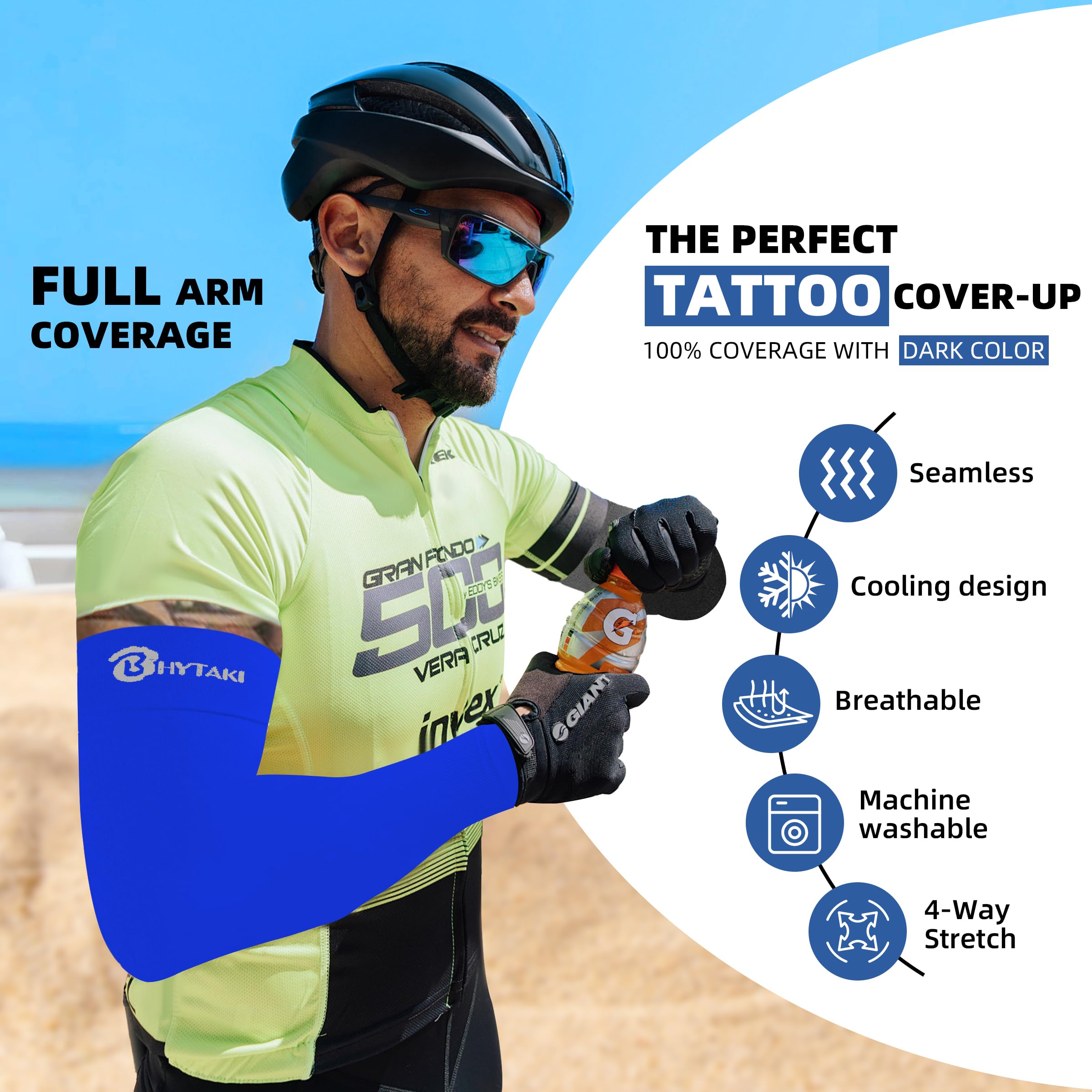 【Many Features】Our arm sleeves for men women are added with anti-UV ingredients, which can truly block ultraviolet rays and prevent skin sunburn and aging. In addition to UPF50+, our compression sleeves also have high elasticity, anti-pilling, covering tattoos, non-fading, moisture-wicking, non-slip, chemical-free,etc. We carefully polish the quality of the compression arm sleeves for men women to create unique BHYTAKI arm sleeves, so that you can use them with peace of mind and satisfaction.