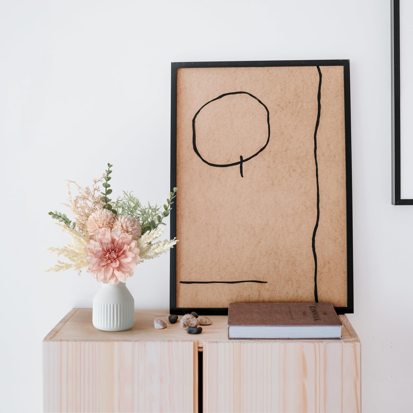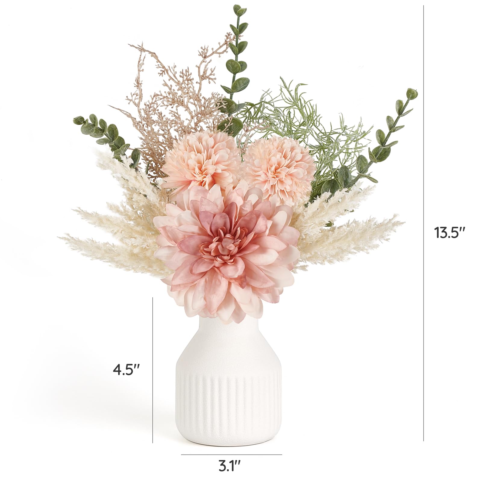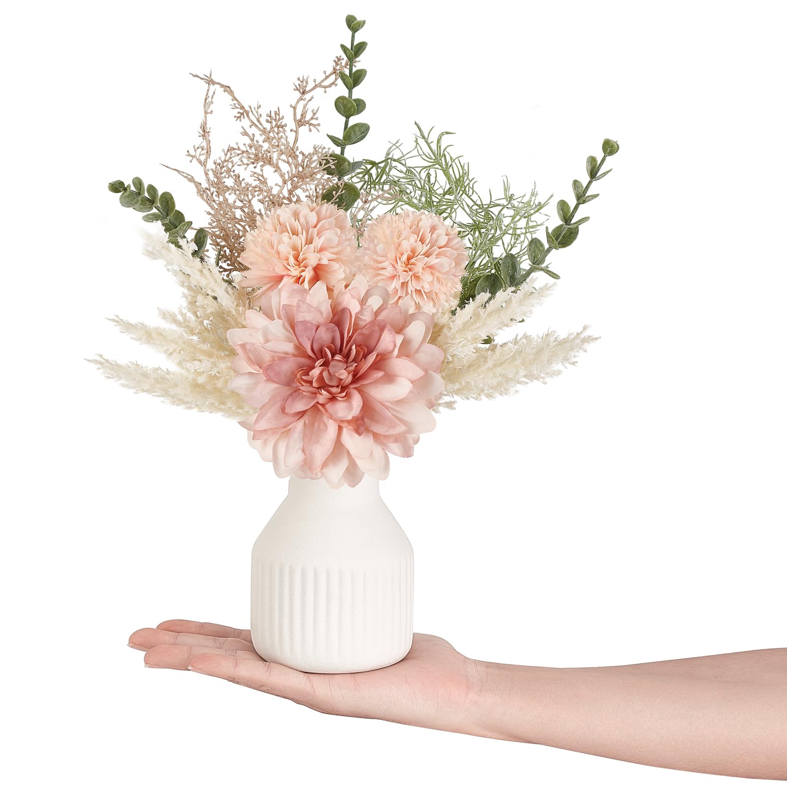 Small Faux Flowers in Vase: The artificial flowers for decoration include fake dahlia, dandelion, eucalyptus plants, and a matte white ceramic vase with vertical stripe. Putting the fake flower bouquet in the vase will create a poetic atmosphere, suitable for table centerpieces, coffee table decor, farmhouse decor, living room decorations