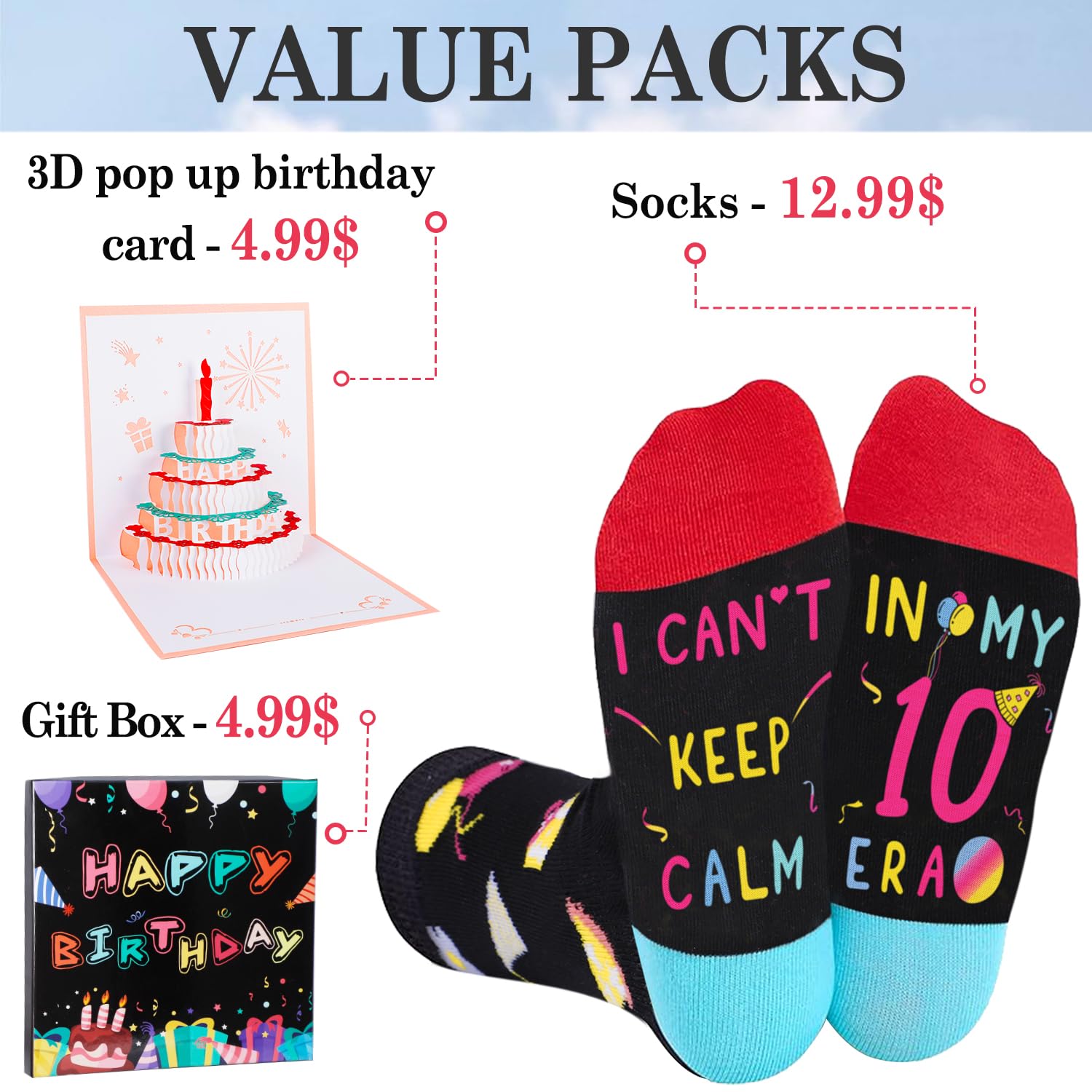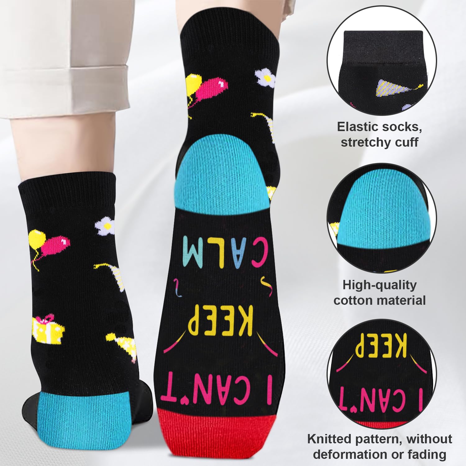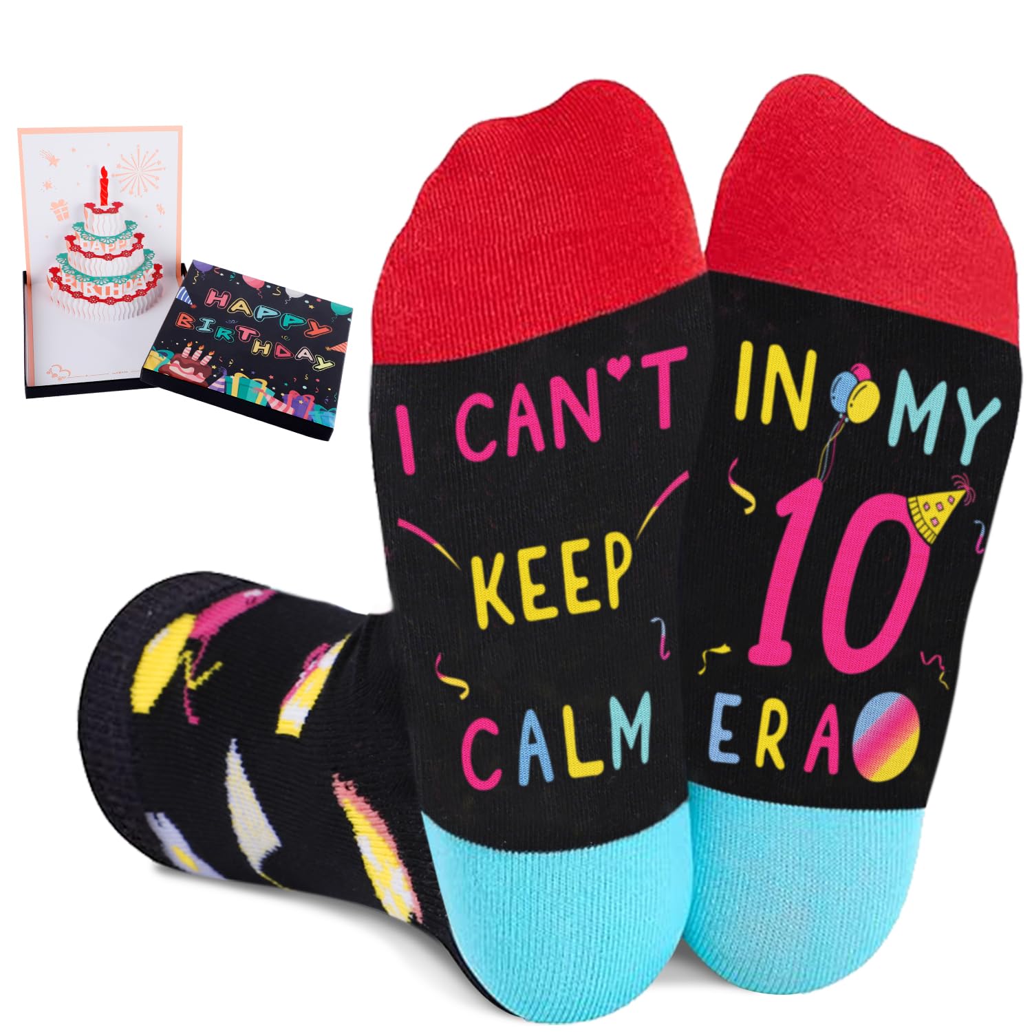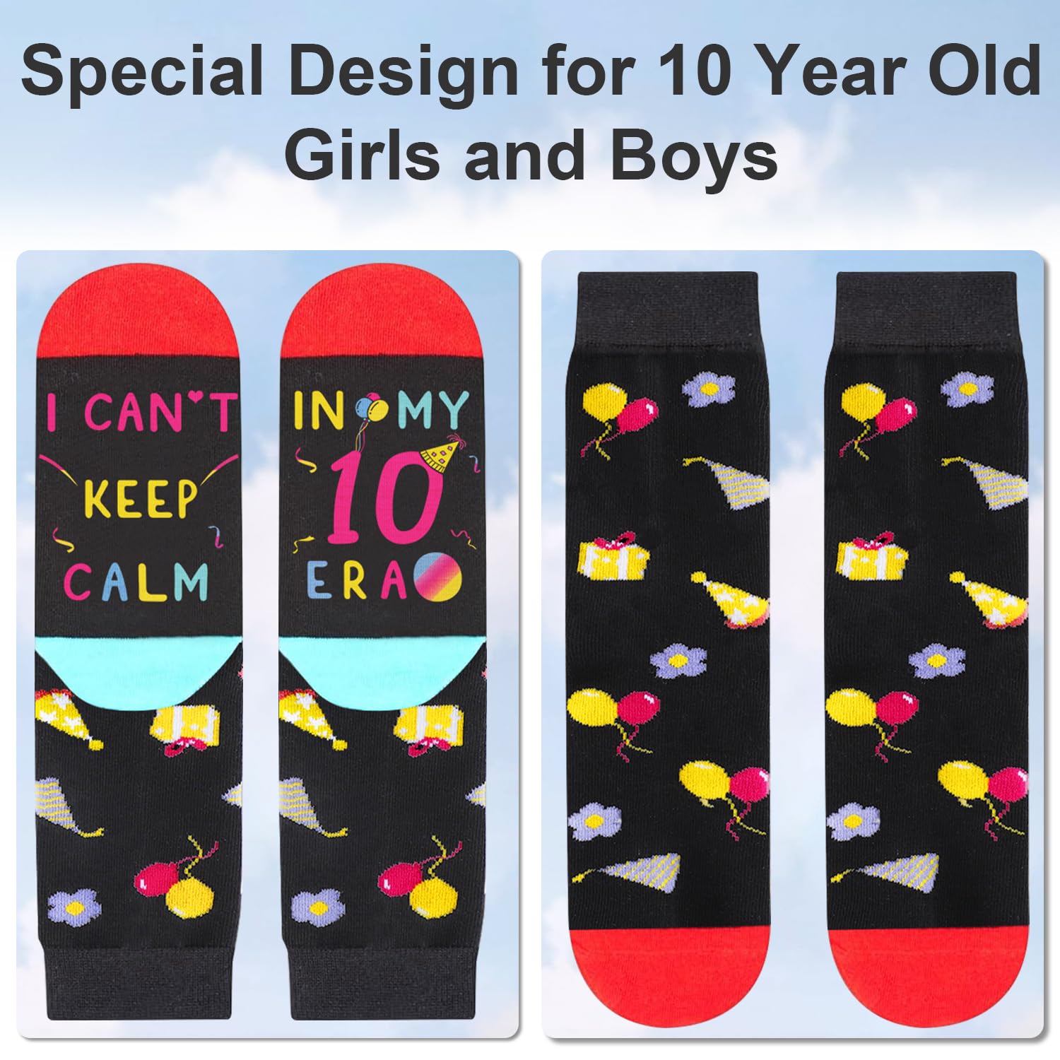 [Socks for 10 Year Old ERA Design] our socks are predominantly black, red, blue, yellow and teal, jacquard birthday gifts, balloons, cakes, and other birthday elements on the top, while the bottom is sewn with a hilarious hidden message: "I CAN’T KEEP CALM, IN MY 10 ERA." the young and energetic design, Suitable for 10th Birthday gifts, Christmas gifts, New Years Gifts or White Elephant gifts