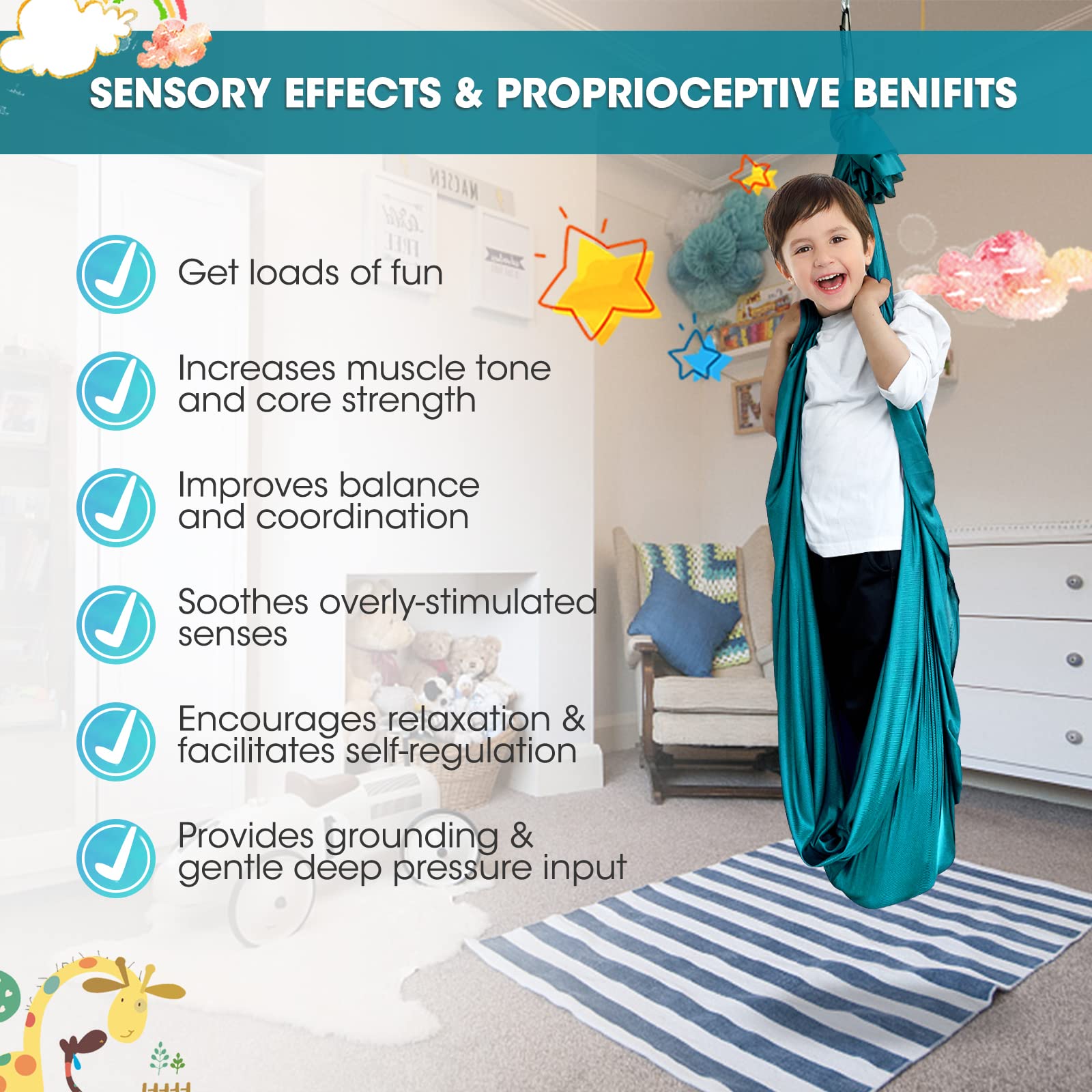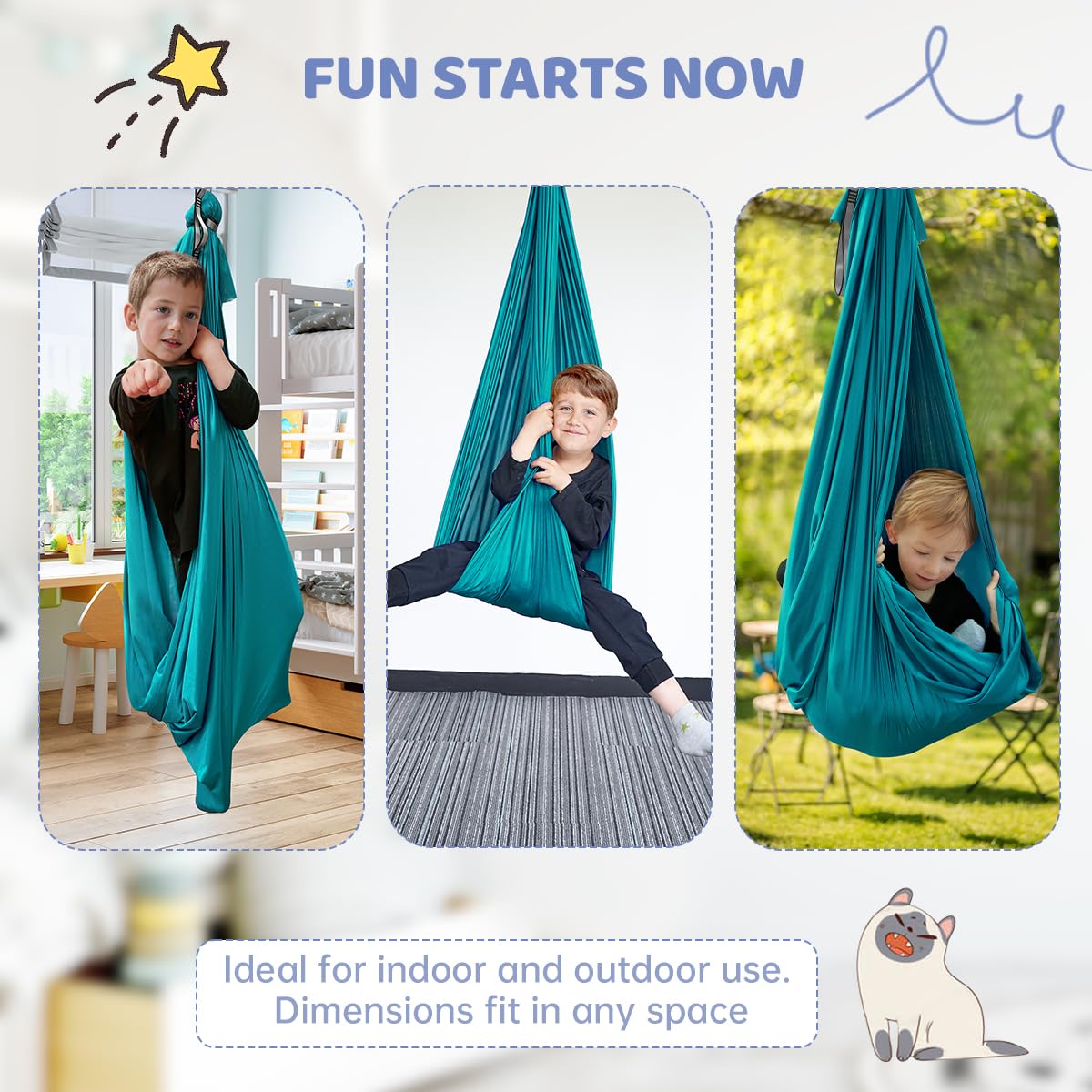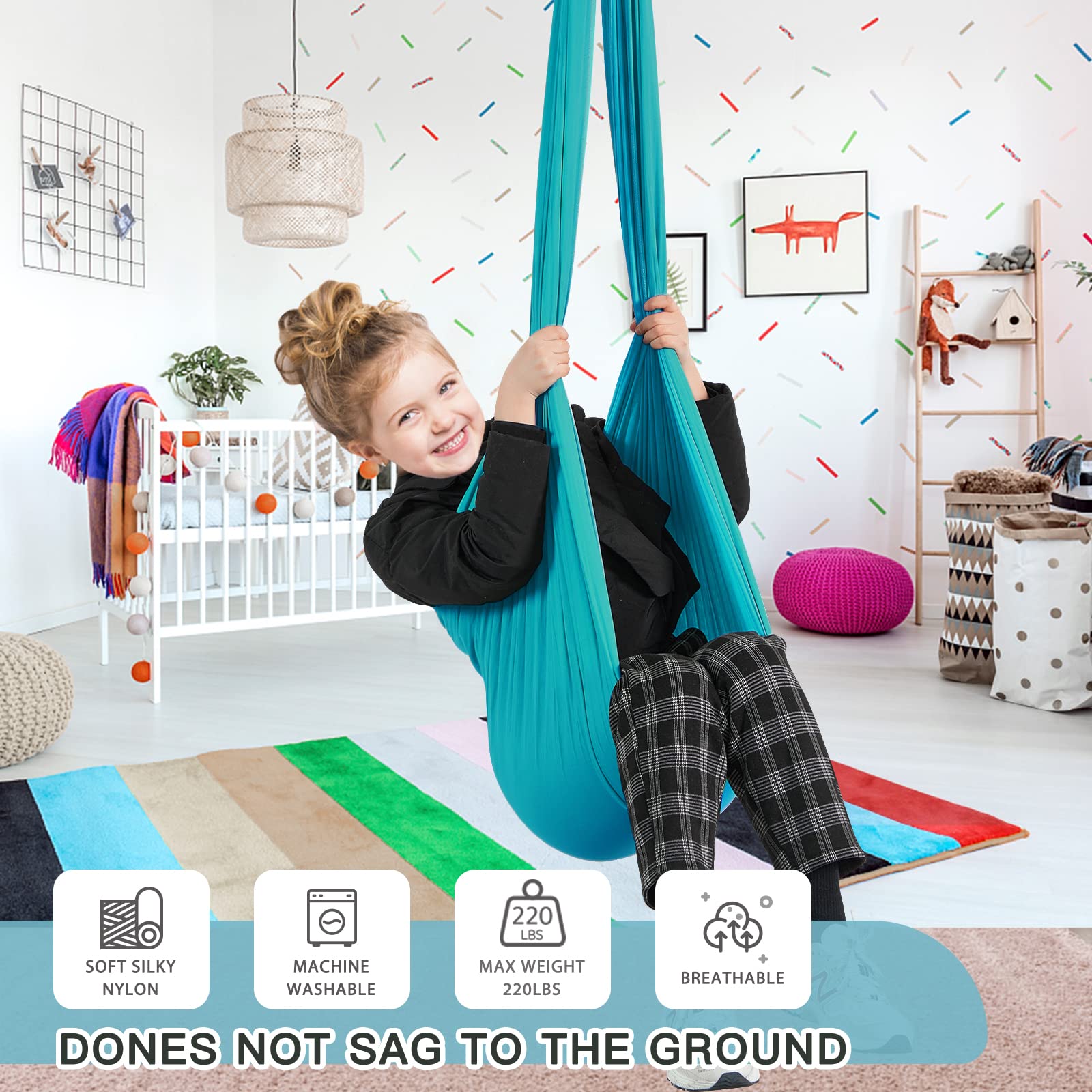 [EASY USE]: No need to purchase extra hardware or figure out complicated pieces. This indoor sensory swing is sent with necessary hardware. The whole swing can be set up within few minutes indoor/outdoor.The daisy chain can adjust the height easily--make hanging simple for kids.(Age: 3~10. Young children should use it under supervision and with help of adults)