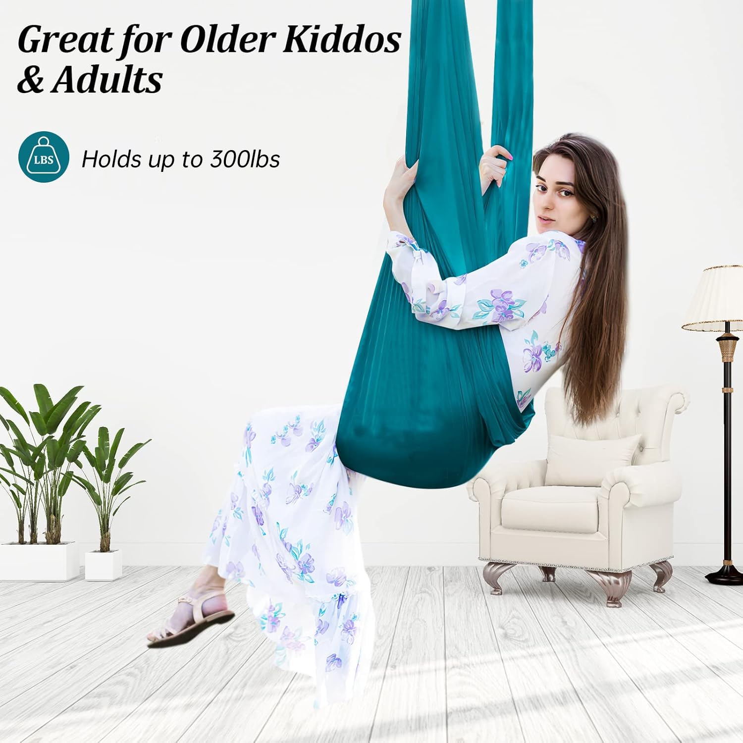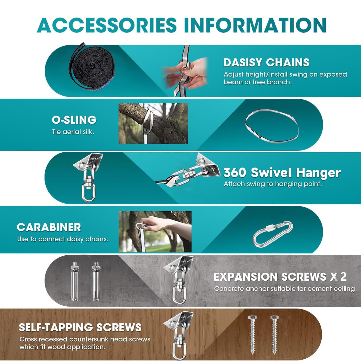 [DURABLE & SAFE]: The therapy swing comes with a nylon hammock swing×1, Multi-loop daisy chains×1, safety carabiner ×1, connecting rope×1, 360° swivel hanger×1, expansion screws x2 and self-tapping screws x2. The hardware and the accessories we provide are durable, max load-bearing capacity is up to 300 lbs.