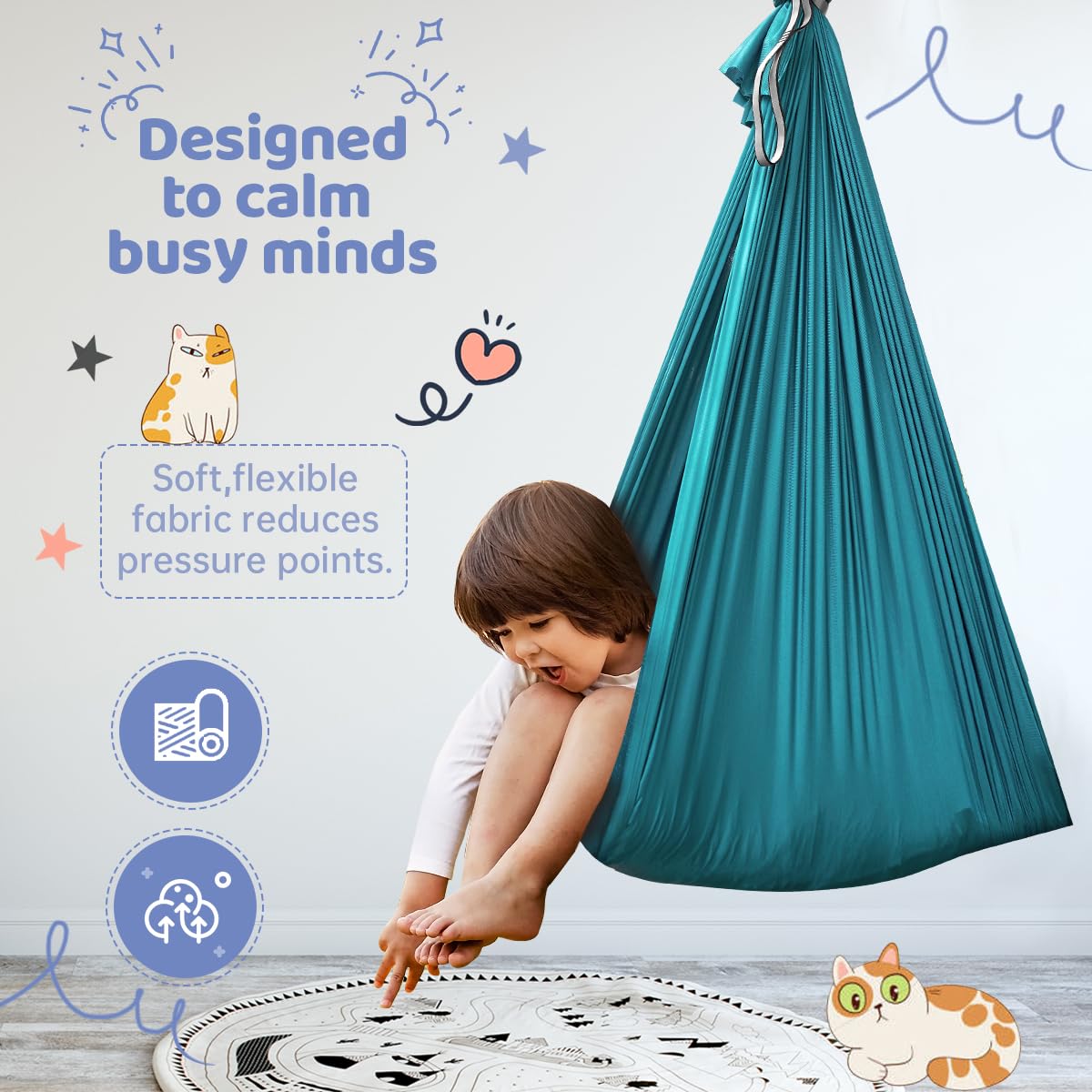 [SOFT SILKY NYLON]: This therapy swing is made of high quality material--soft & silk nylon. It measures 59"L x 59W". Kids can sit and cocoon comfortably in the hammock with a sense of calmness. Our upgrade hammock can block out unwanted sensory stimulation.