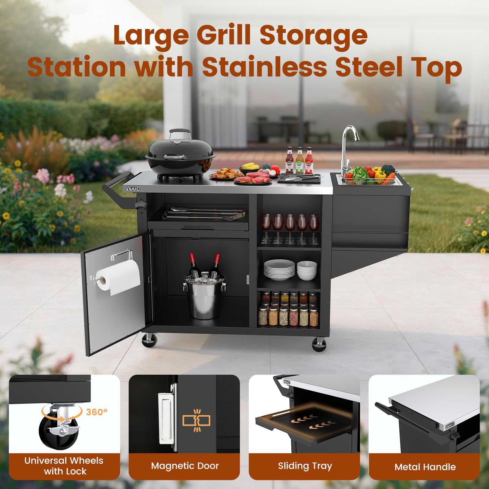 Grill Cart with a Sink and Storage - This cart makes hosting a breeze. It comes with a wide sink (20" x 15") and faucet for easy cleanup, plus a storage cabinet with insulated walls and sliding drawers to keep all your grilling tools and party supplies organized and safe. It's the perfect partner for your backyard barbecues and get-togethers.
