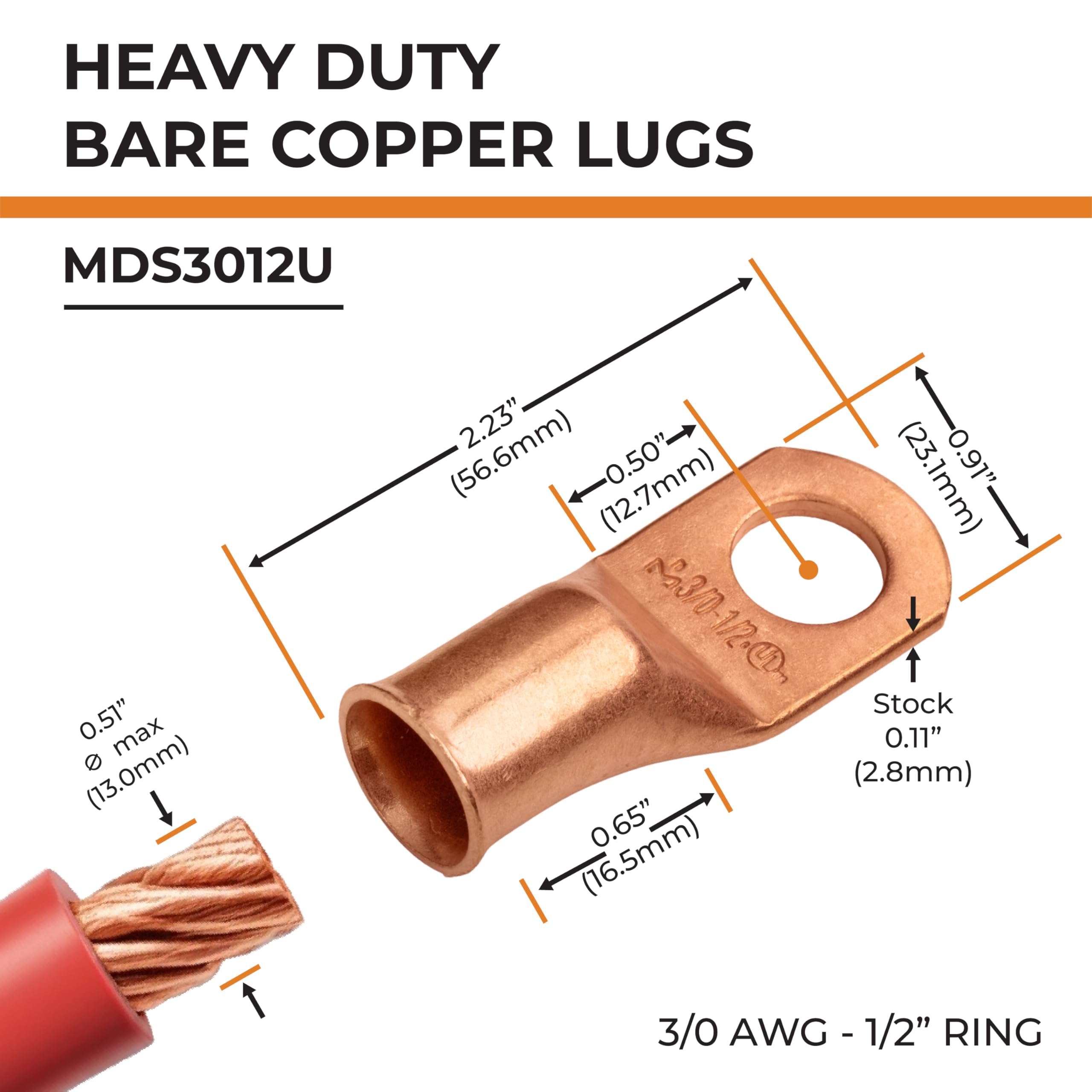 PACKAGE CONTENTS: 5 PCS. of Heavy Duty Bare Copper 000 Gauge (AWG) 1/2" Ring Battery Terminal Connectors / Lugs. 100% annealed copper, providing a high degree of conductivity for maximum current flow when used as battery terminals.