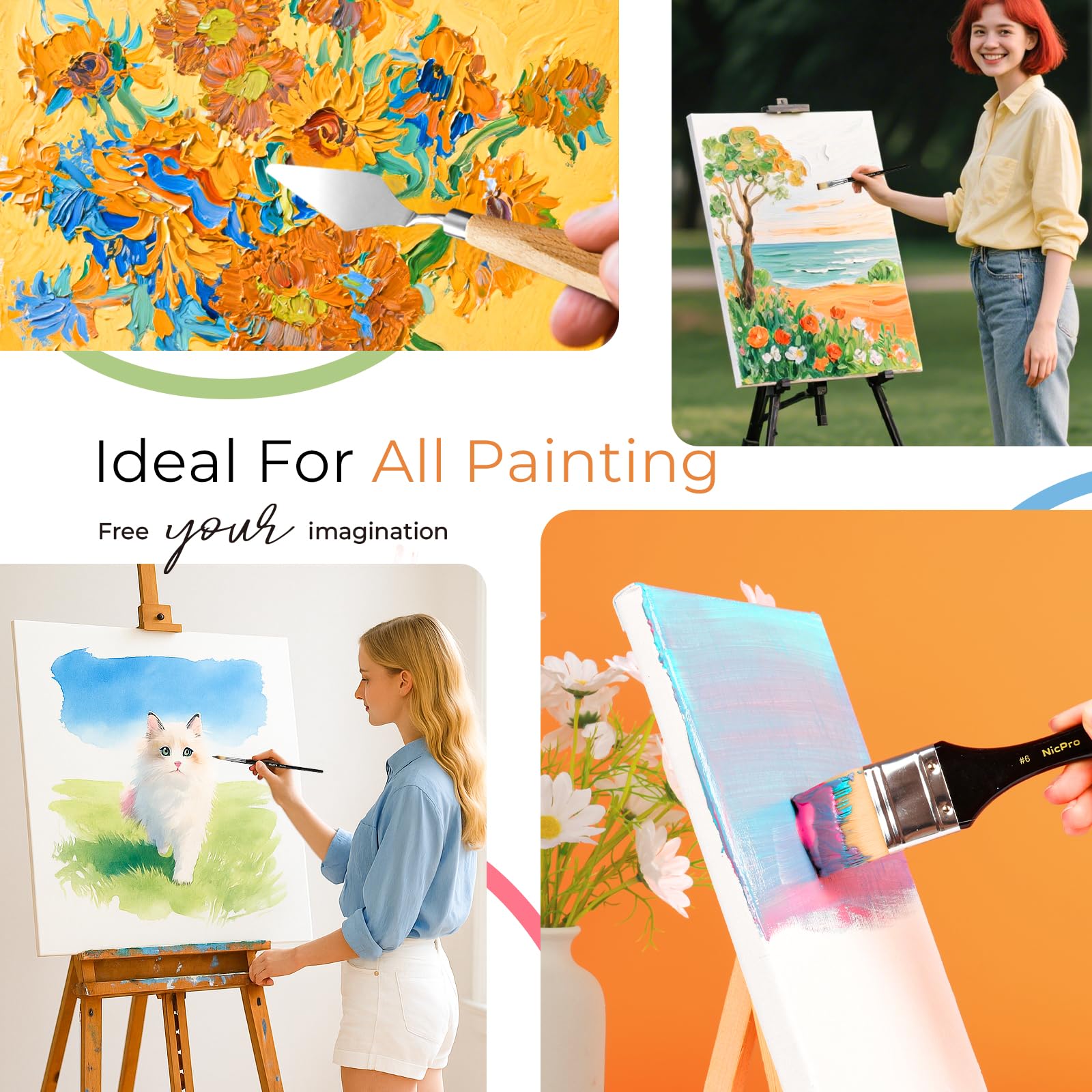 Superior Craftsmanship - Built to Last Through Every Stroke. Each brush features a double-crimped aluminum ferrule and a solid birch wood handle for long-term durability. Ergonomically shaped for comfort, this paint brush set allows full control in long painting sessions and is built to handle frequent use across multiple mediums like acrylic oil and watercolor